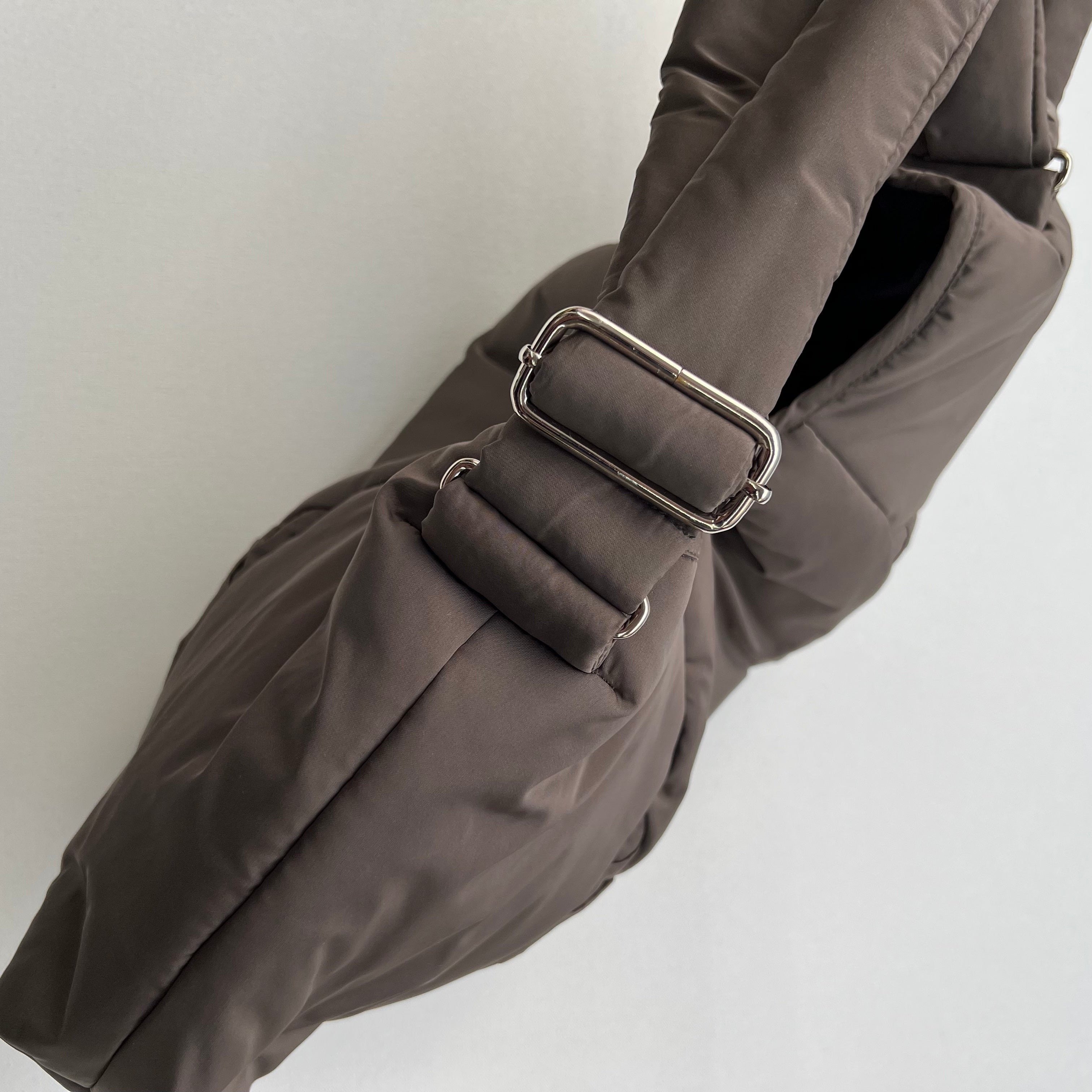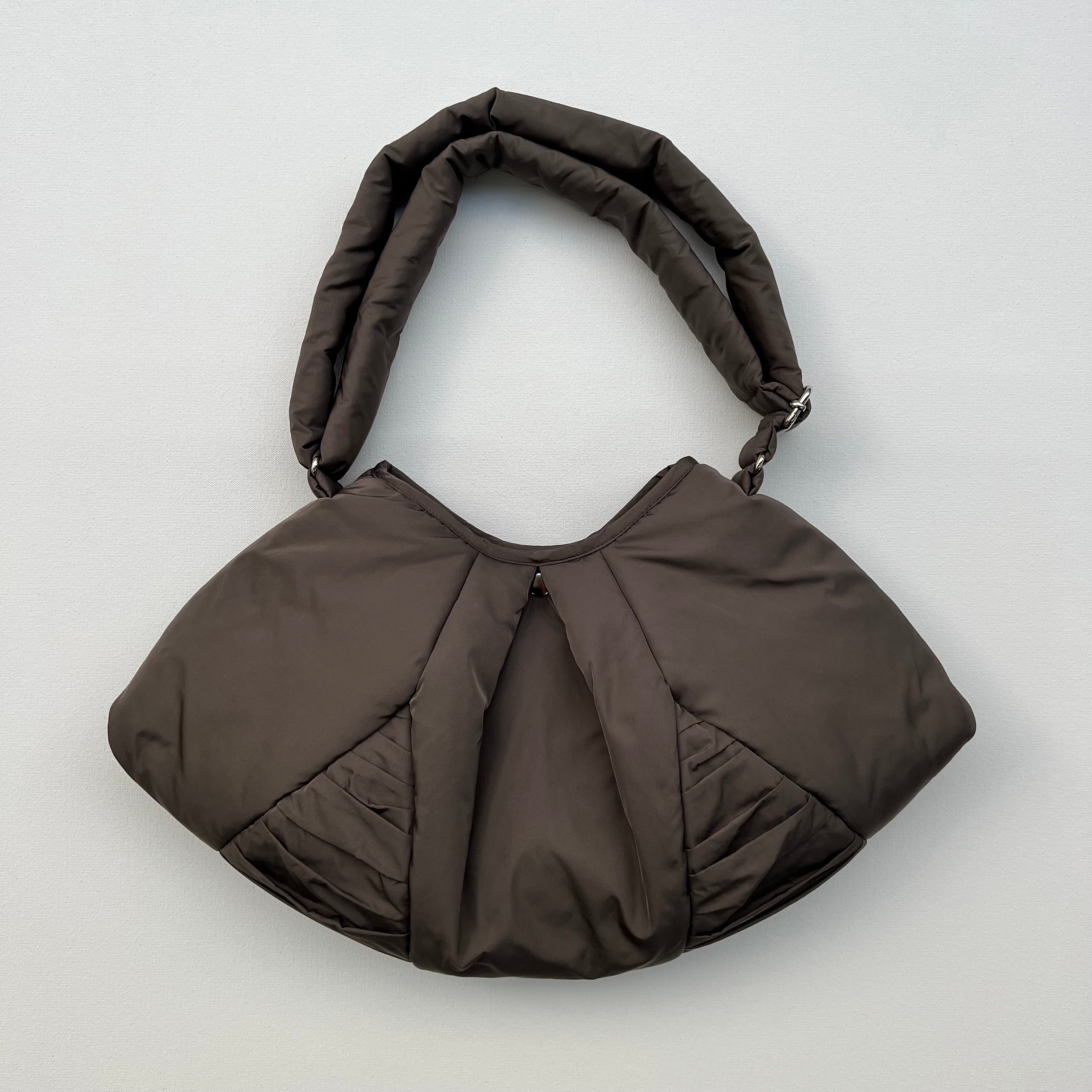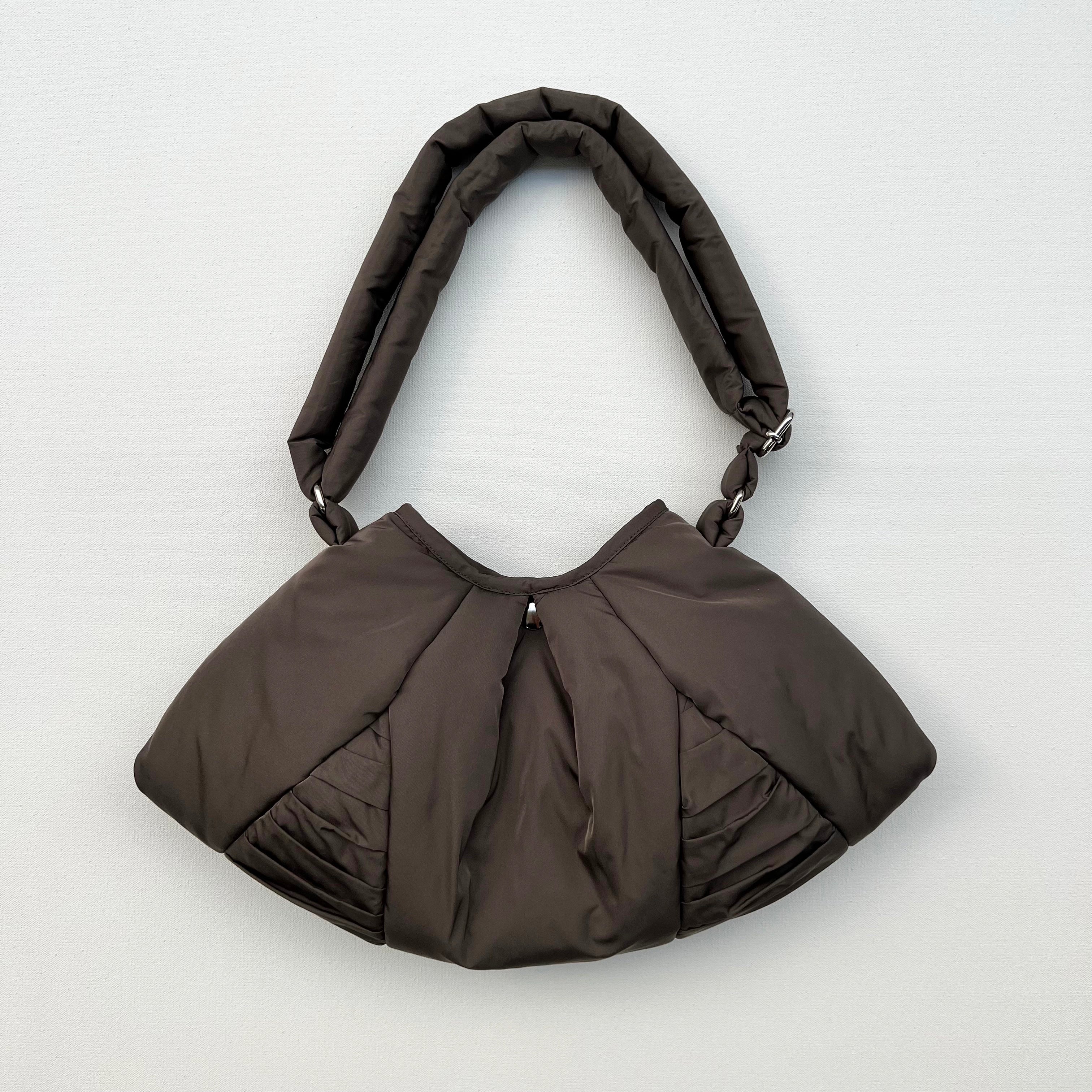 Signature Dumpling Bag, padded with batting for a stuffed appearance. Adjustable straps with silver buckle accommodating both shoulder and crossbody options. Fully lined with interior patch pockets and metal snap button closure.
