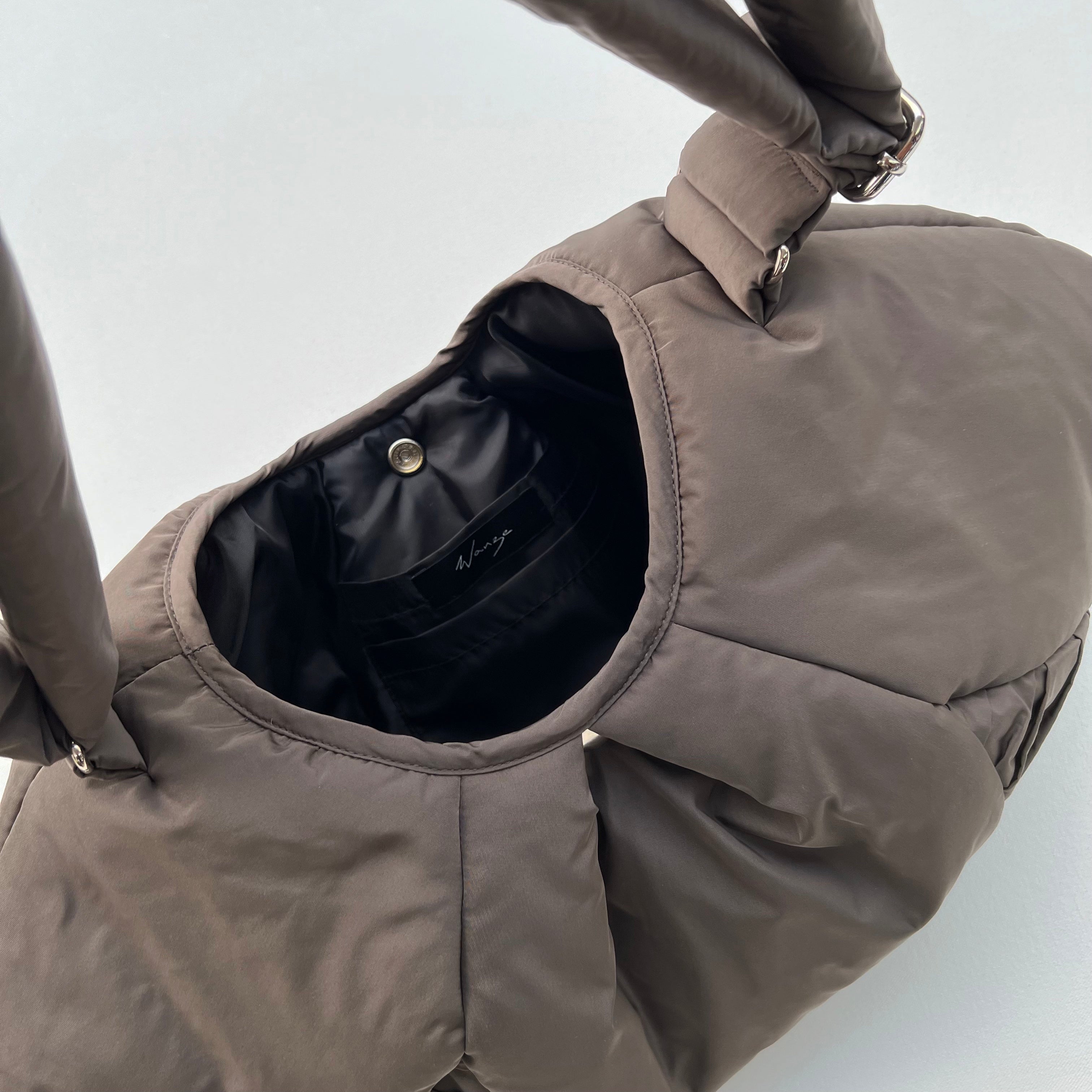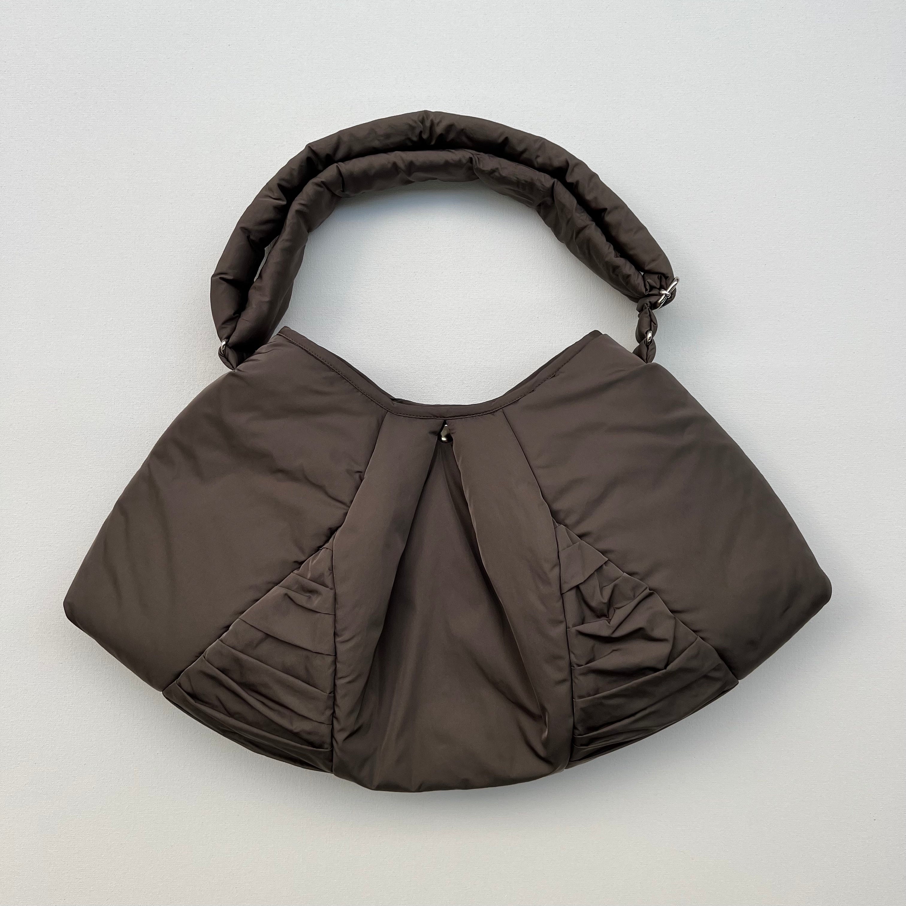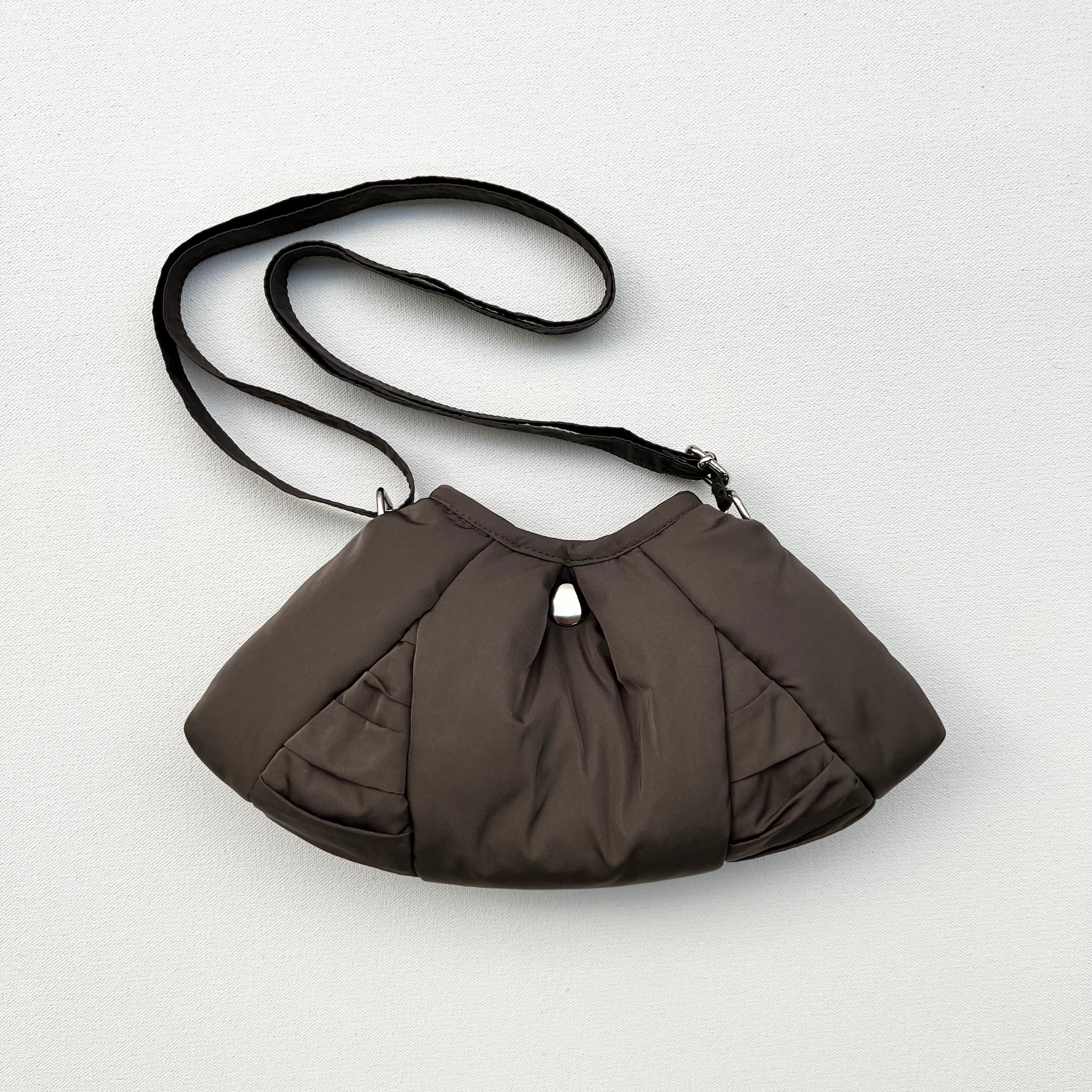 Signature Dumpling Bag, padded with batting for a stuffed appearance. Adjustable straps with silver buckle accommodating both shoulder and crossbody options. Fully lined with interior patch pockets and metal snap button closure.