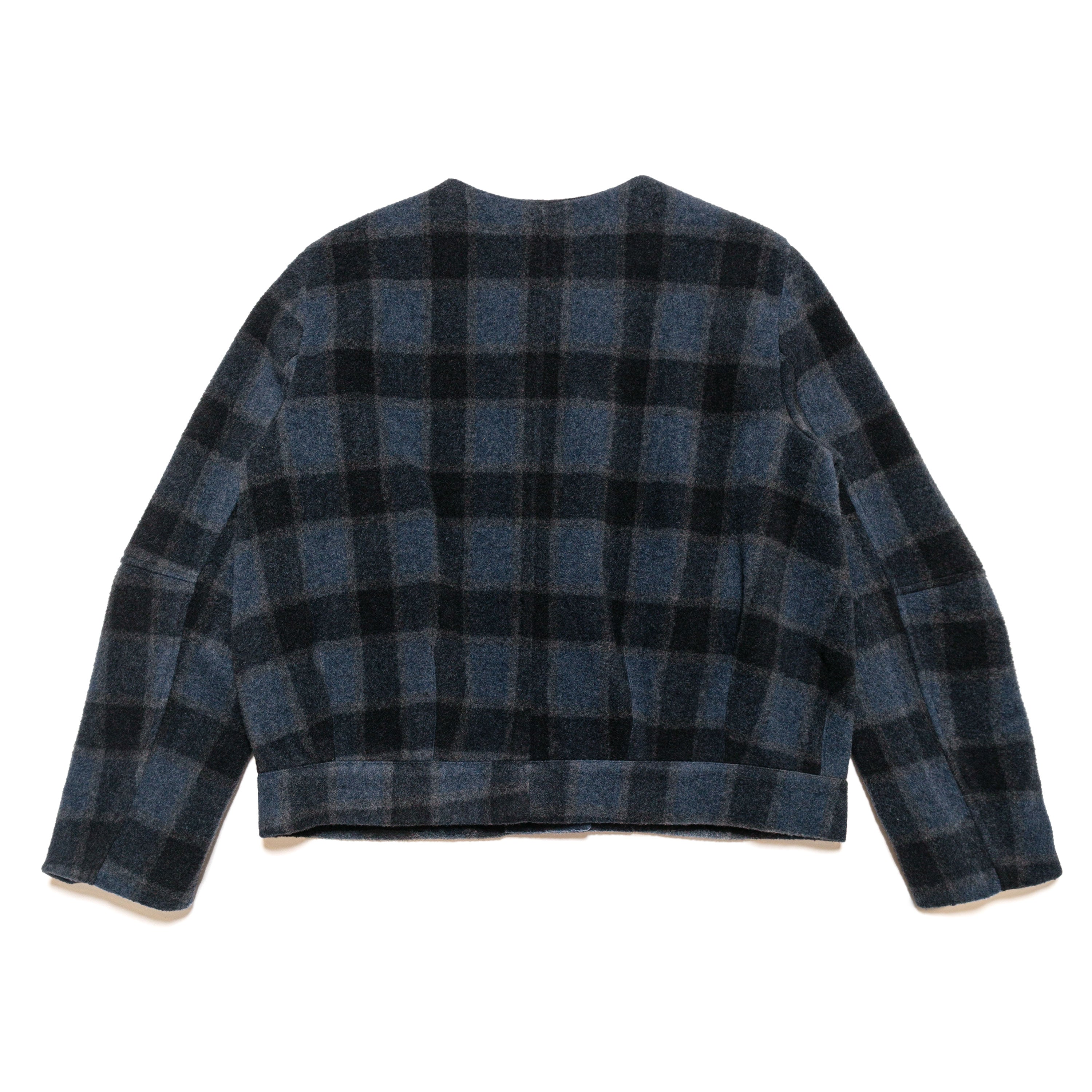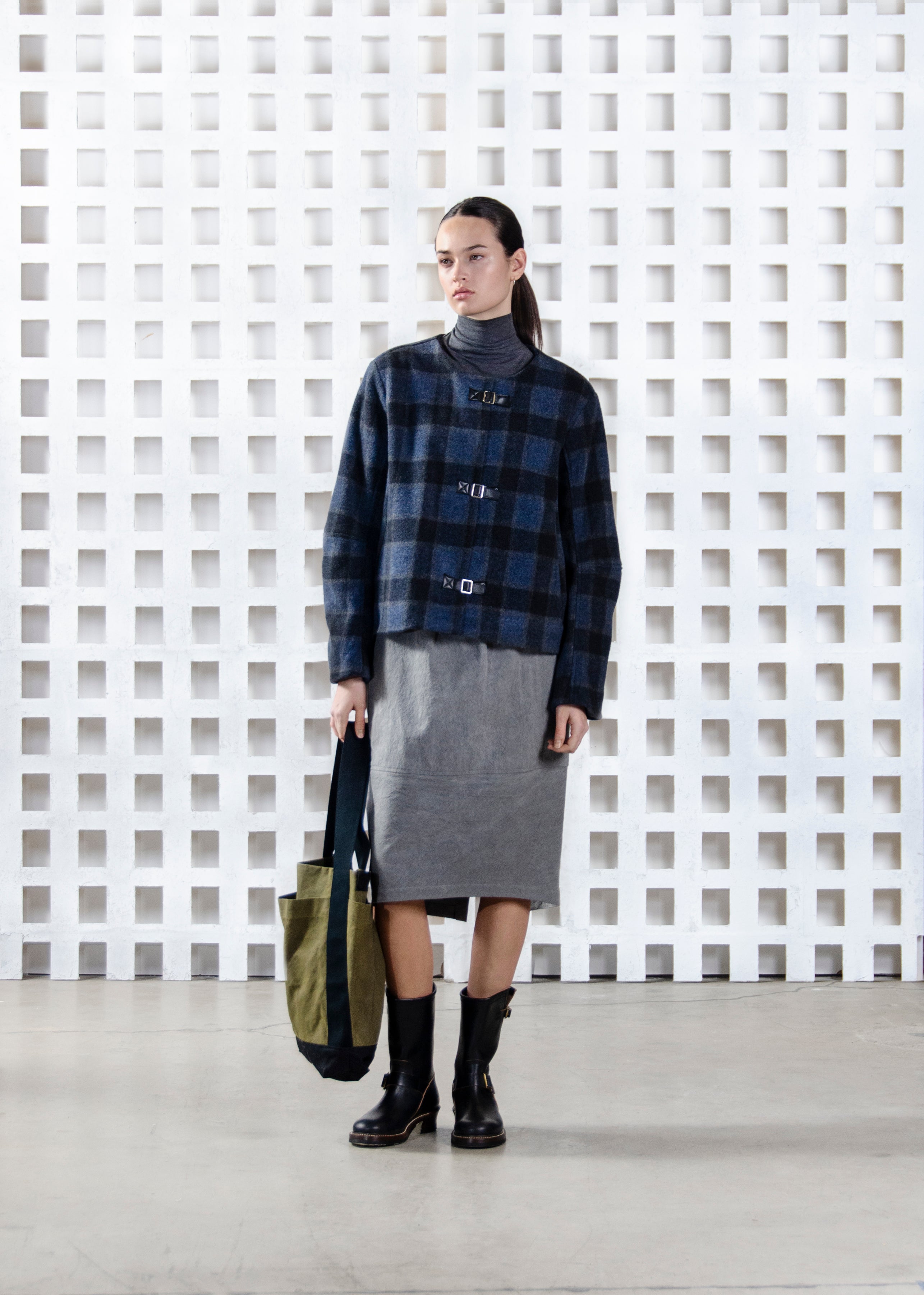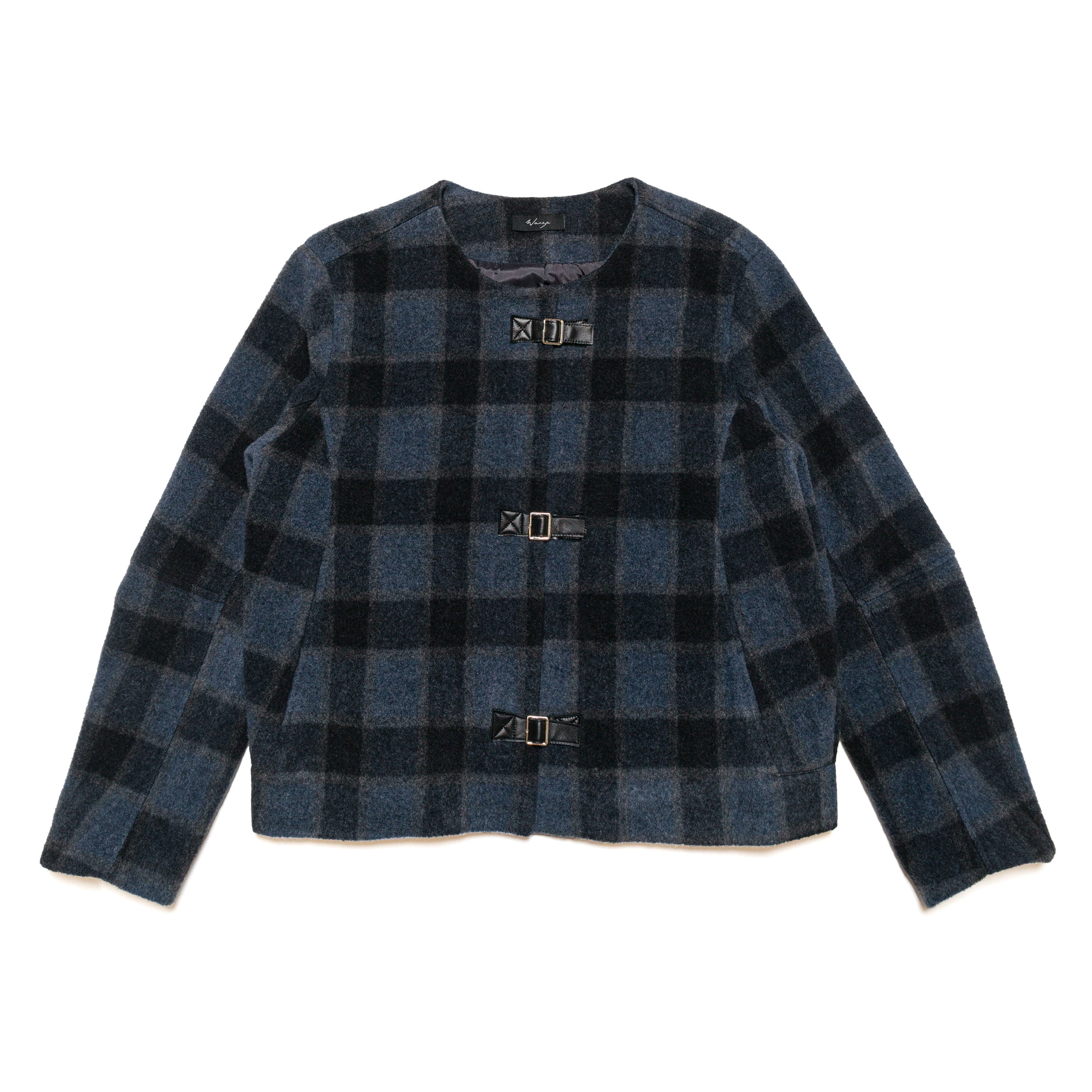 This collarless jacket has a round neckline and offers a relaxed fit. Featuring inseam pockets at the front and three leather buckle closures for a sleek look. Darts along the hem create subtle volume at the back, while panelling at the sleeves follows the natural curve of the arm. Fully lined in Bemberg.