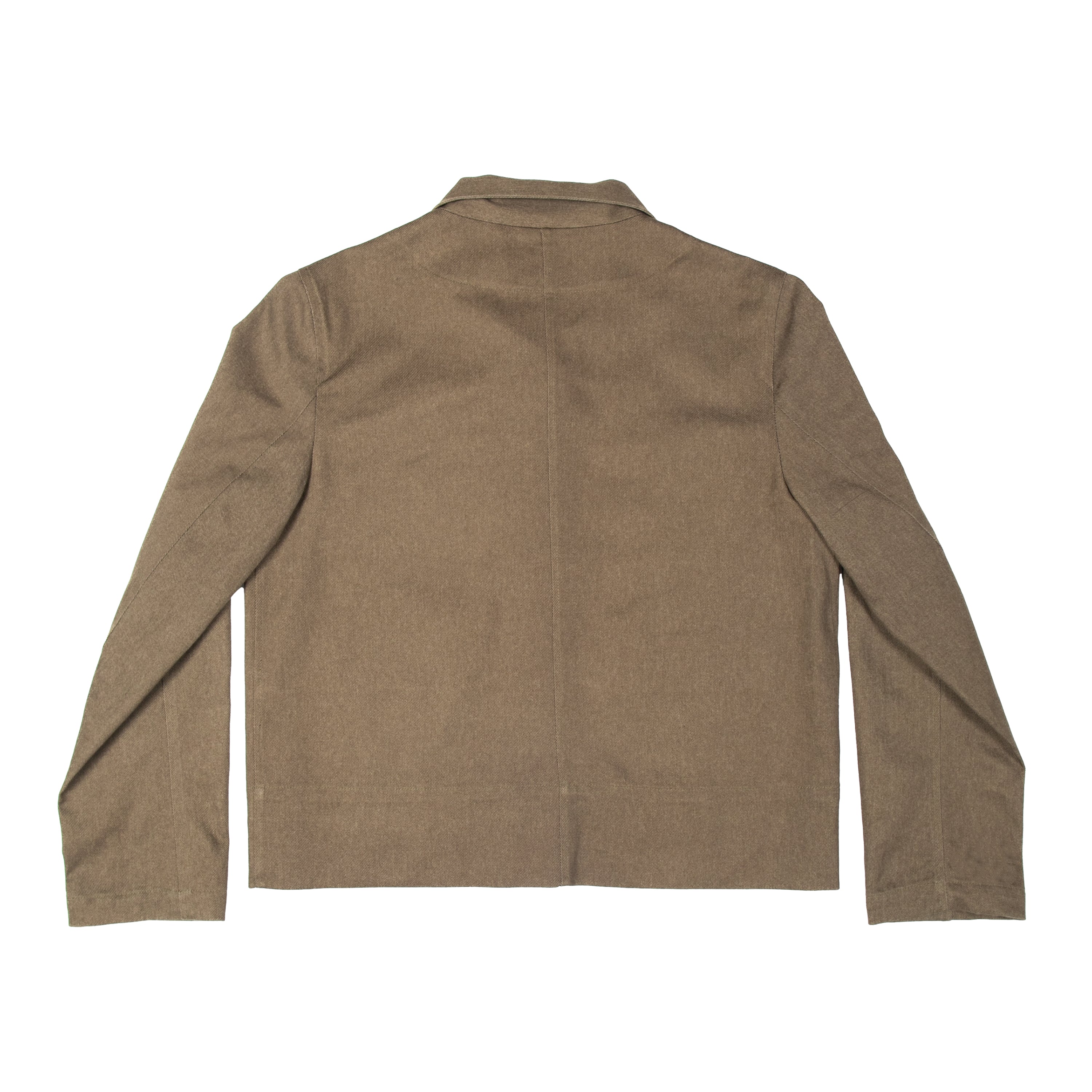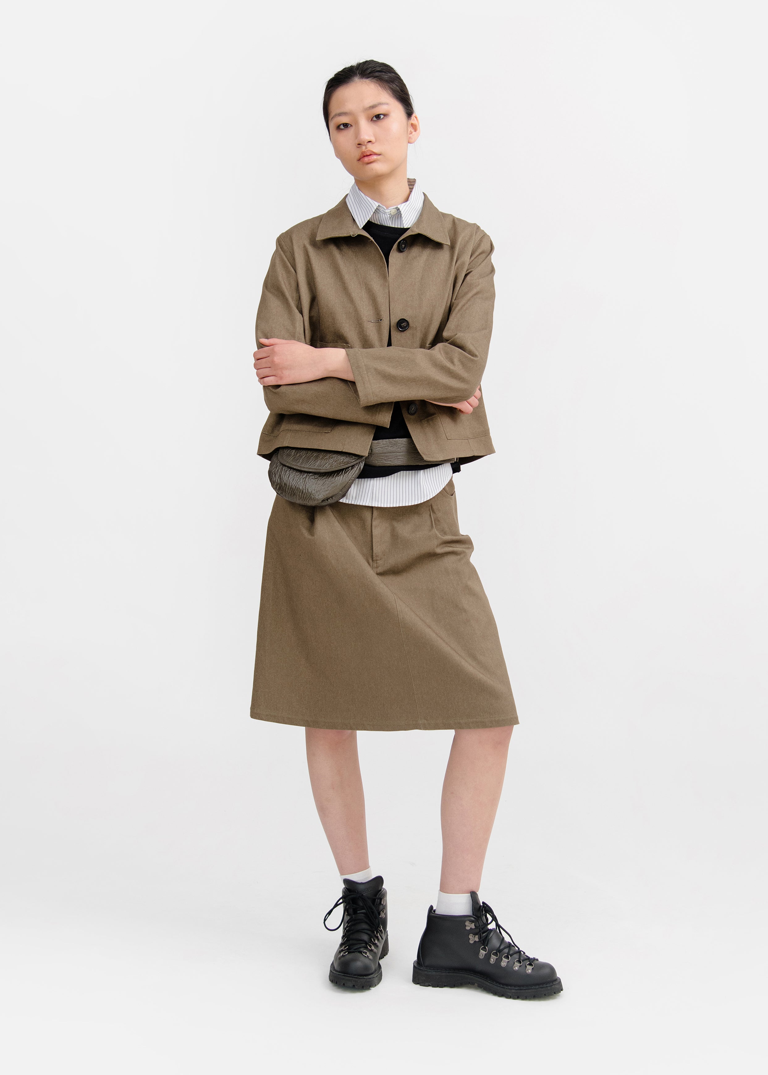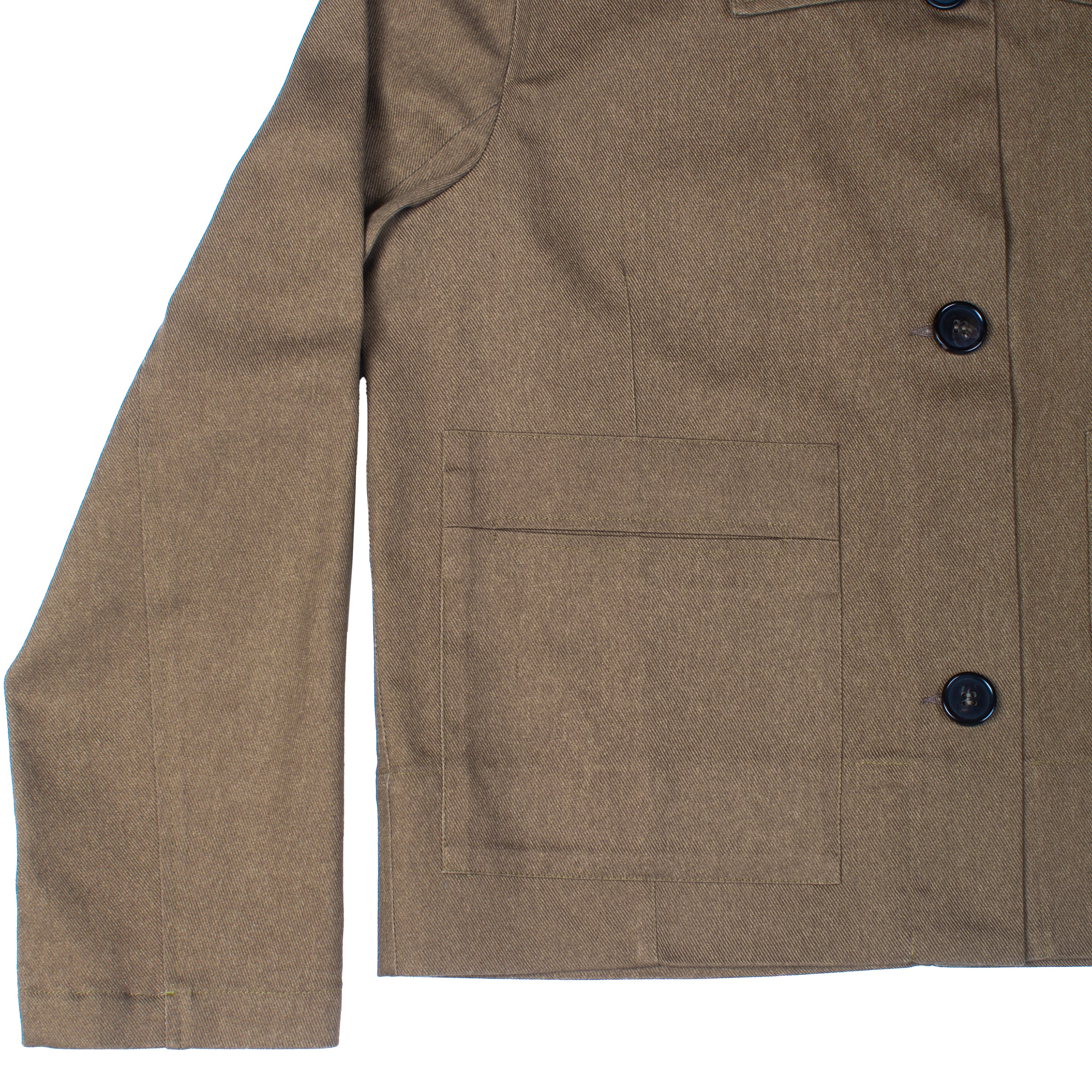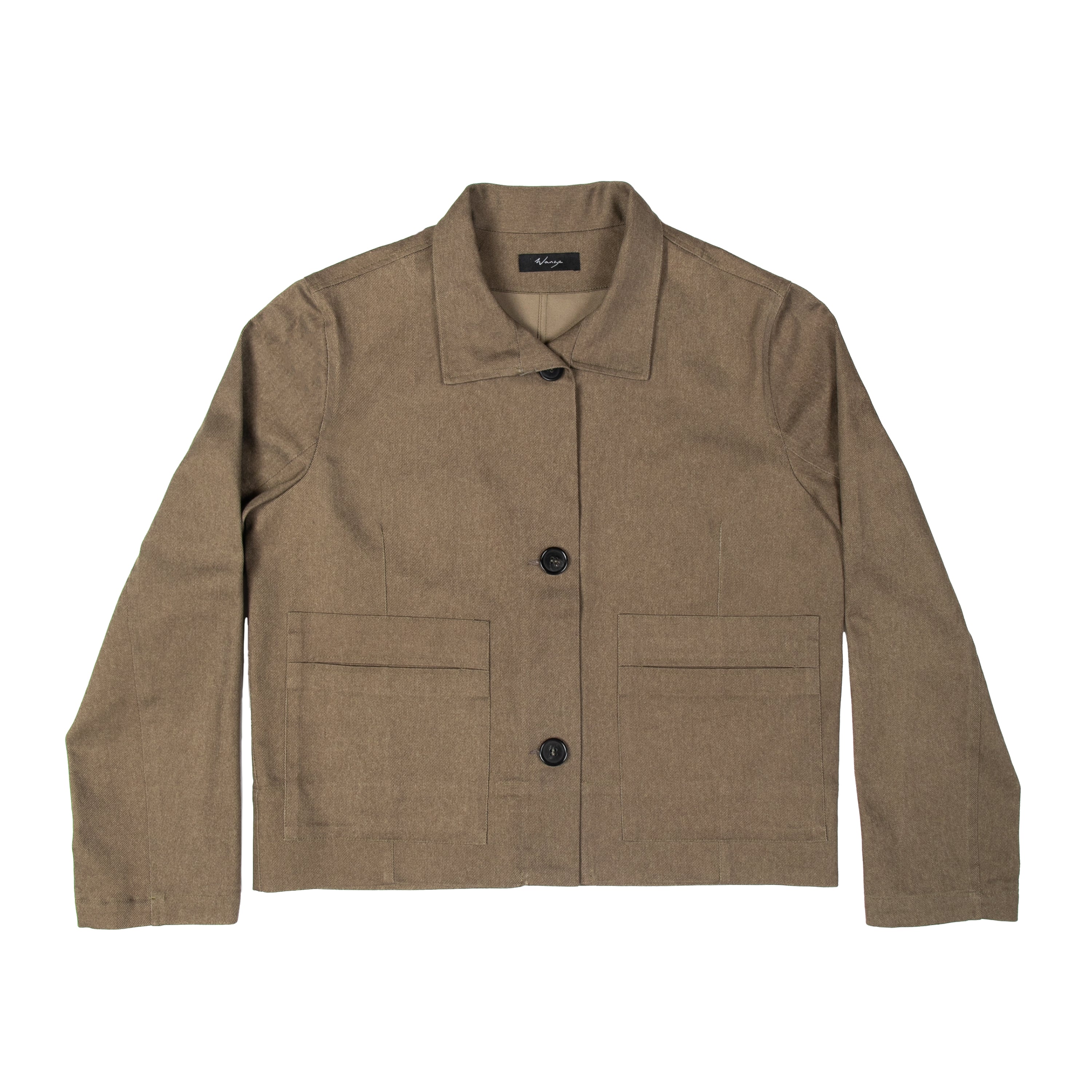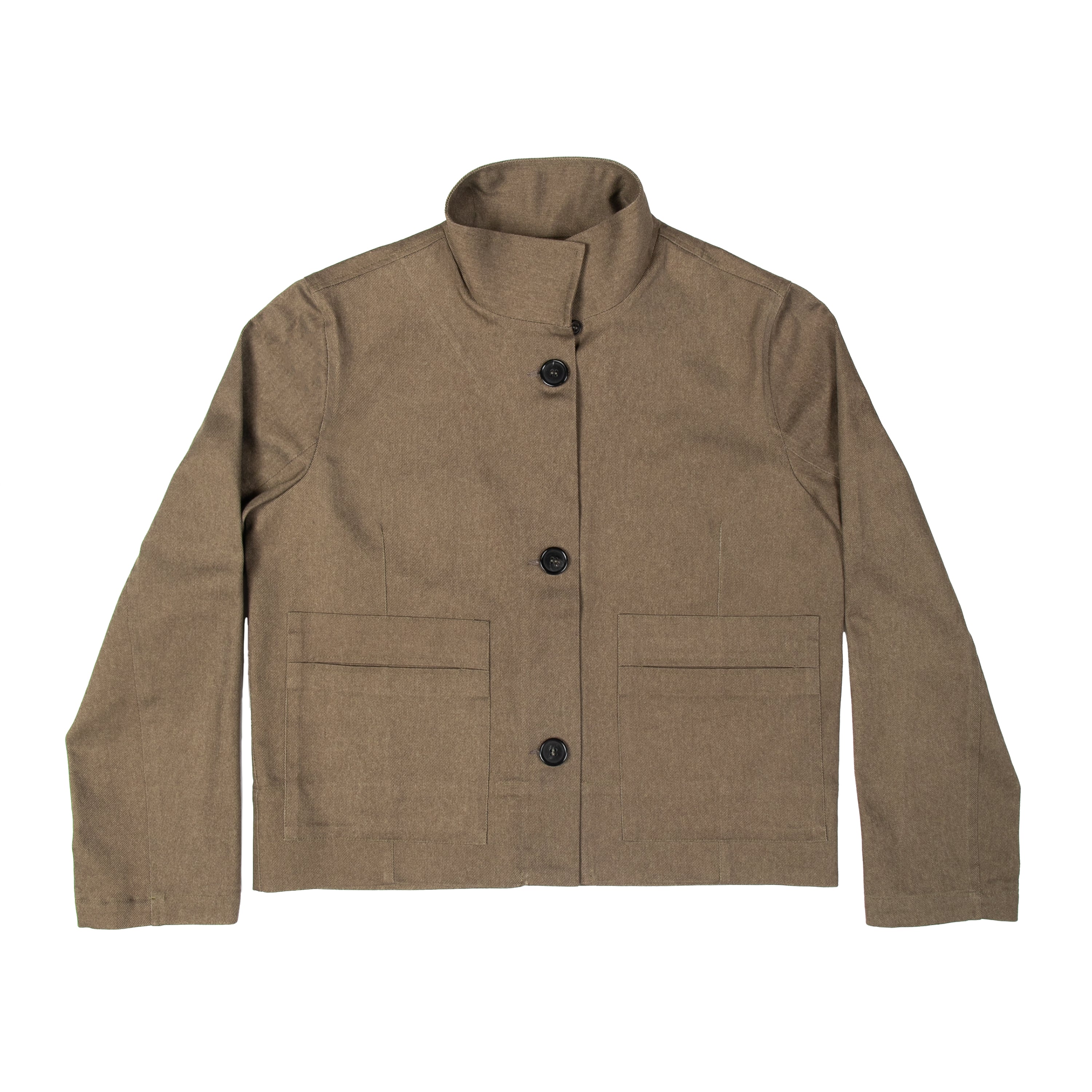 Taking inspiration from traditional work jackets, this style offers a cropped and boxy fit, high collar stand and large patch pockets with an imitated welt pocket opening. Dart detailing on the front and back hem for subtle shaping and button closure.
