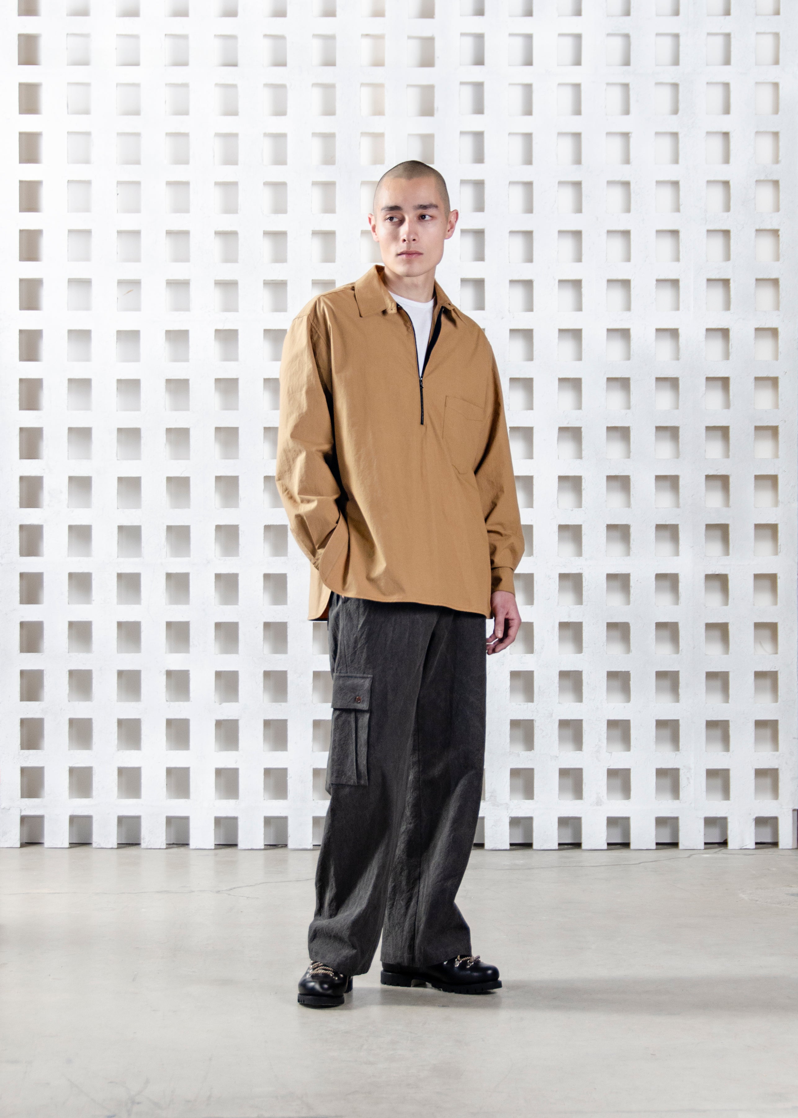 Made in a Japanese cotton linen ramie, the fabric is pre-washed to create a worn, papery texture with a natural drape. Easy to wear, this piece will soften with time.