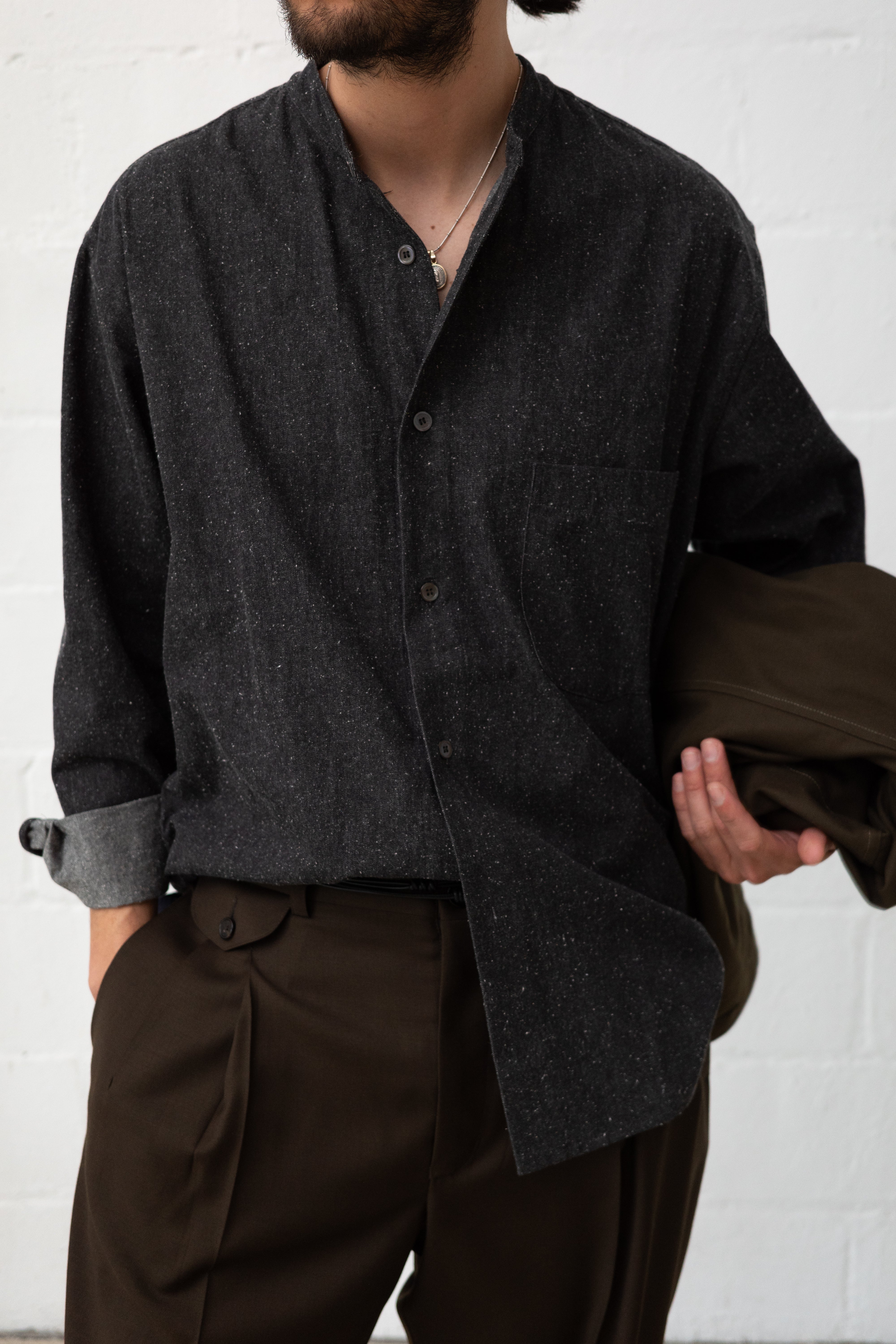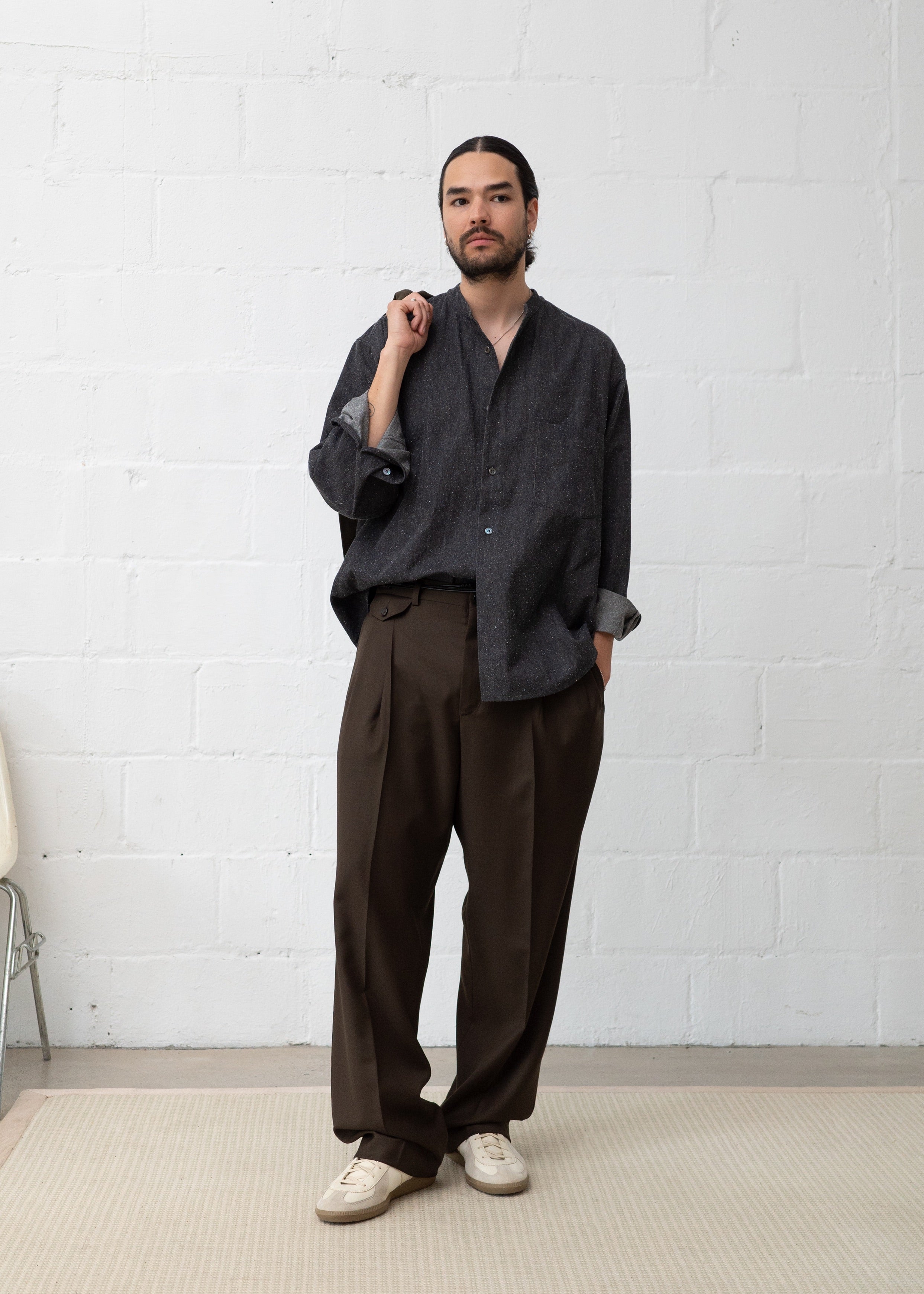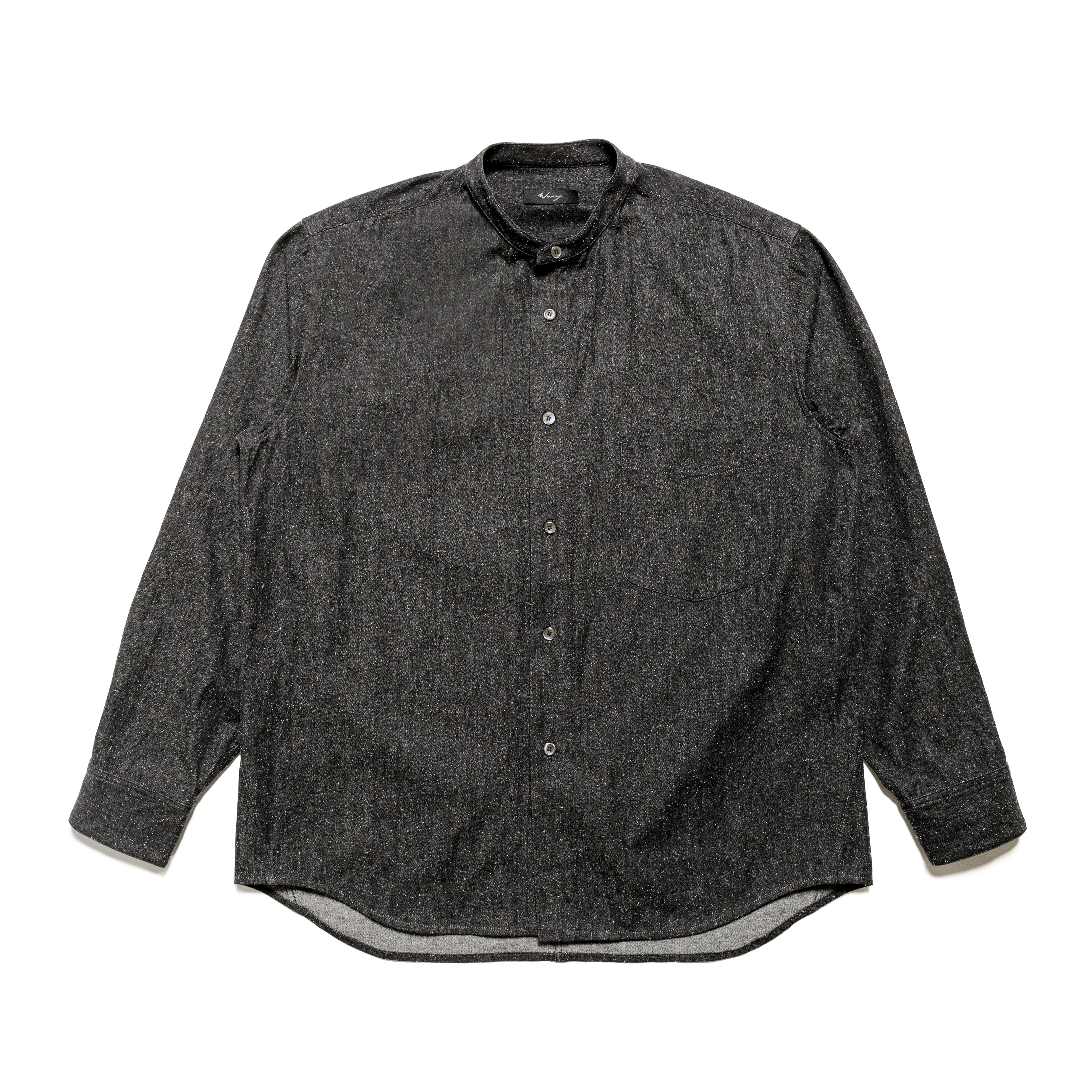 Casual and understated, this button up offers a relaxed fit. With a focus on details, this shirt features a mandarin collar, front chest pocket, and subtle godets at the sides. Mother of pearl buttons add a luxe finish at the front placket and sleeve cuffs.