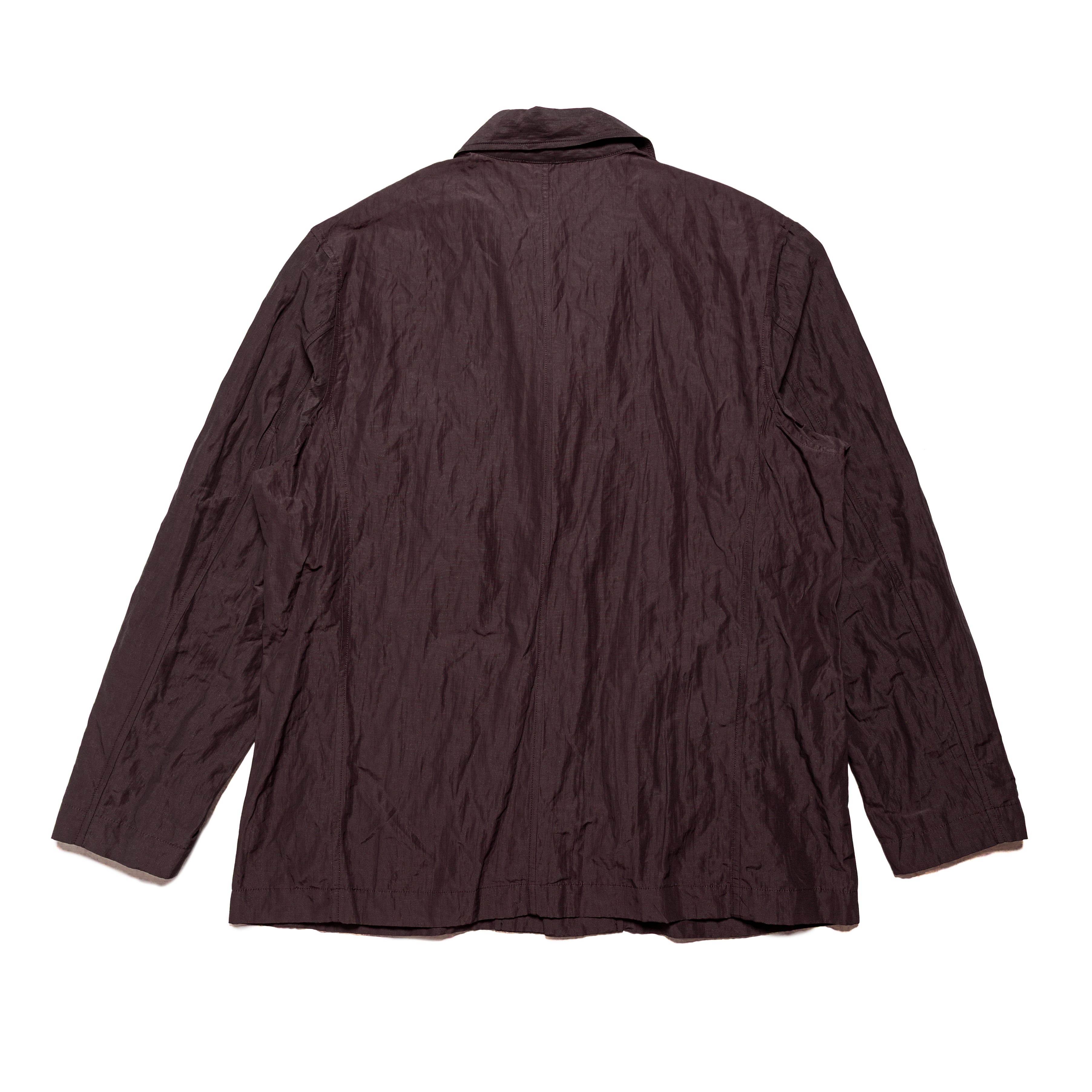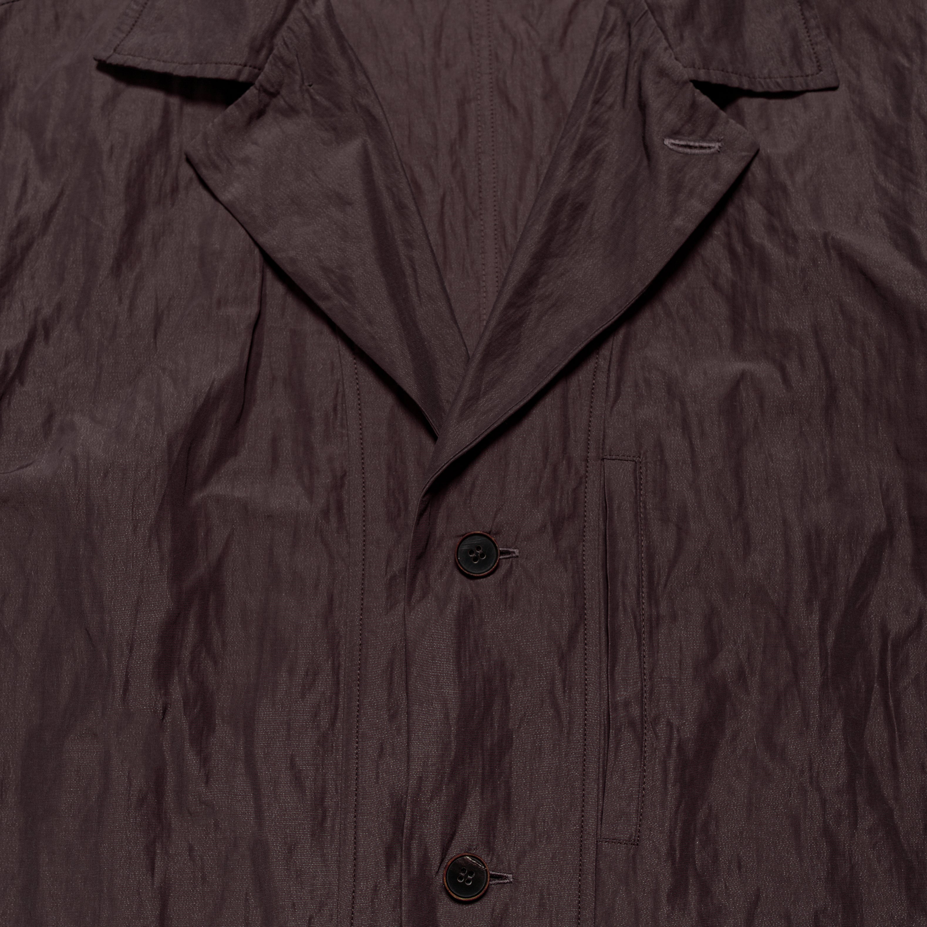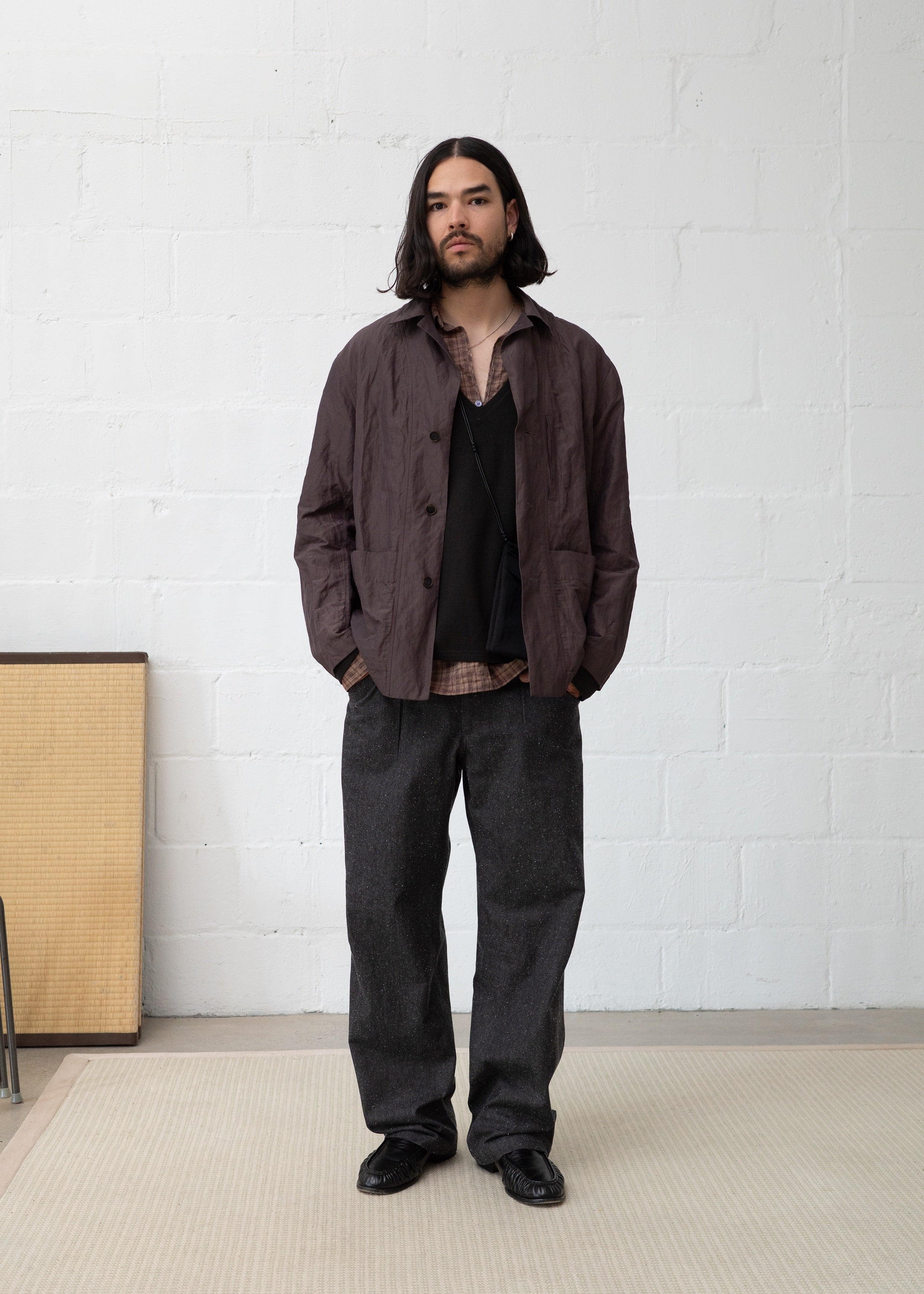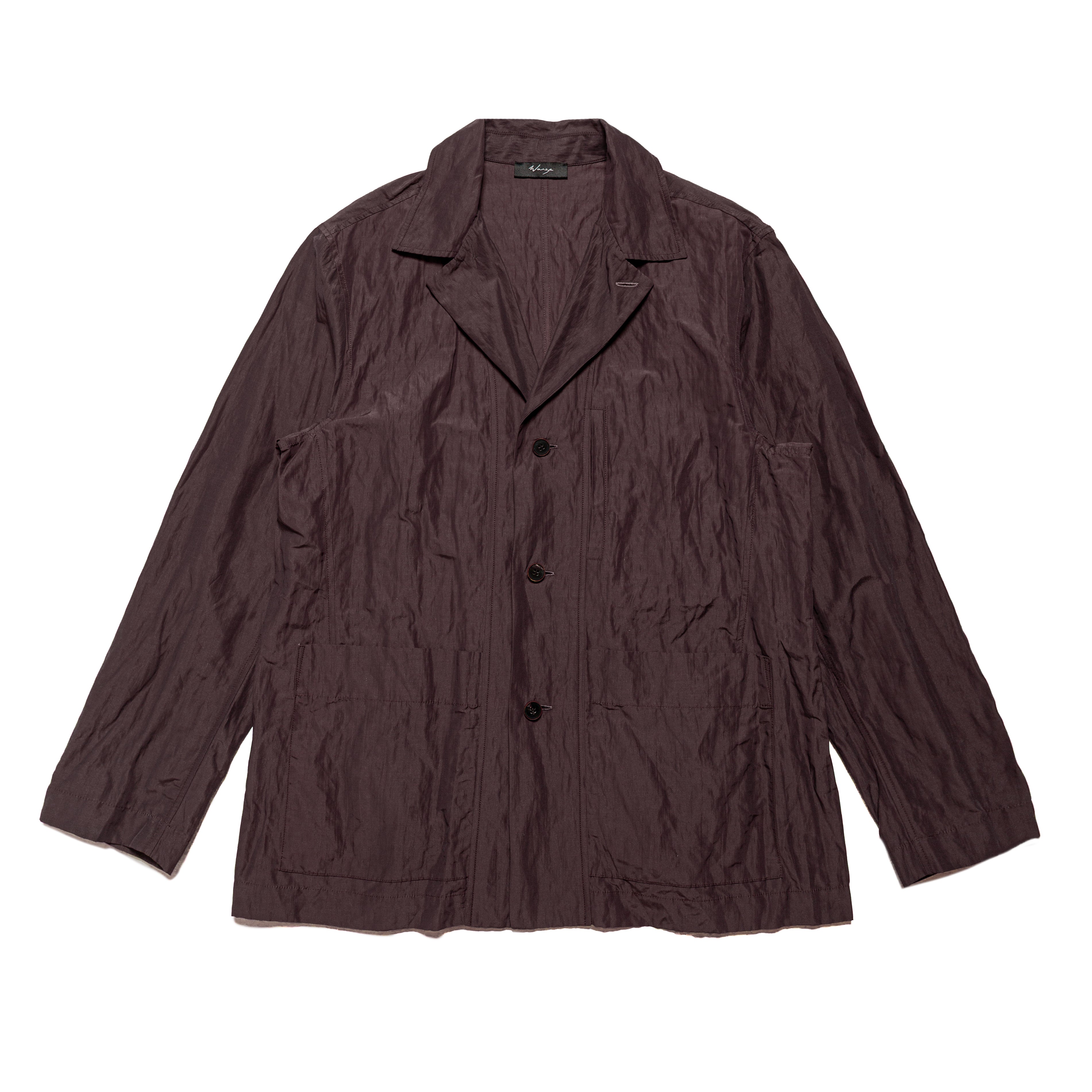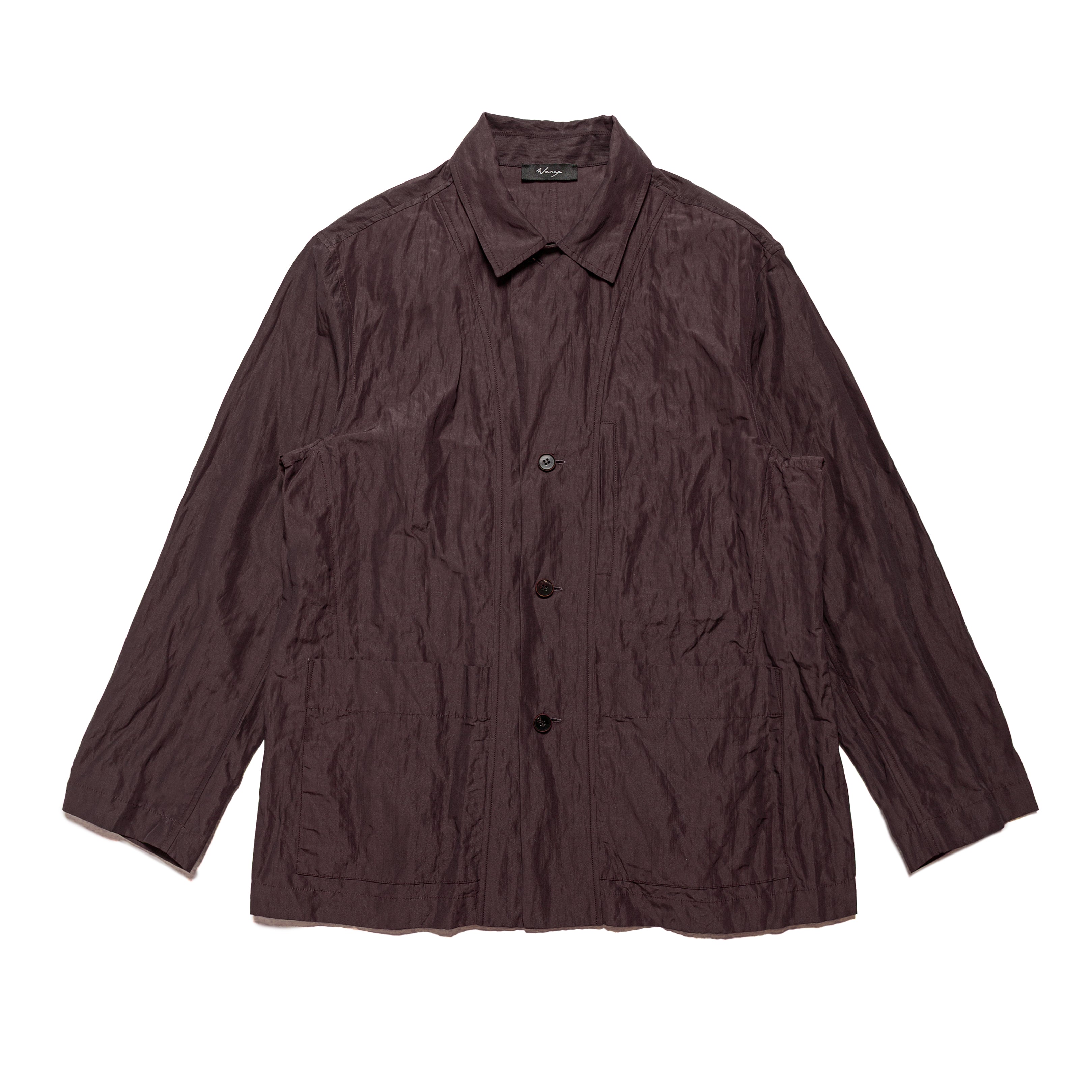 An exercise in blending elements of a chore jacket and a blazer block, this piece features a boxy fit with subtle tailoring throughout. A welt pocket at the chest blends into the front placket. Darts at the side front and back seams add shaping, while patch pockets at the waist conceal the dart ends. A button at the neck transforms the lapel into a classic collar, lending the piece a workwear-inspired look.