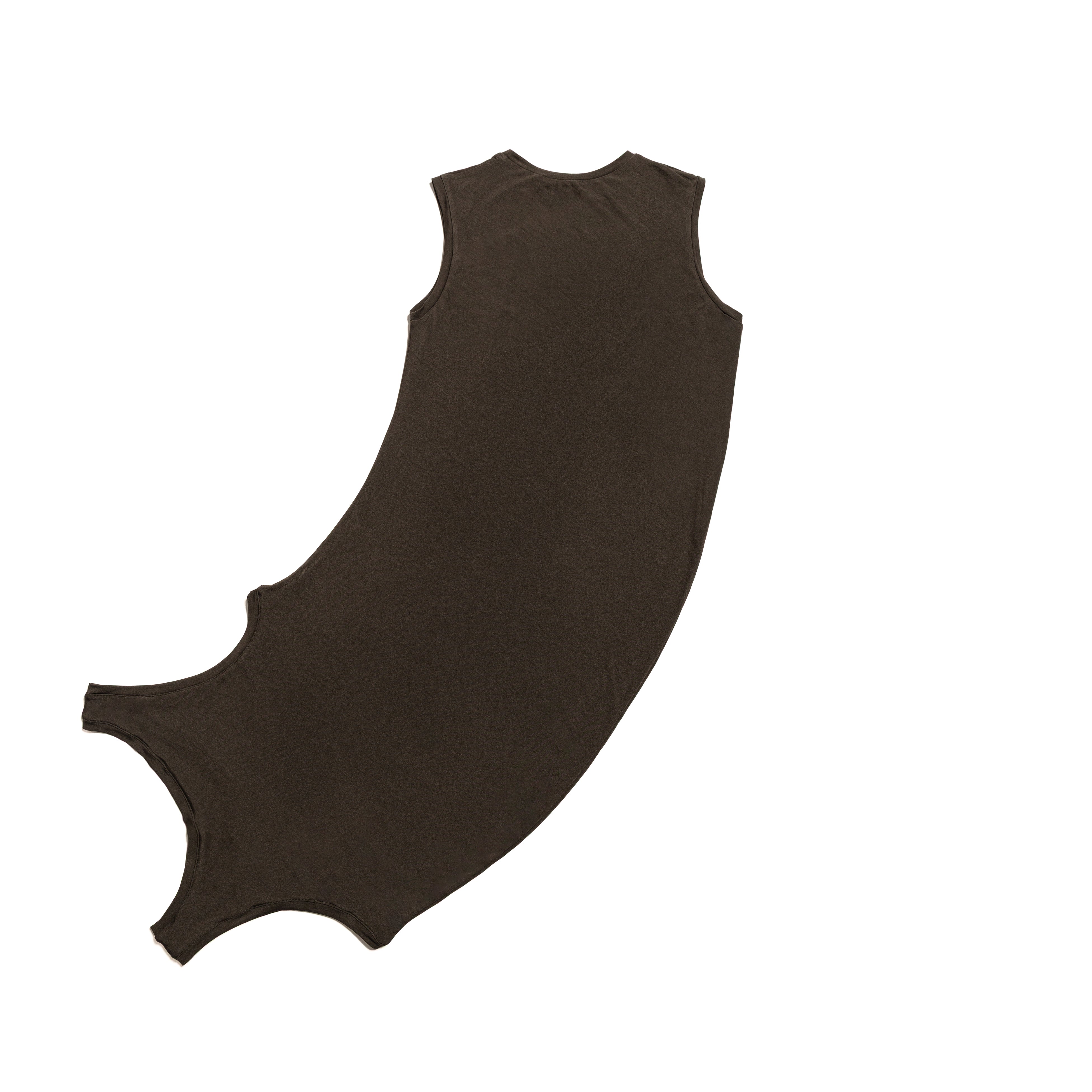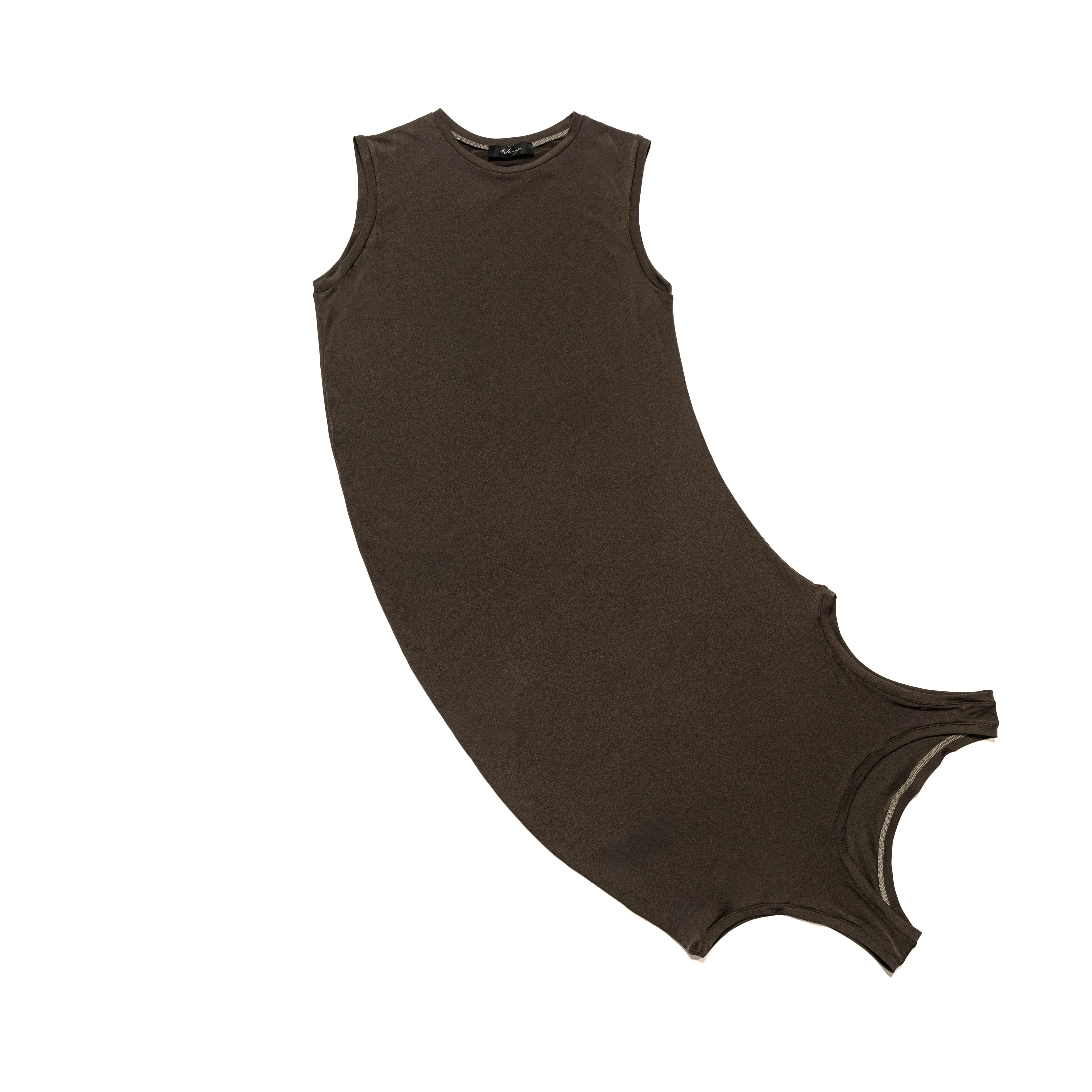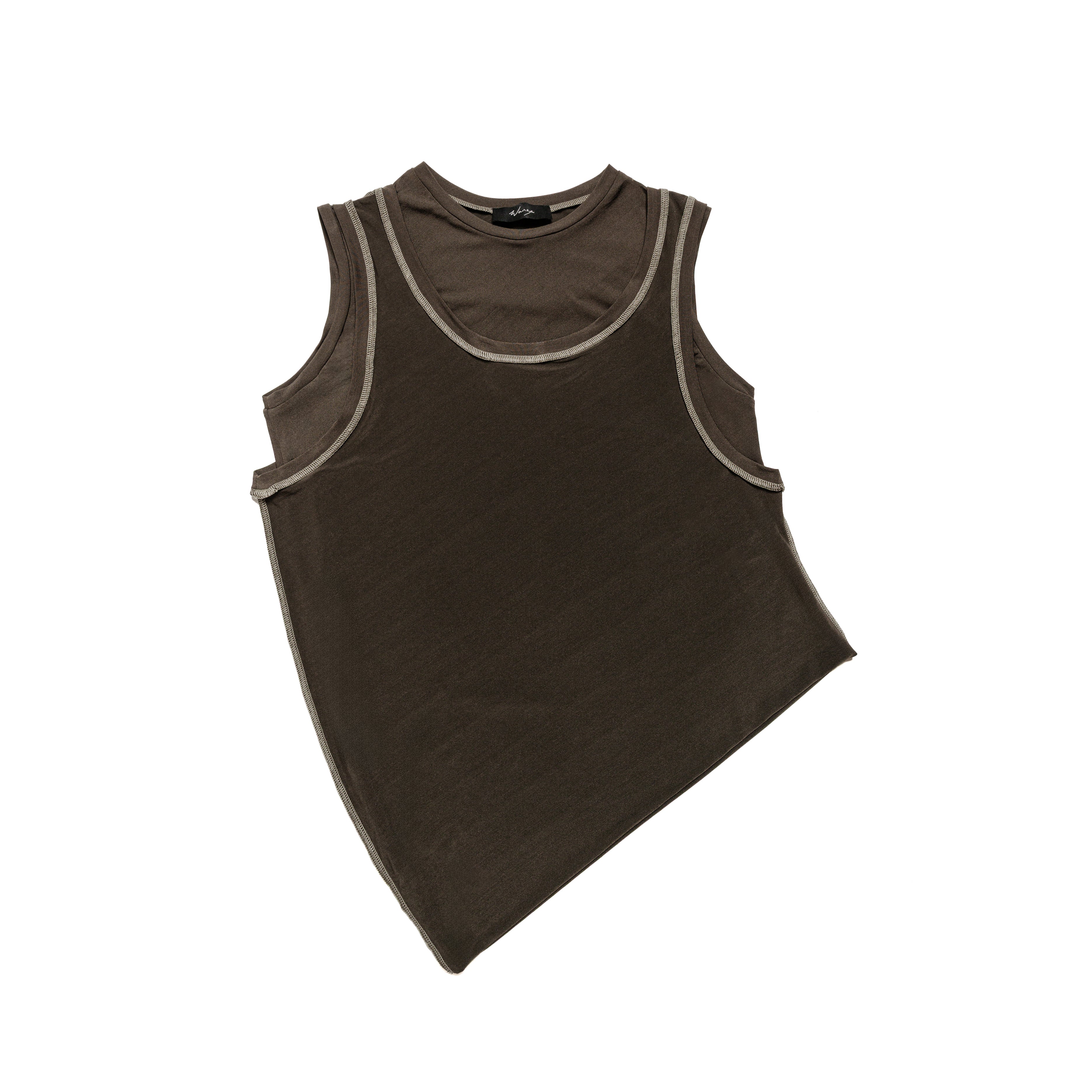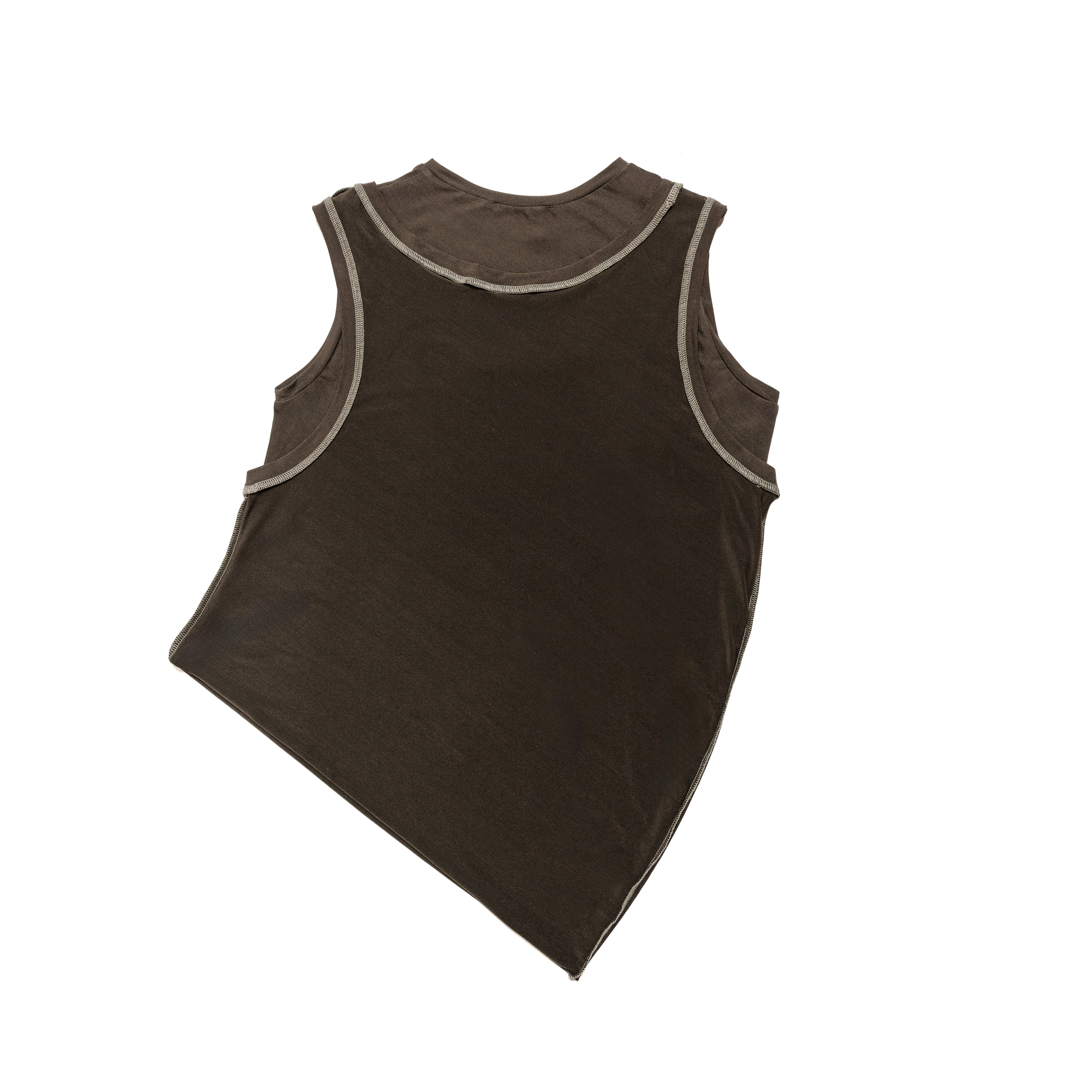 Deviating from a classic tank, this double layered top is cut in one continuous piece that folds at the waist. The asymmetrical cut creates a relaxed fit that drapes on the body with ease. Stitching at the neck and armhole bands are exposed on the top layer. The top layer can be taken off the shoulders and left to hang down the body, becoming a dress, allowing for multiple ways to style the piece.