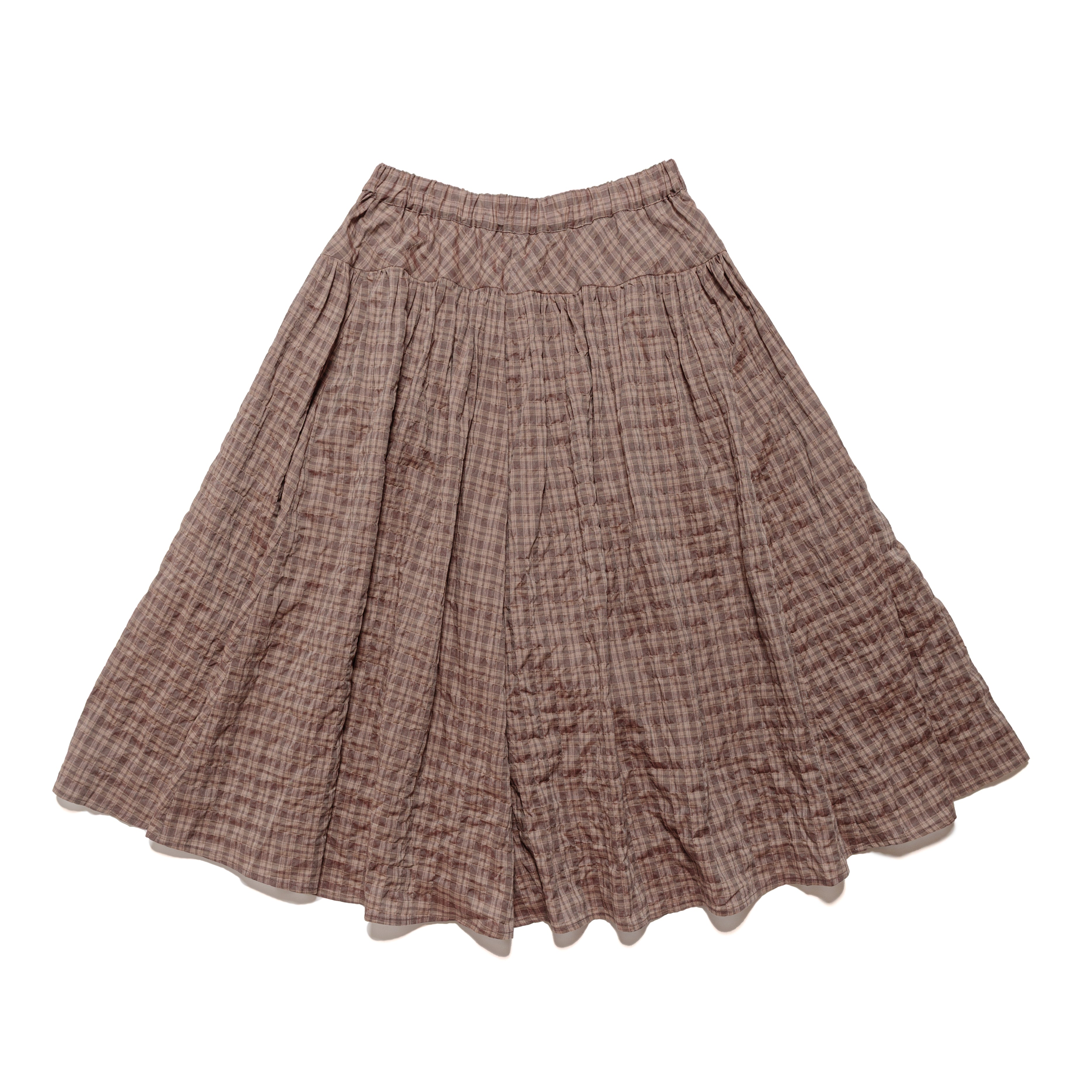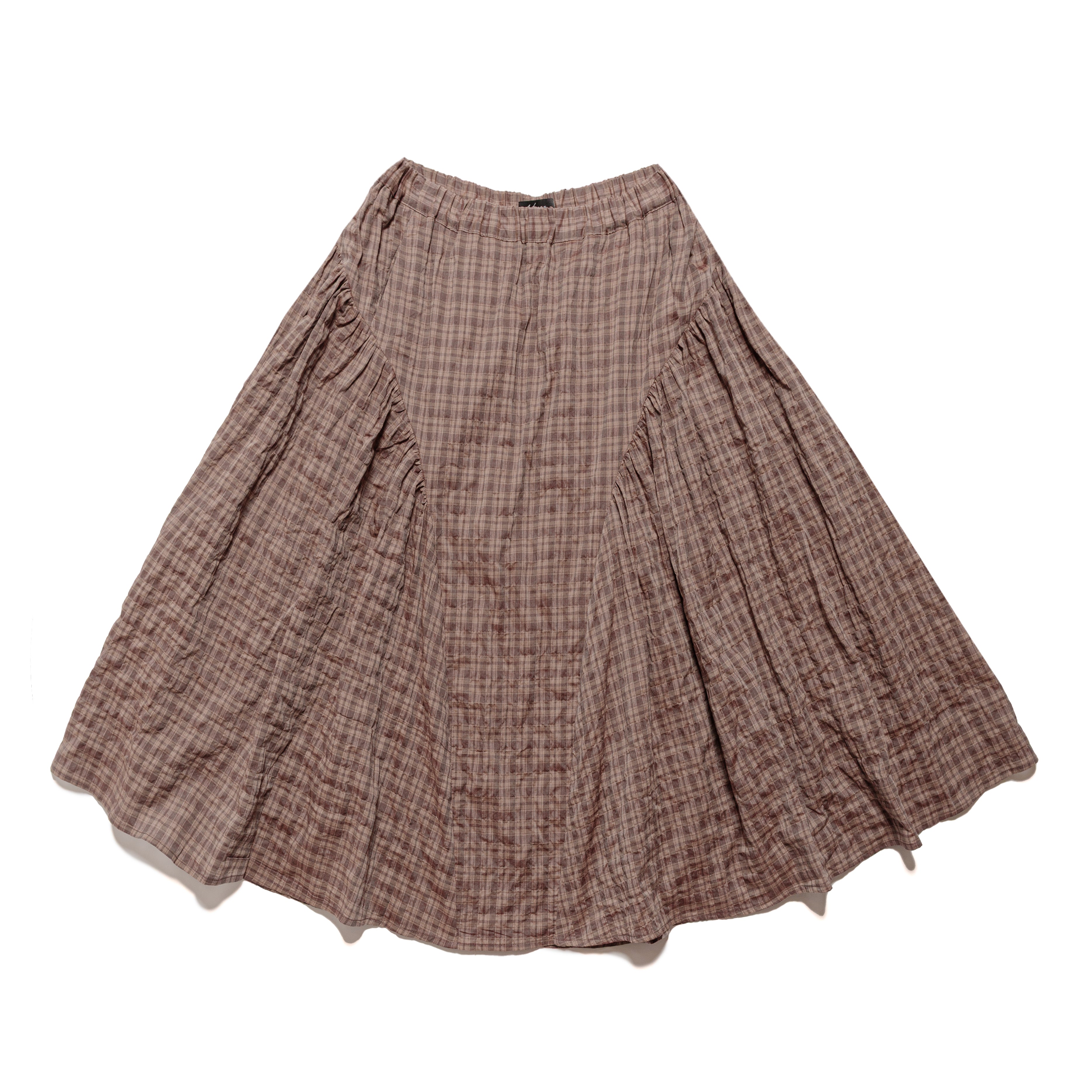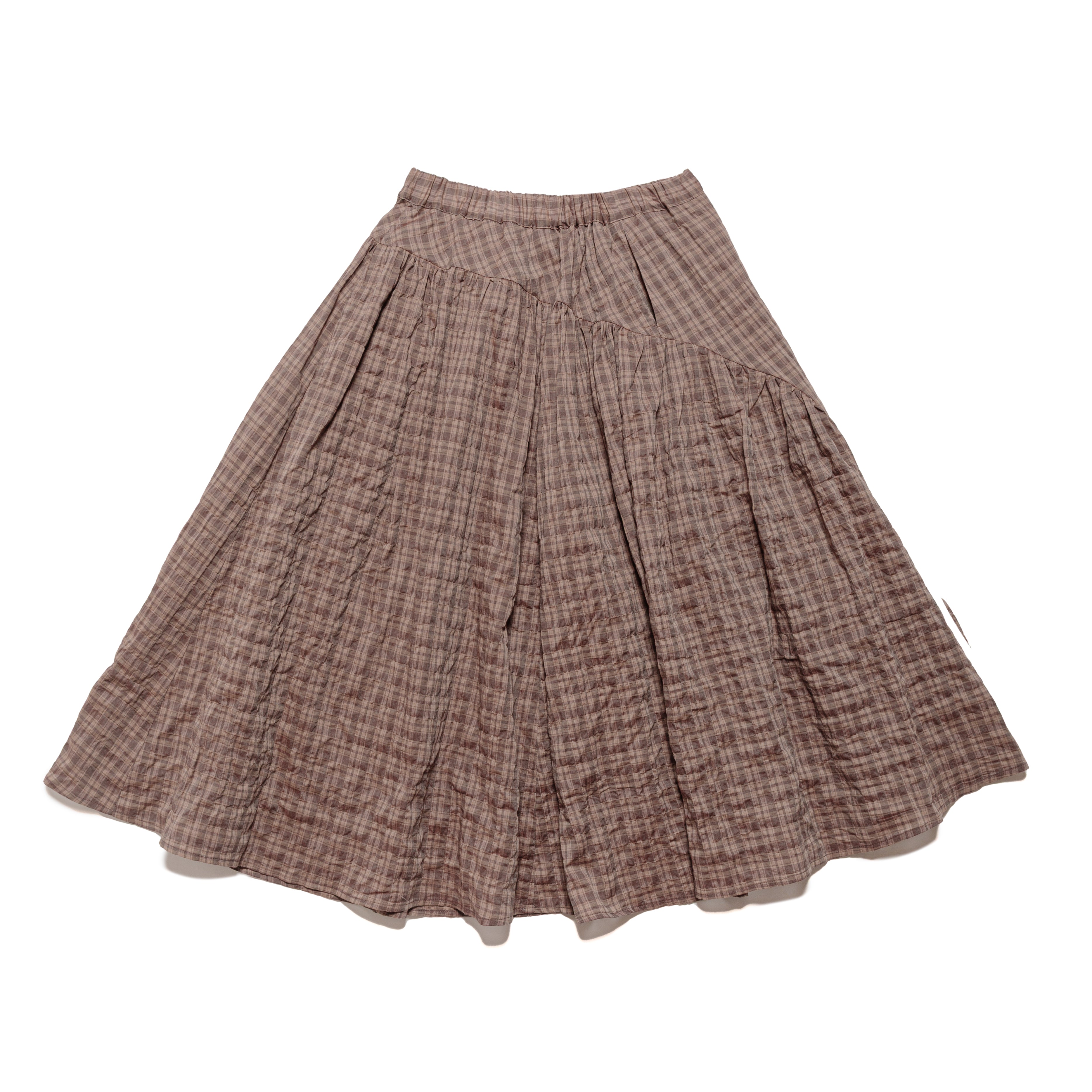 Light and airy, this skirt offers a relaxed fit. Featuring a seam that curves from the front hem to the back yoke, gathering at the side and back panels create volume throughout. The elasticated waist allows for comfortable wear while inseam pockets at the front add functionality.