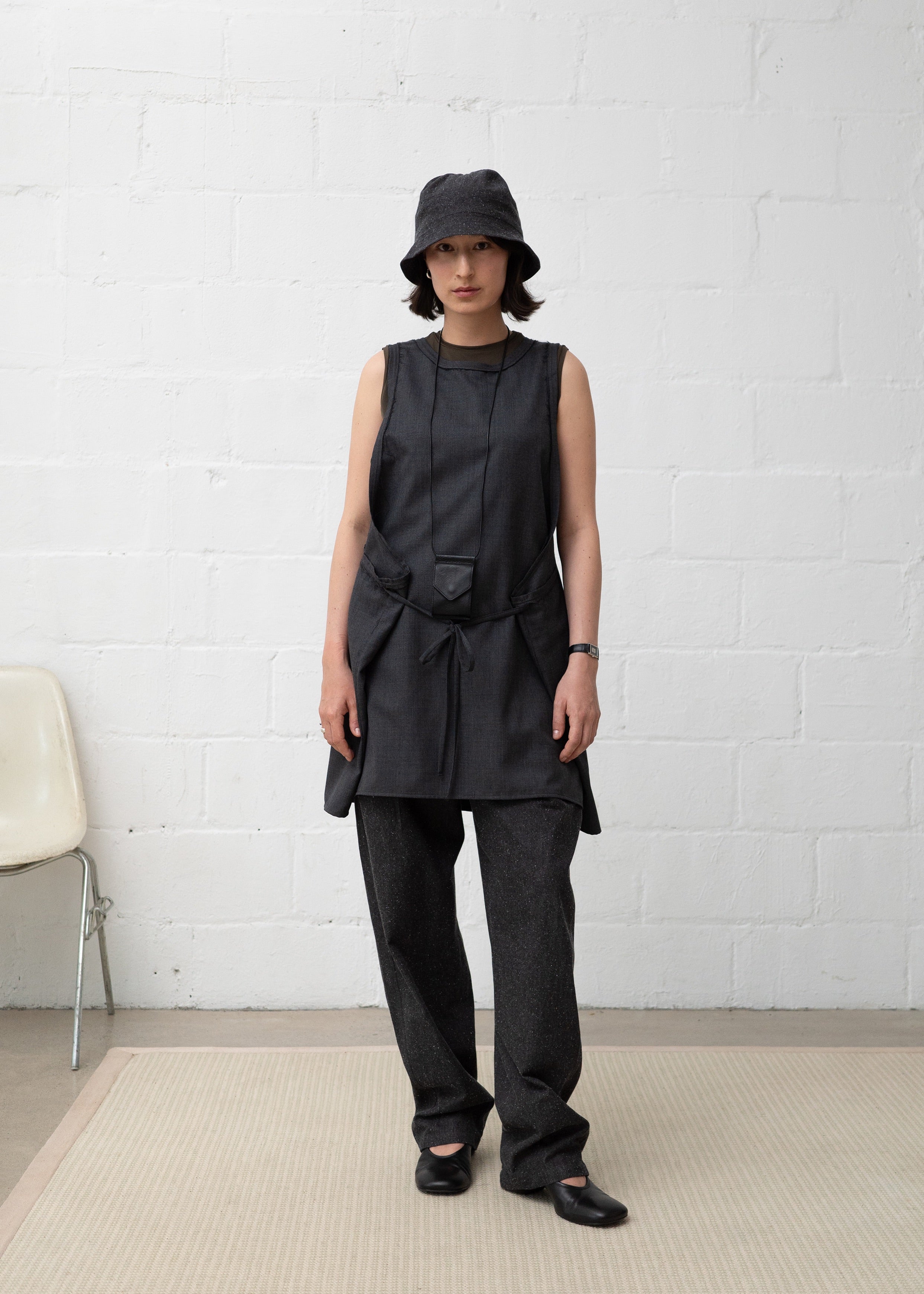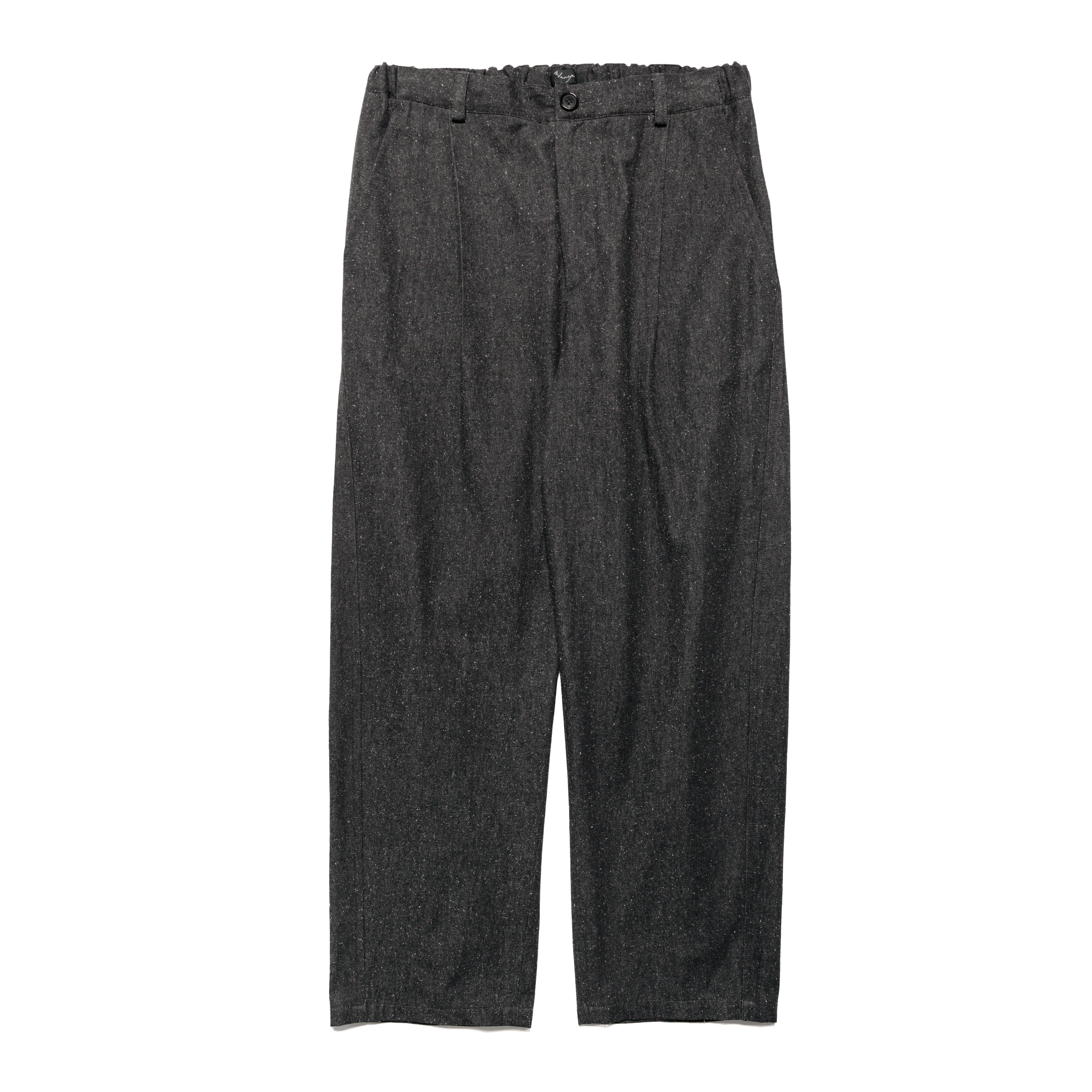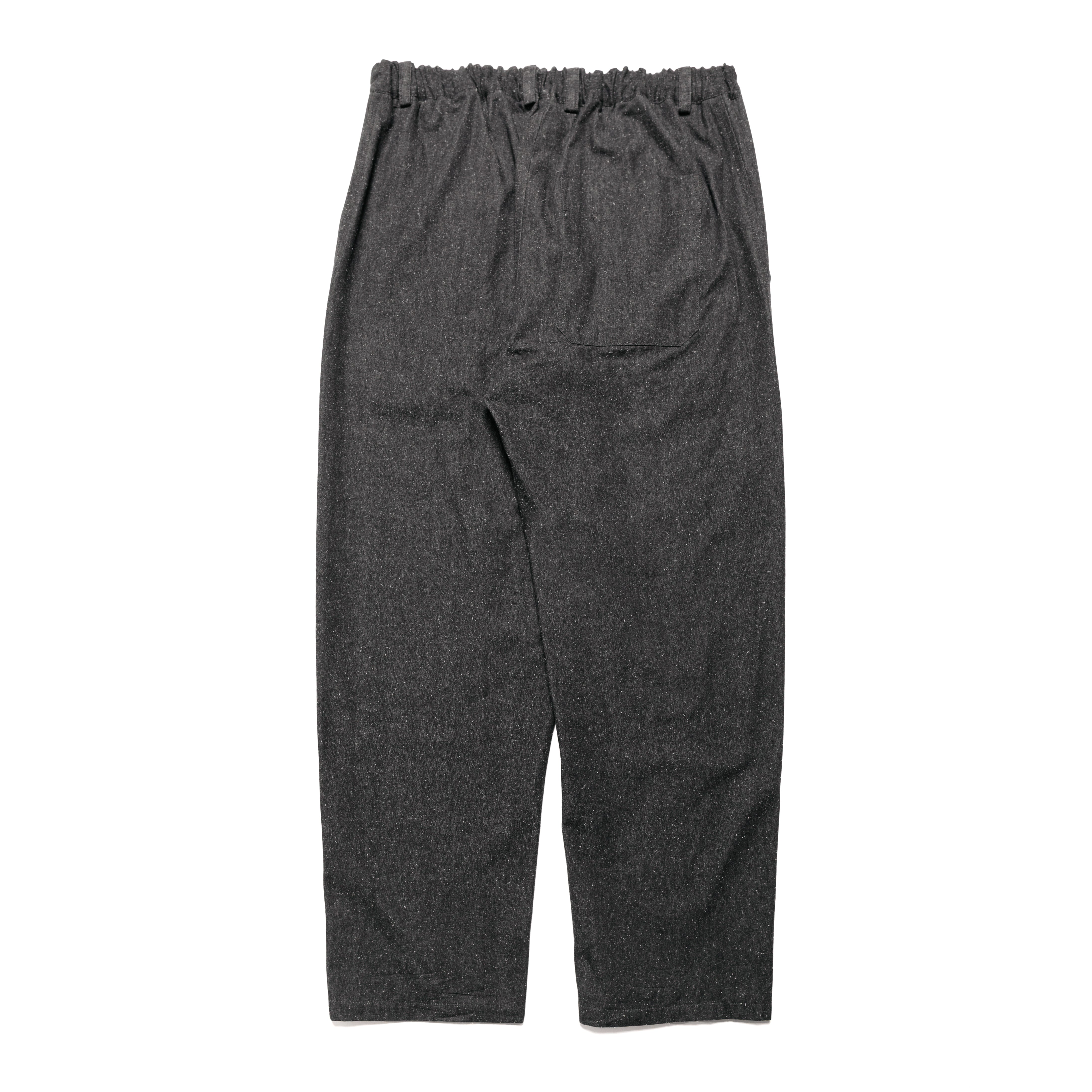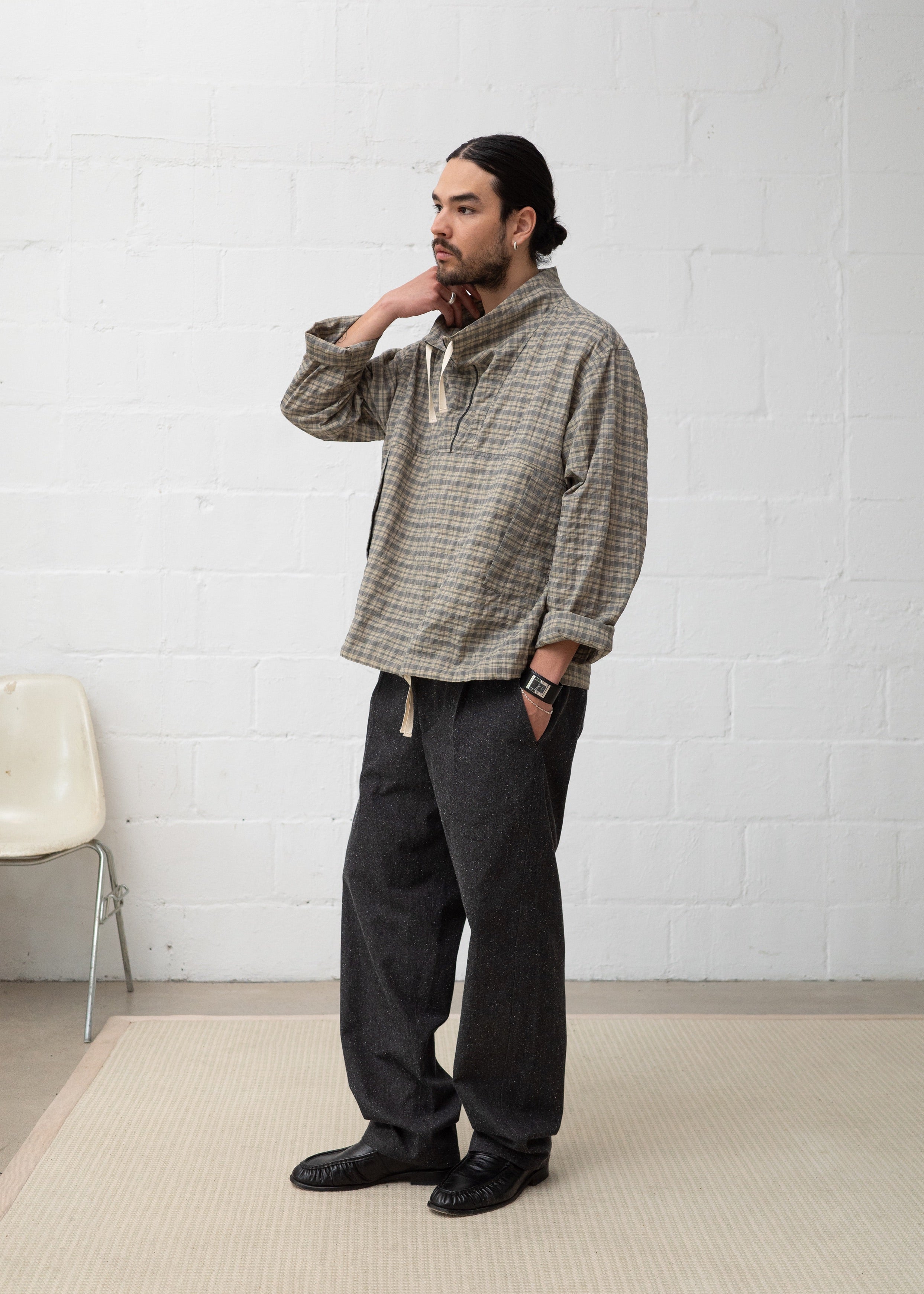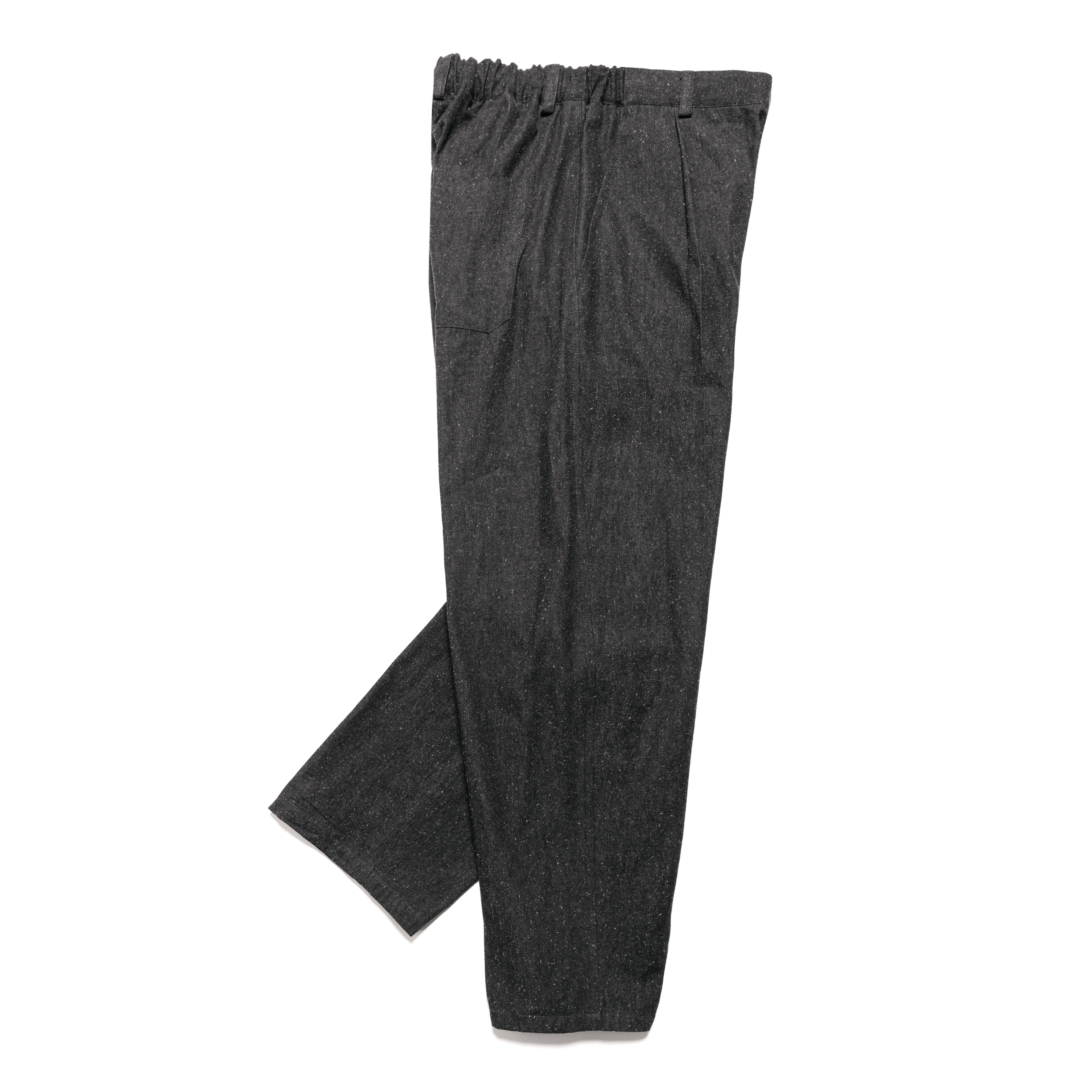 Developed from the seasonal favourite easy pant, this trouser offers a relaxed fit with formal details. The front features classic pleats and slash pockets at the waist, with a zipper fly closure. A patch pocket sits on the back of the pants, while elastic is inserted at the back waistband for added comfort.