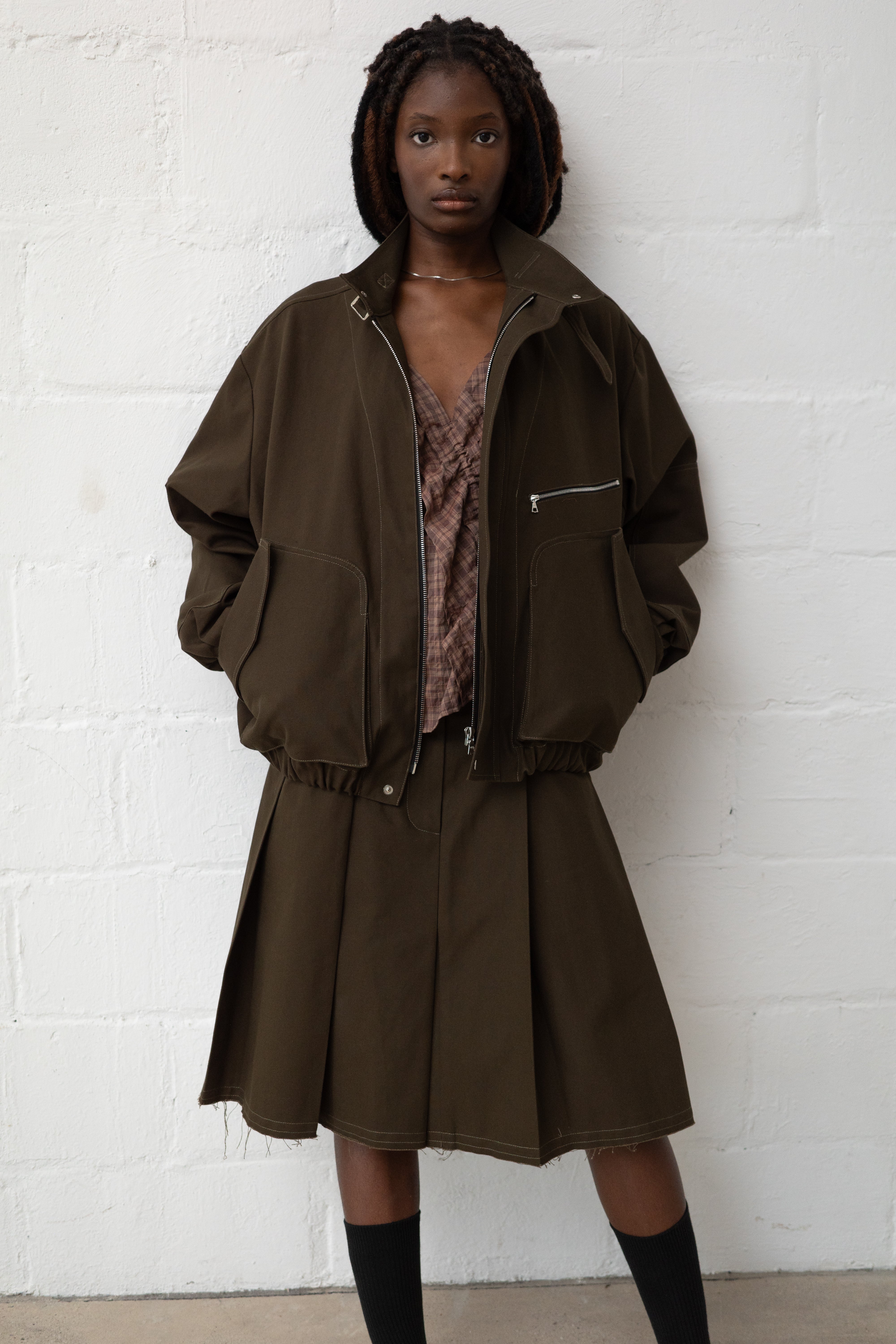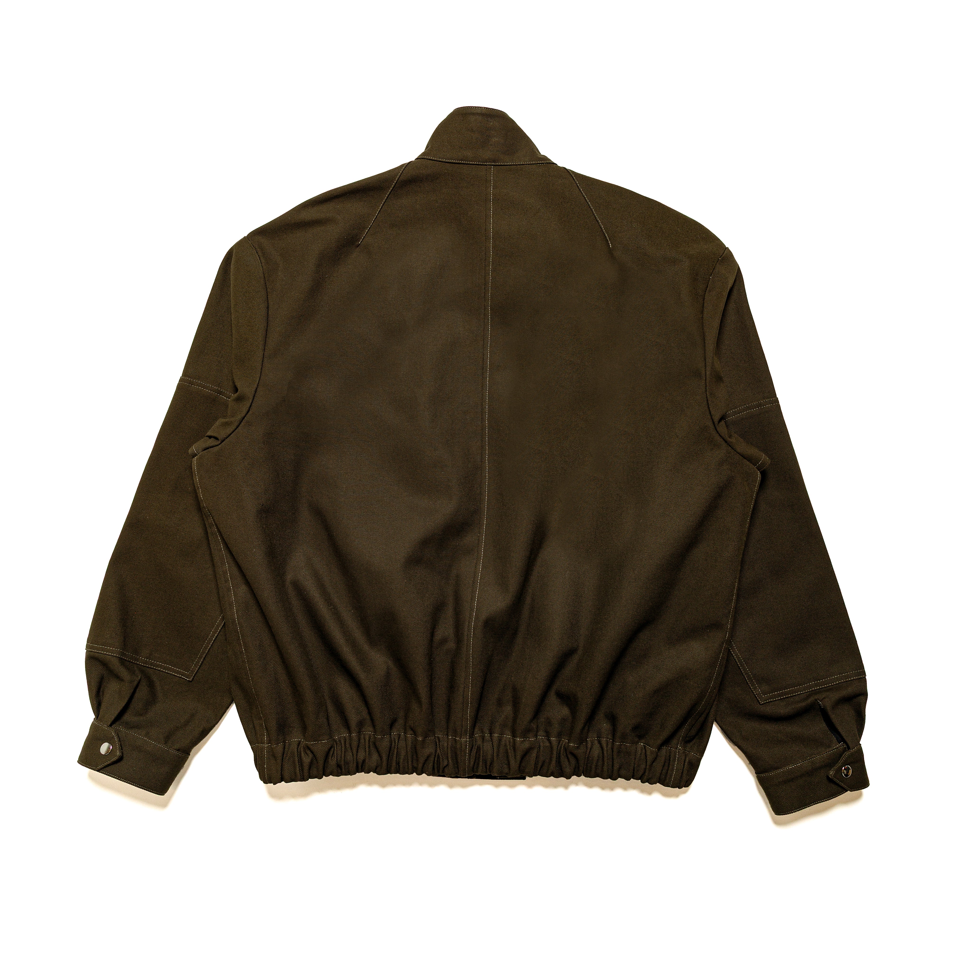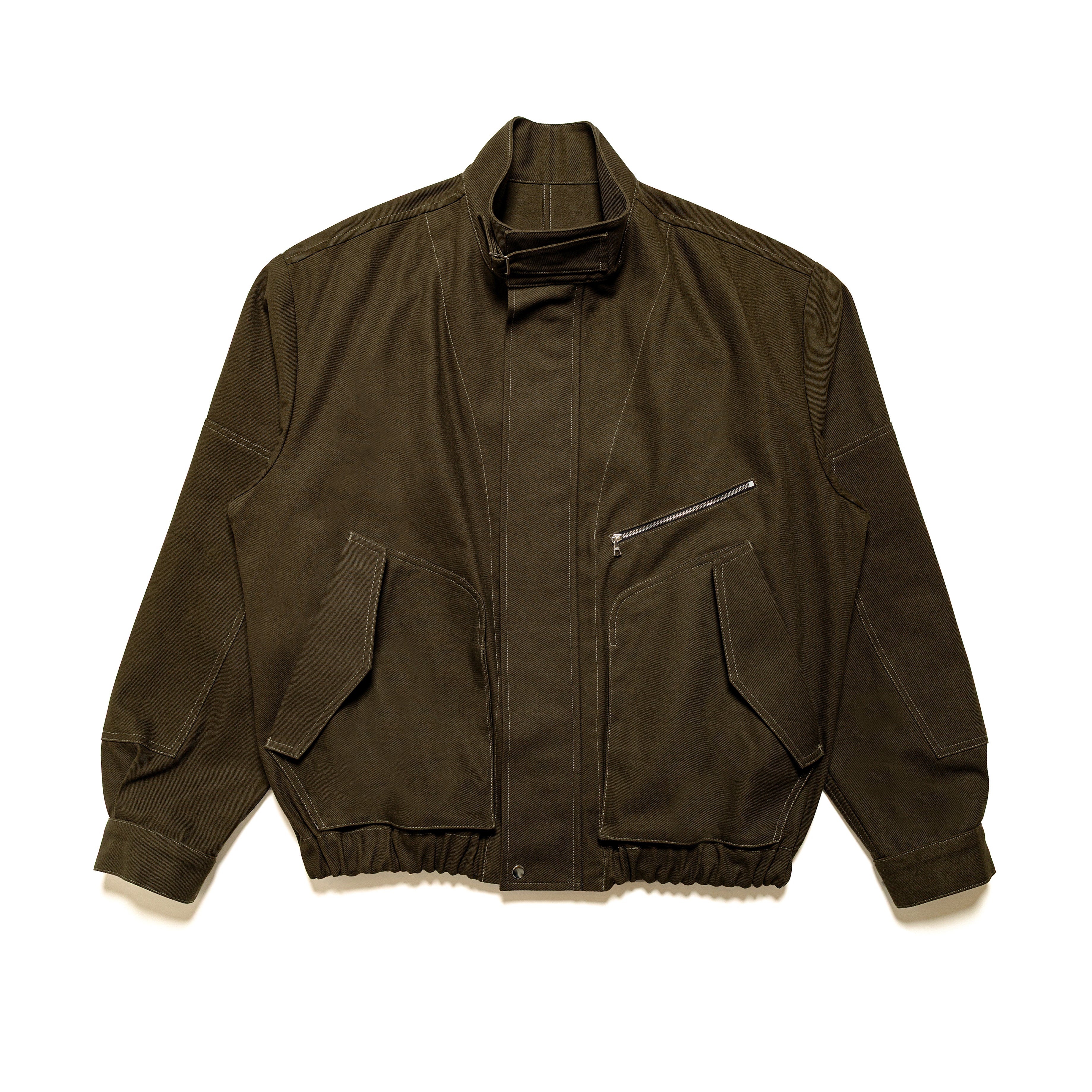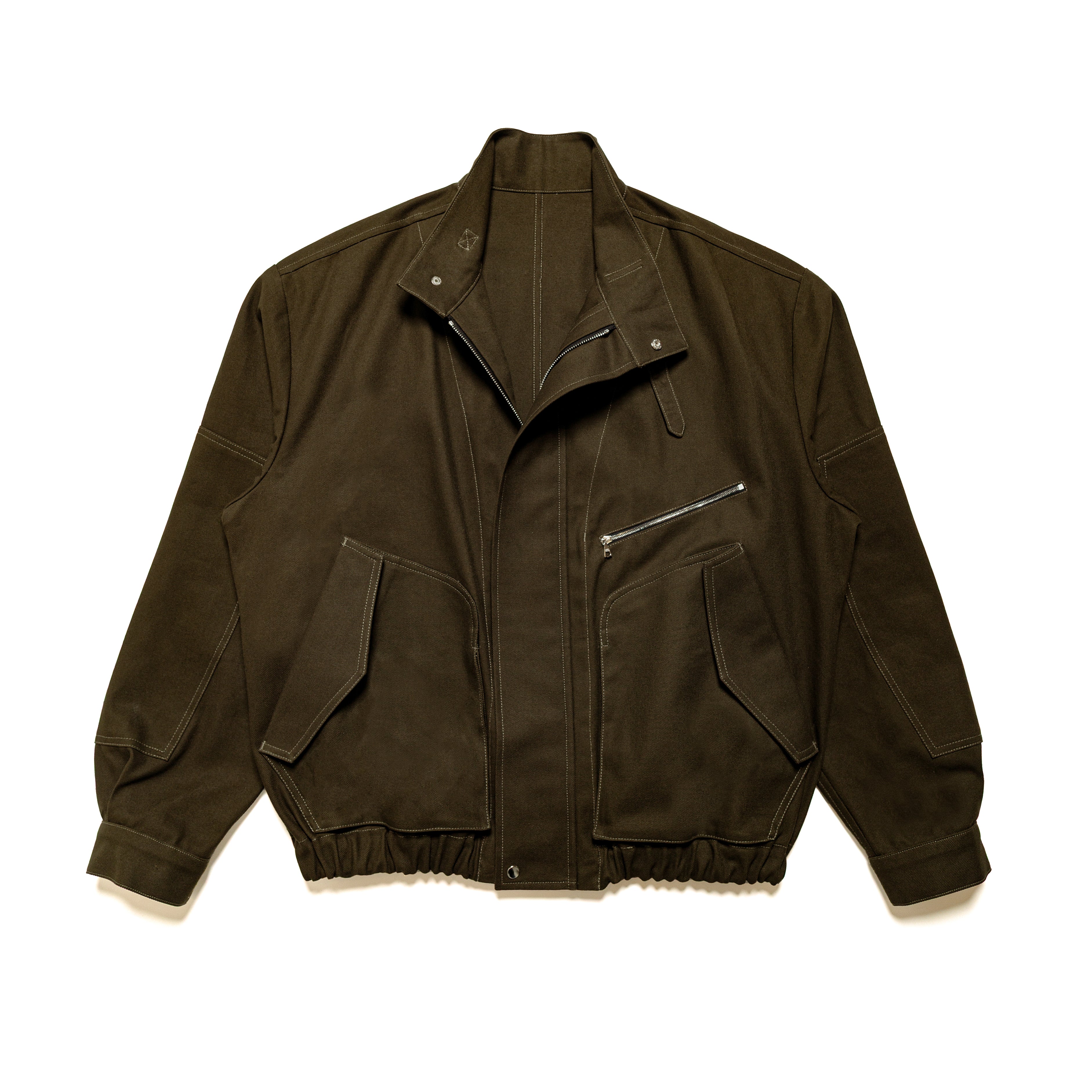 Inspired by American flight jackets from the 1970s, this jacket offers a relaxed fit. An emphasis on practical details is seen in front patch pockets that have a foldover flap, concealing welt pockets. A zippered pocket sits above the left patch pocket for additional storage. Large elbow patches on the sleeves provide extra protection and durability, while a buckle closure on the collar adds styling options for the wearer. Complete with an elasticated waistband, snap closures at the front placket and sleeve cuffs, and Riri zippers.
