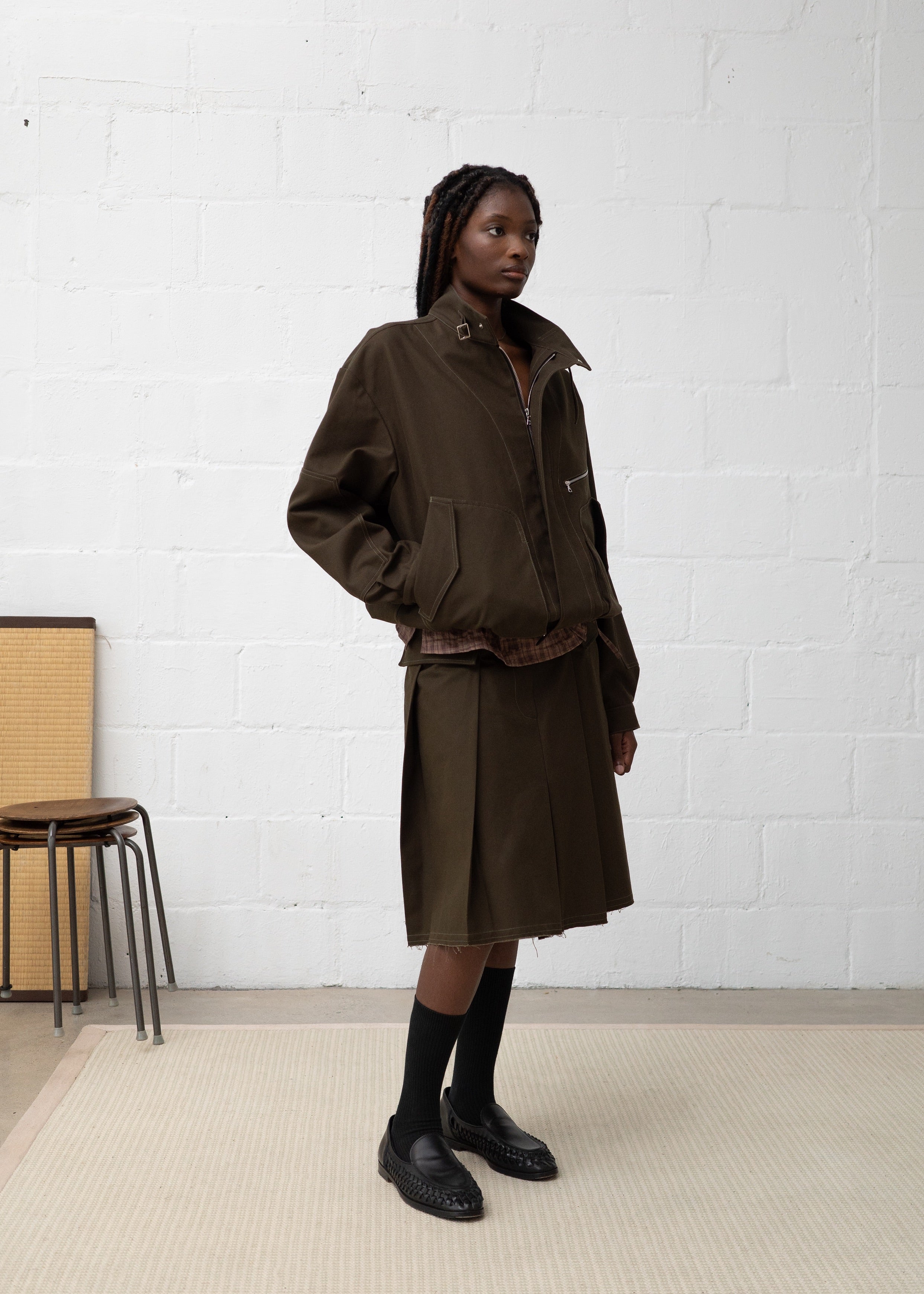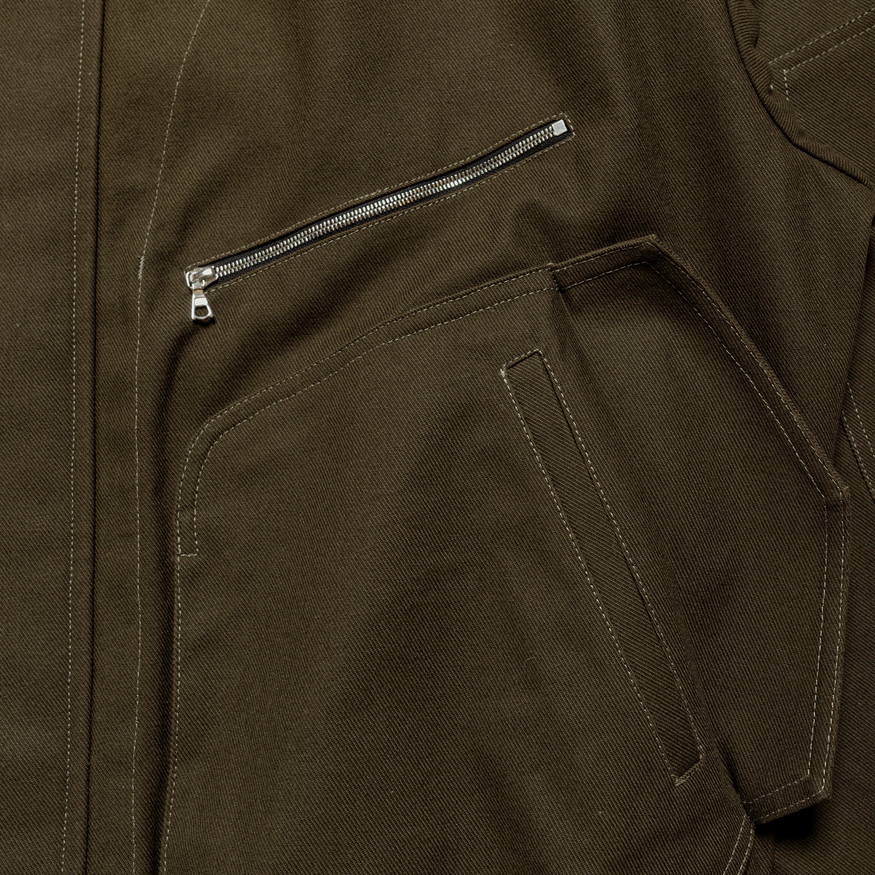 Made in a Japanese cotton twill, this heavyweight fabric is durable and holds structure for everyday wear. The lighter contrast stitching emphasizes the details in the piece.