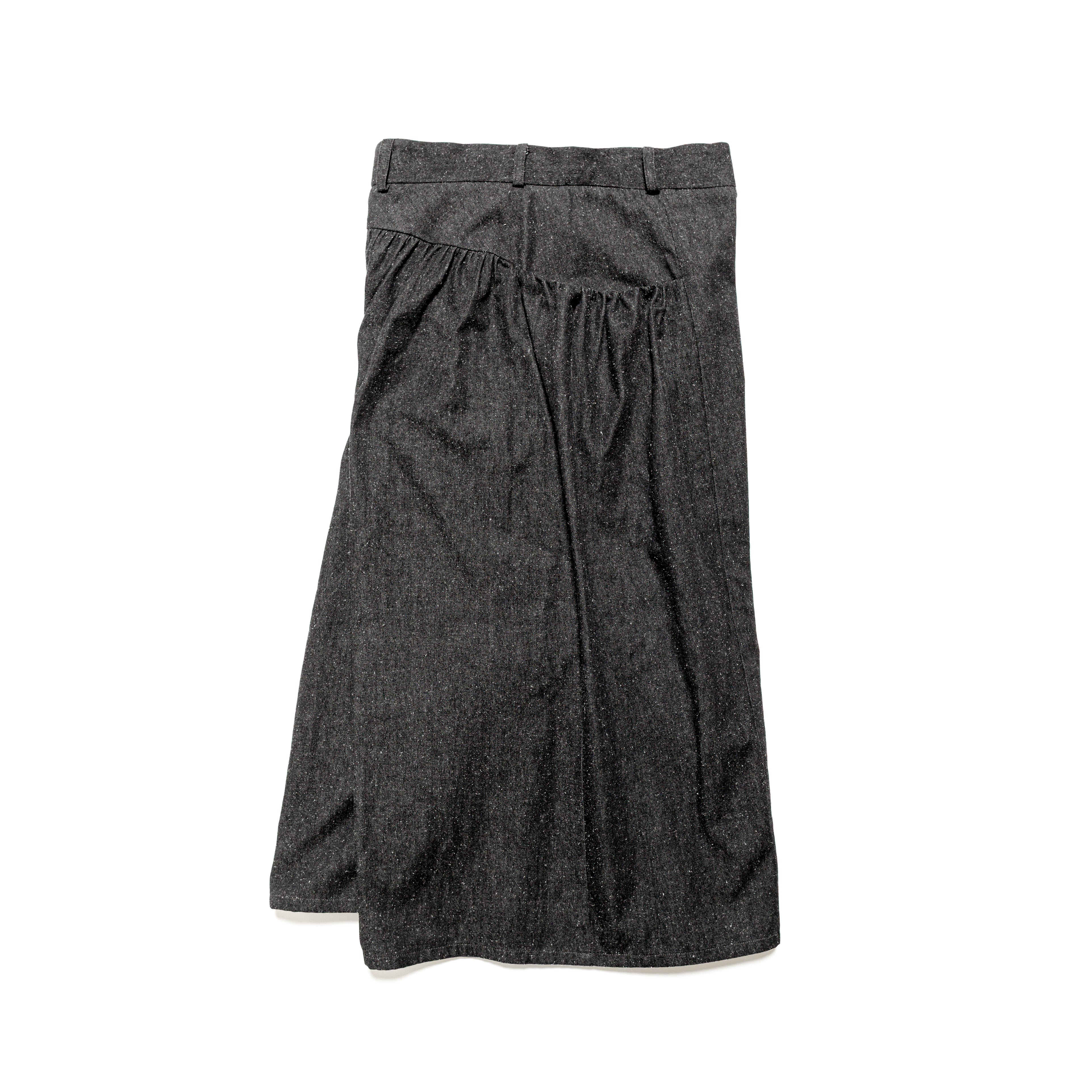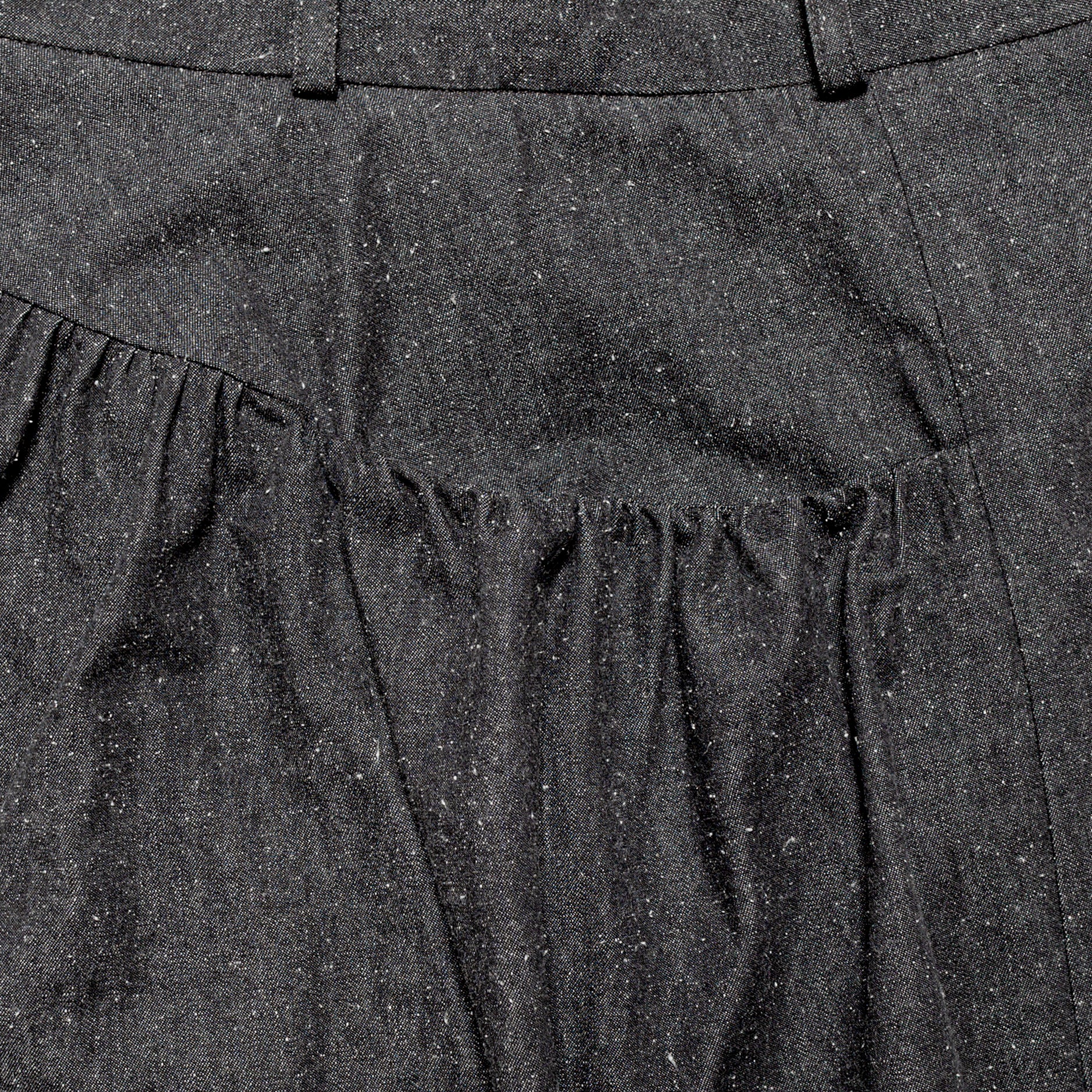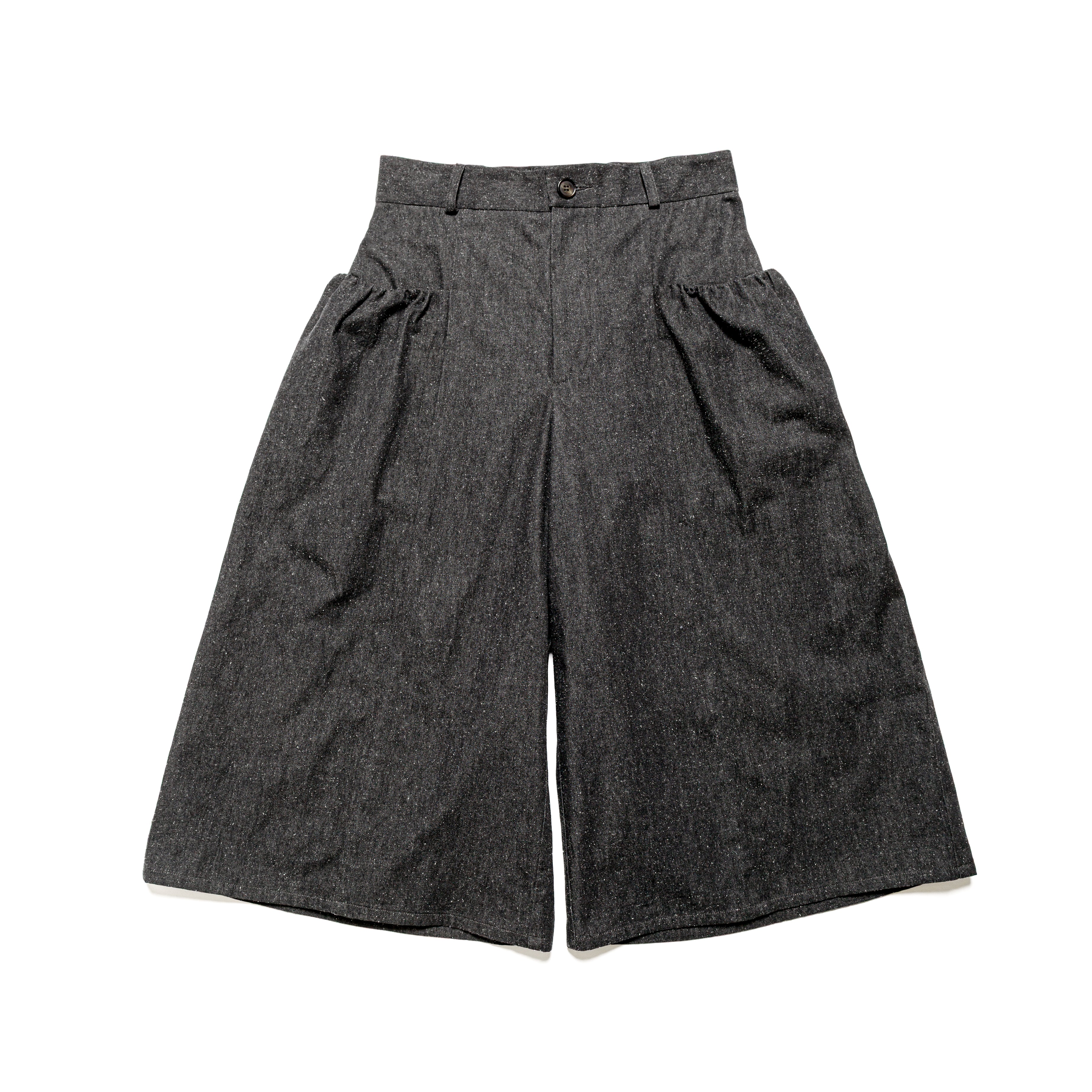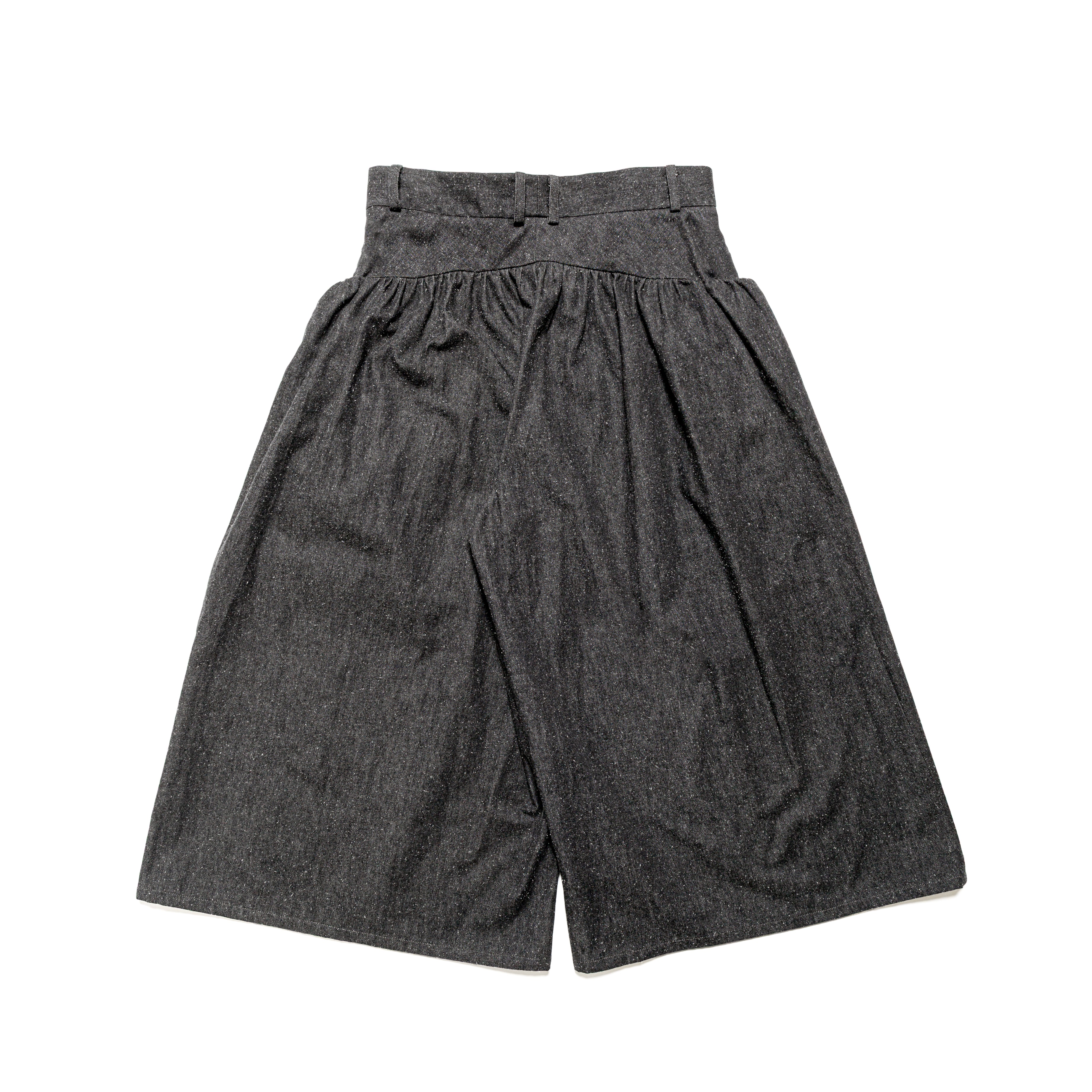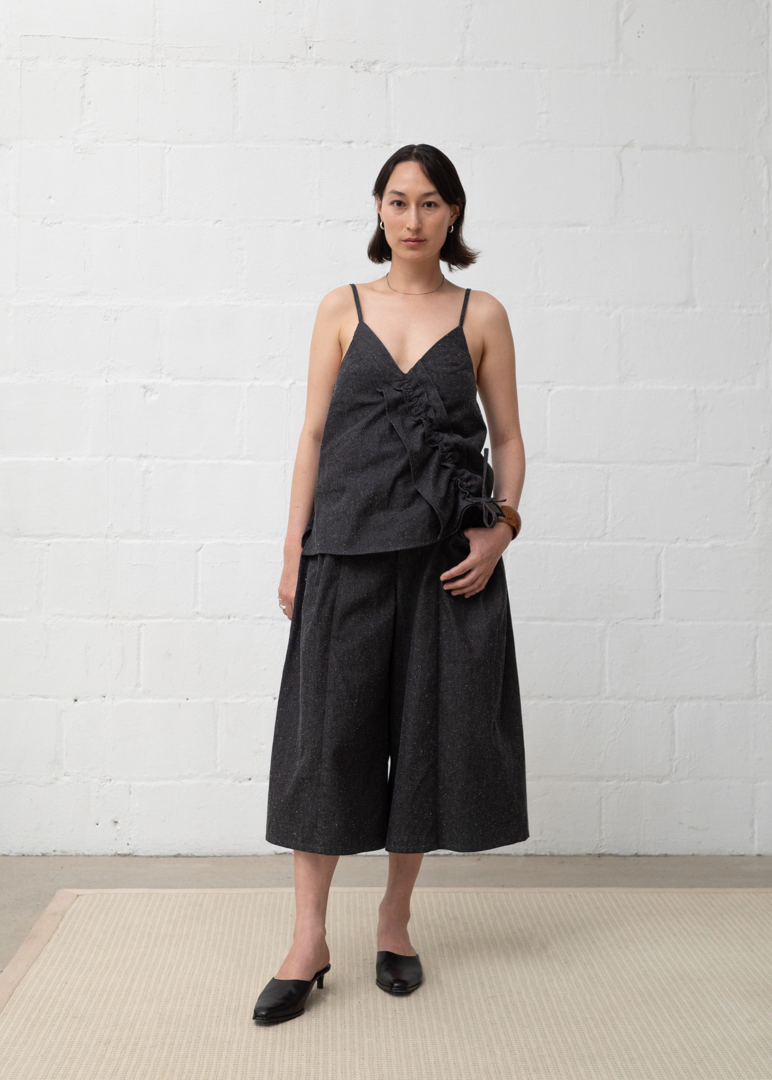 This culotte offers a relaxed, wide leg fit. The front leg features a seam running down the center, while the back has a curved yoke for subtle contouring. Gathers along the front pocket continue to the back leg, creating volume that flares down the leg.