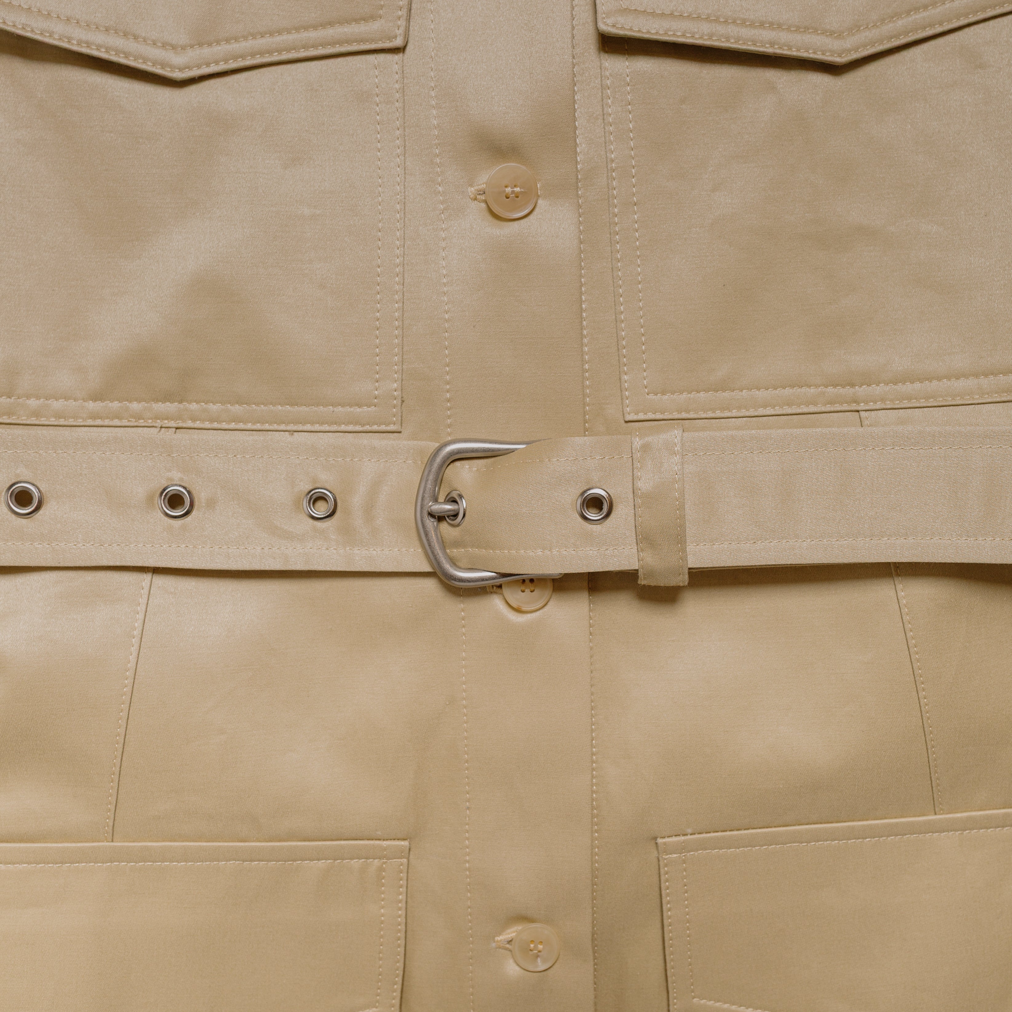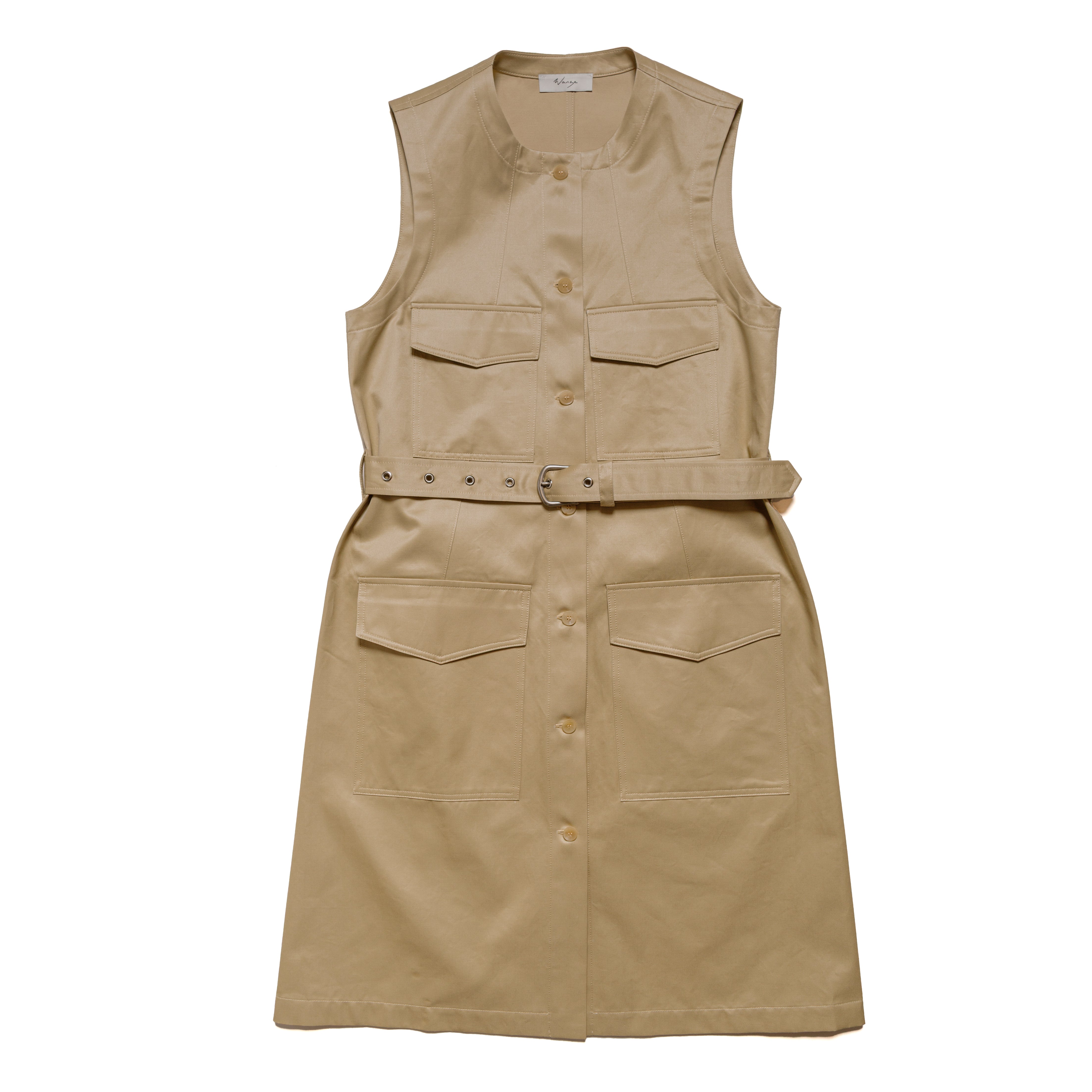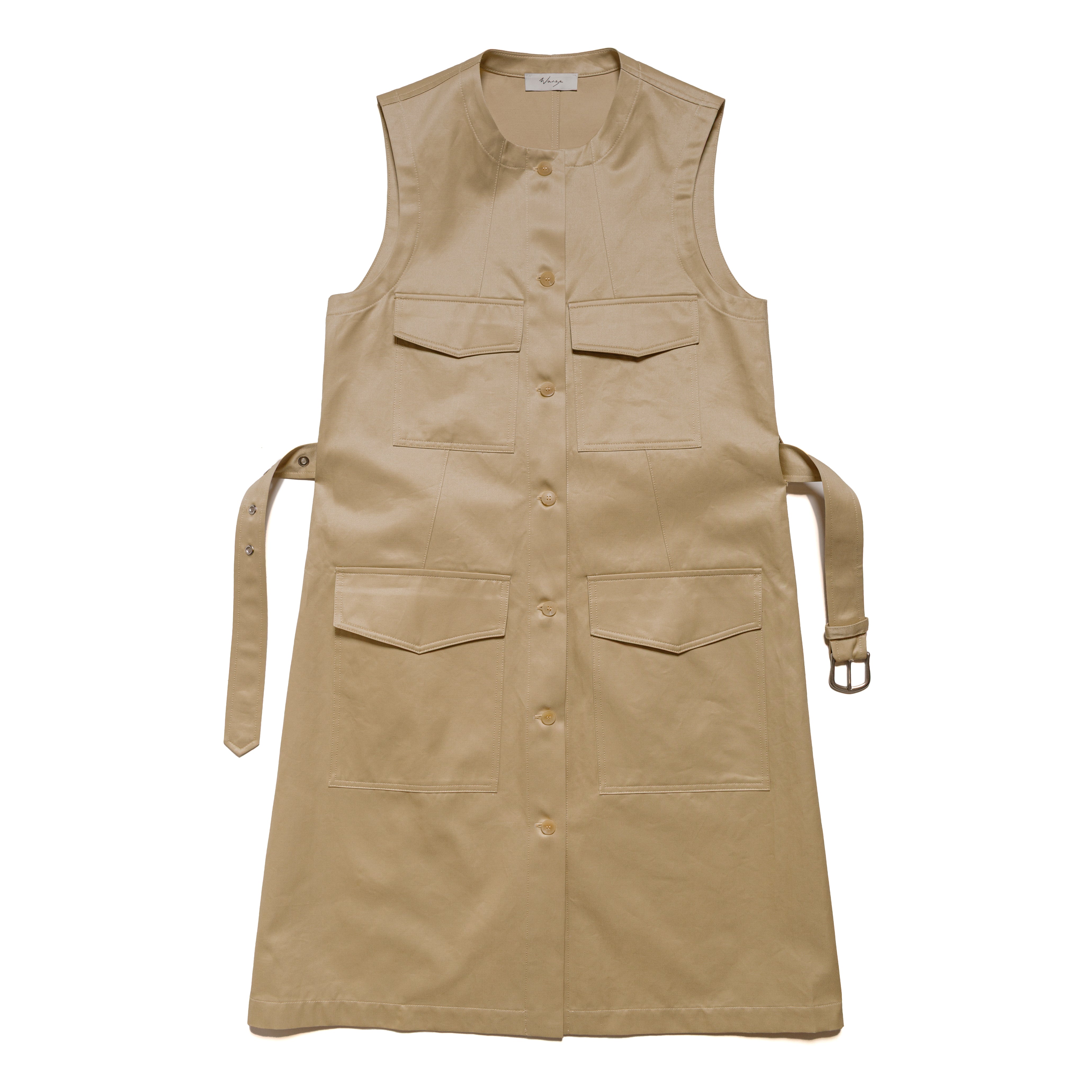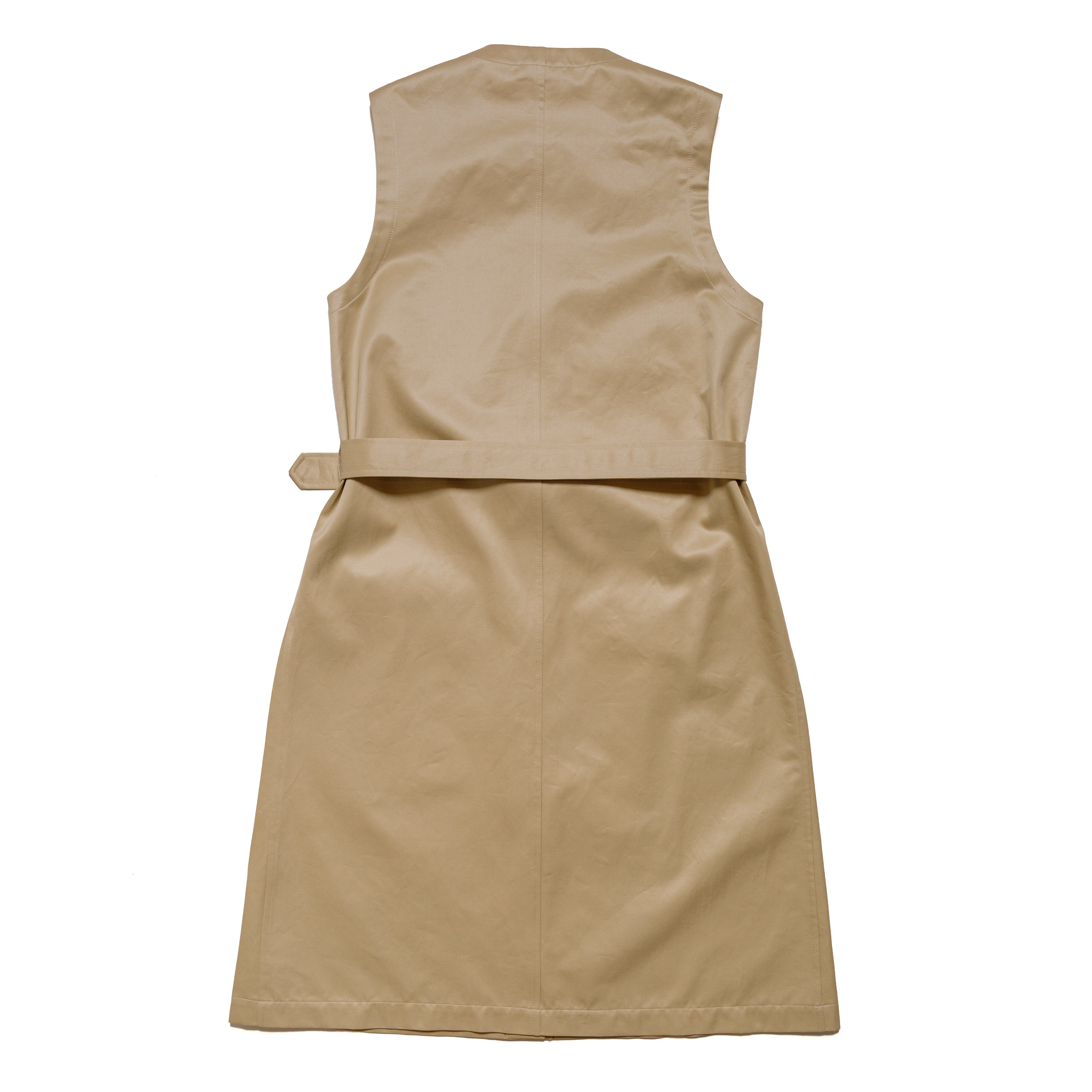 A refined take on utilitarian style, this gilet dress features a slim, tailored silhouette with military-inspired patch pockets at the chest and hips. Long darts extend from neck to hem, enhancing its structured shape. Designed for versatility, it can be worn open as a vest or buttoned up and cinched at the waist with the included belt for a more defined look.