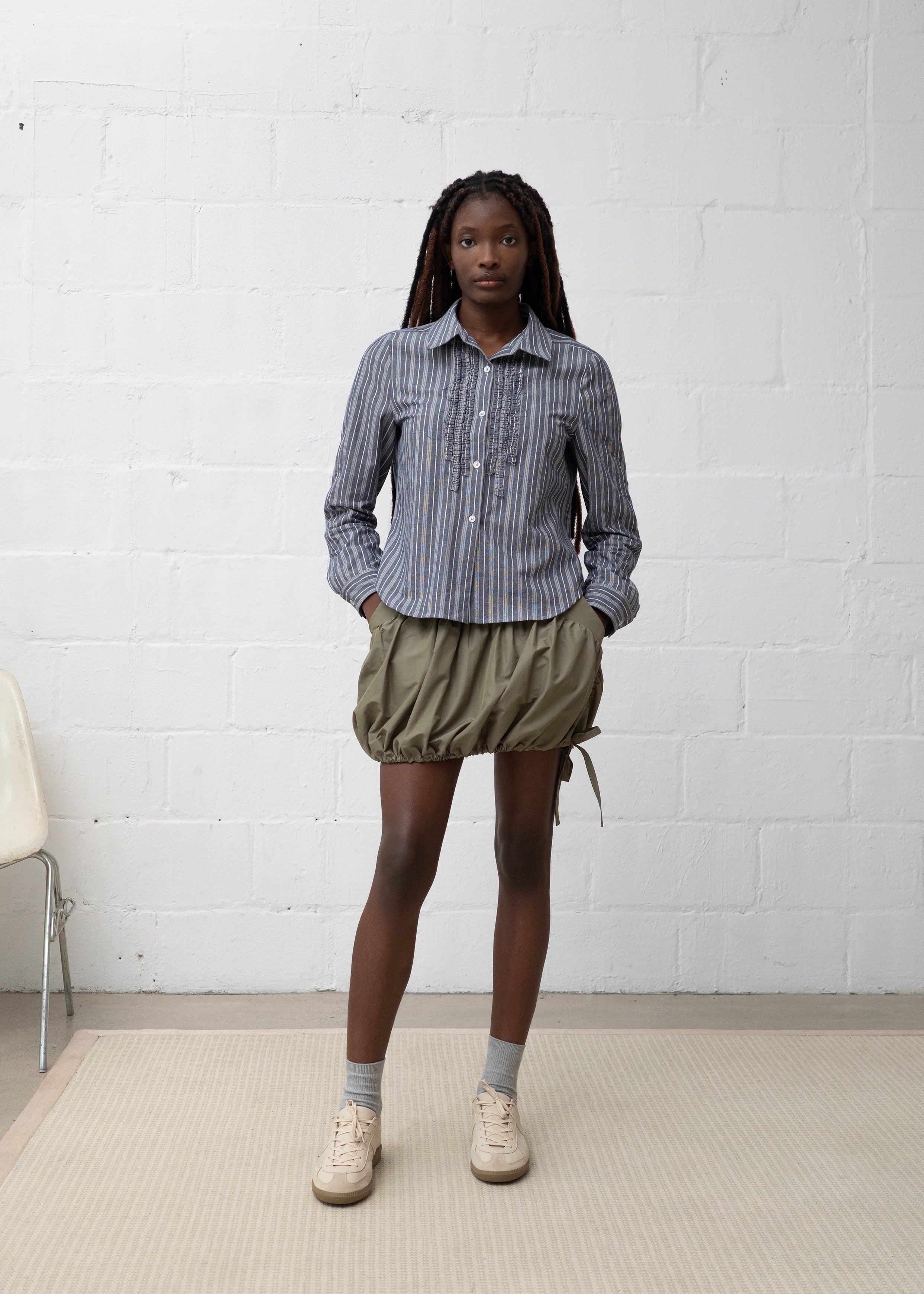 A mini gathered skirt, featuring a curved waist panel with two inseam pockets, belt loops and invisible zipper at centre back. The skirt has straps at hem, which can be cinched for a bubble shape, or left uncinched for a flared look. A playful piece with a unique sculptural form.