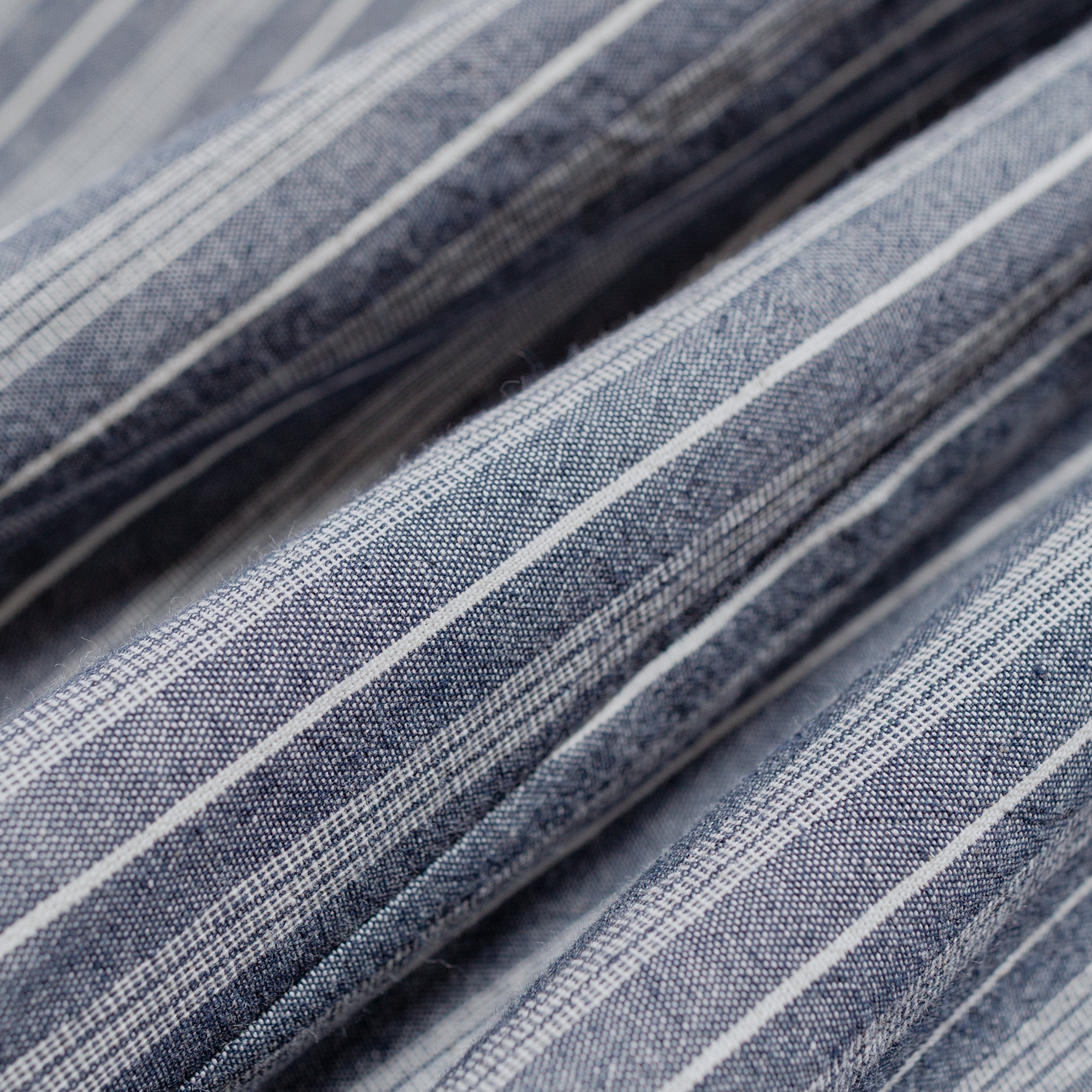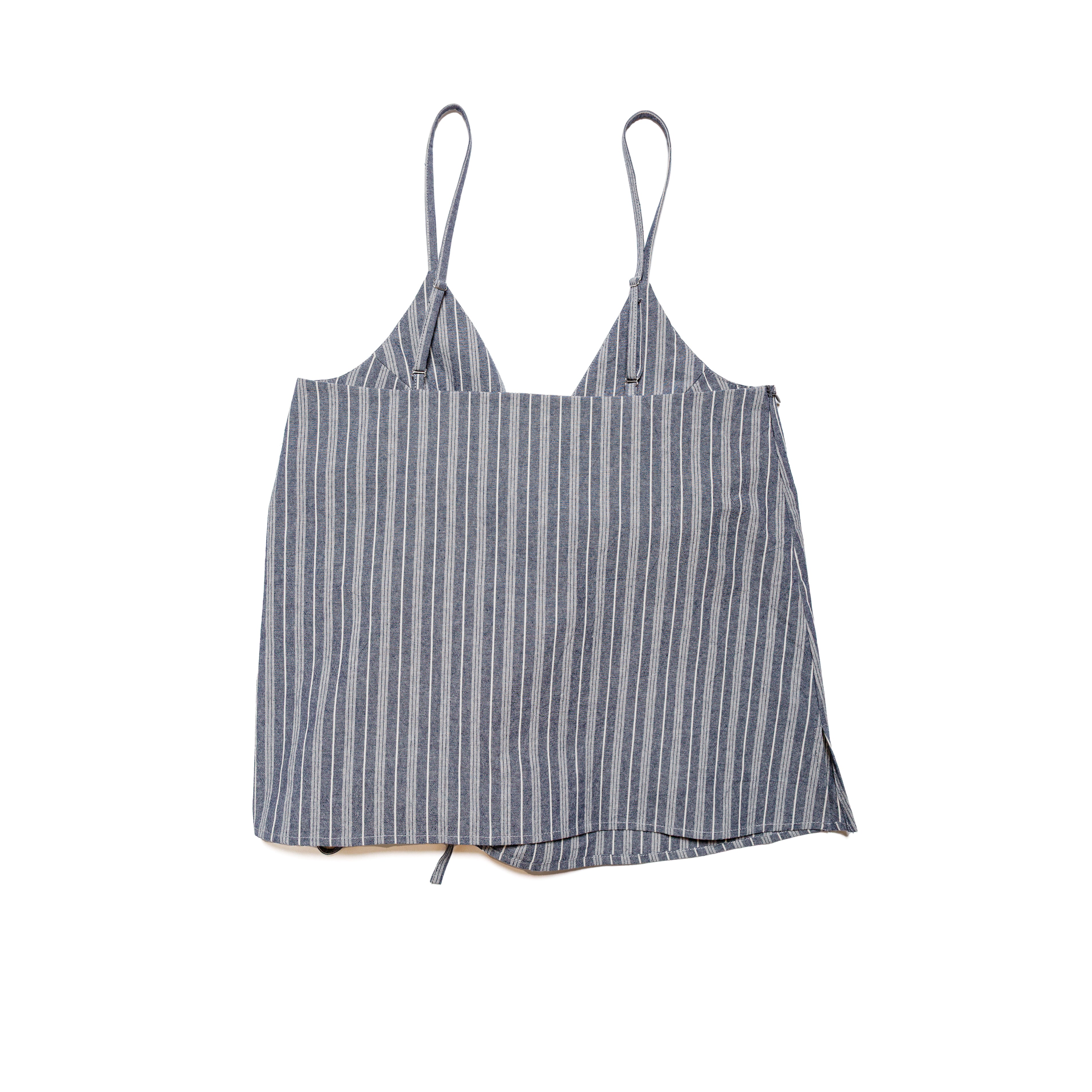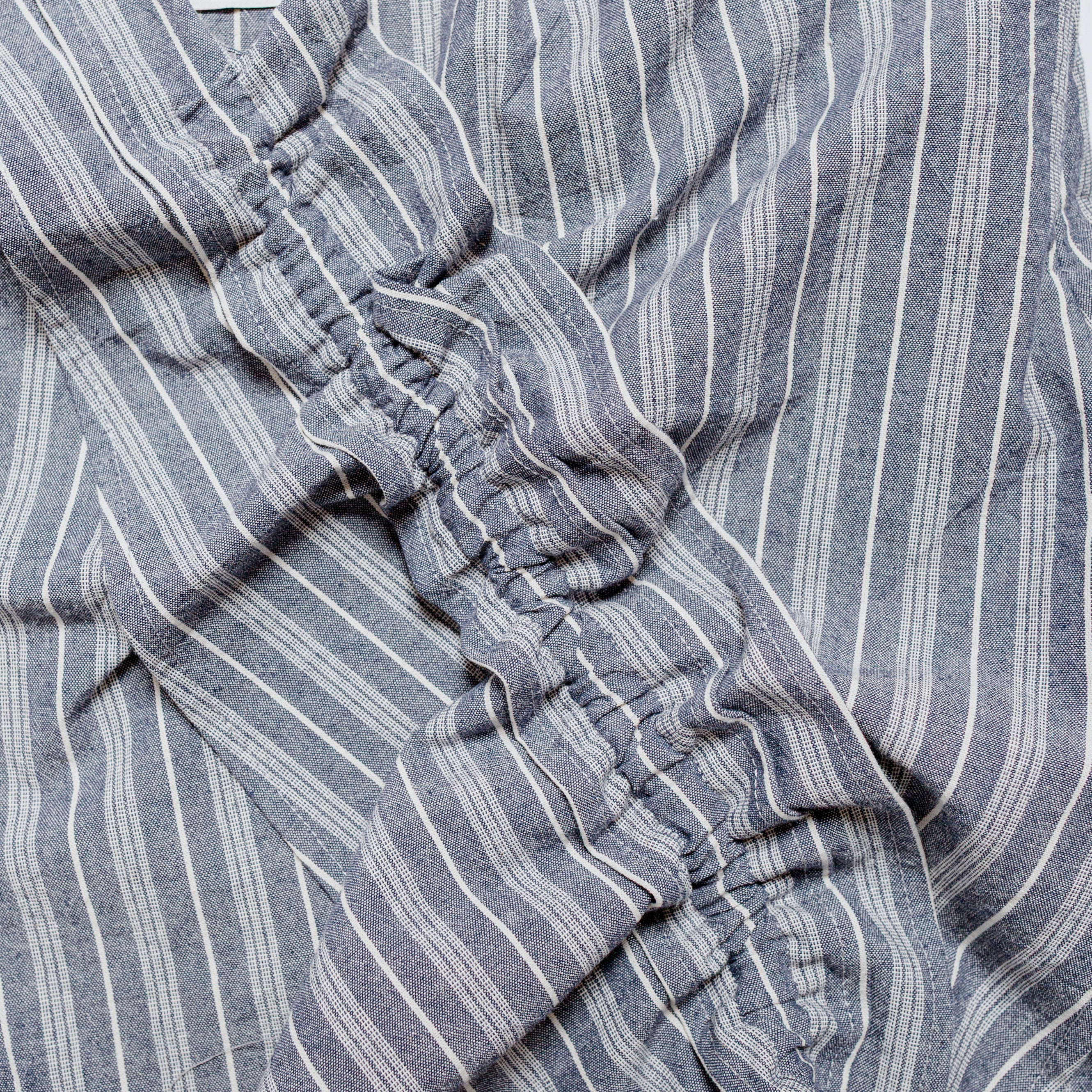 Made in a Japanese striped cotton, this fabric is lightweight and breathable. The indigo stripes add a playful contrast with the ruffles.