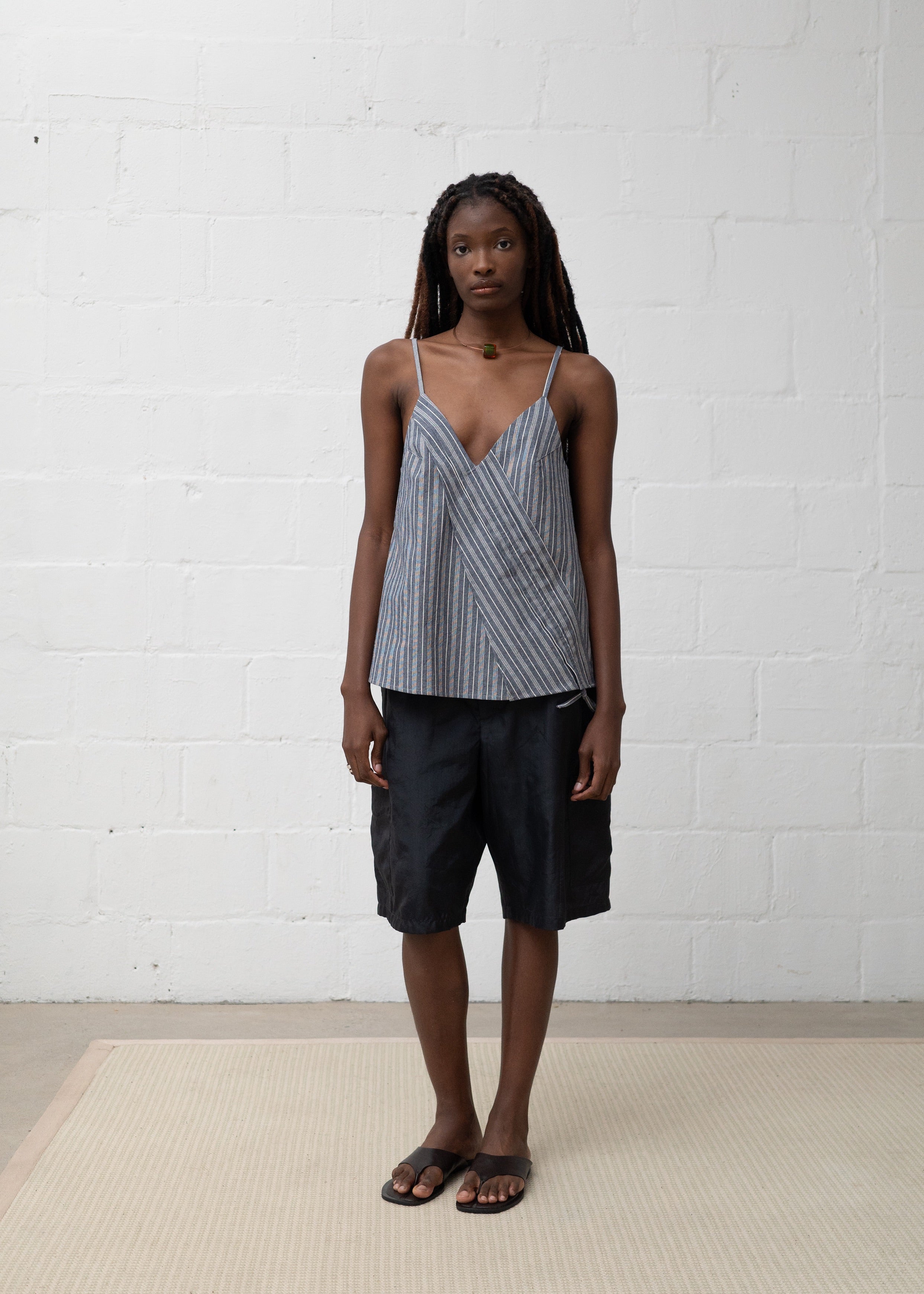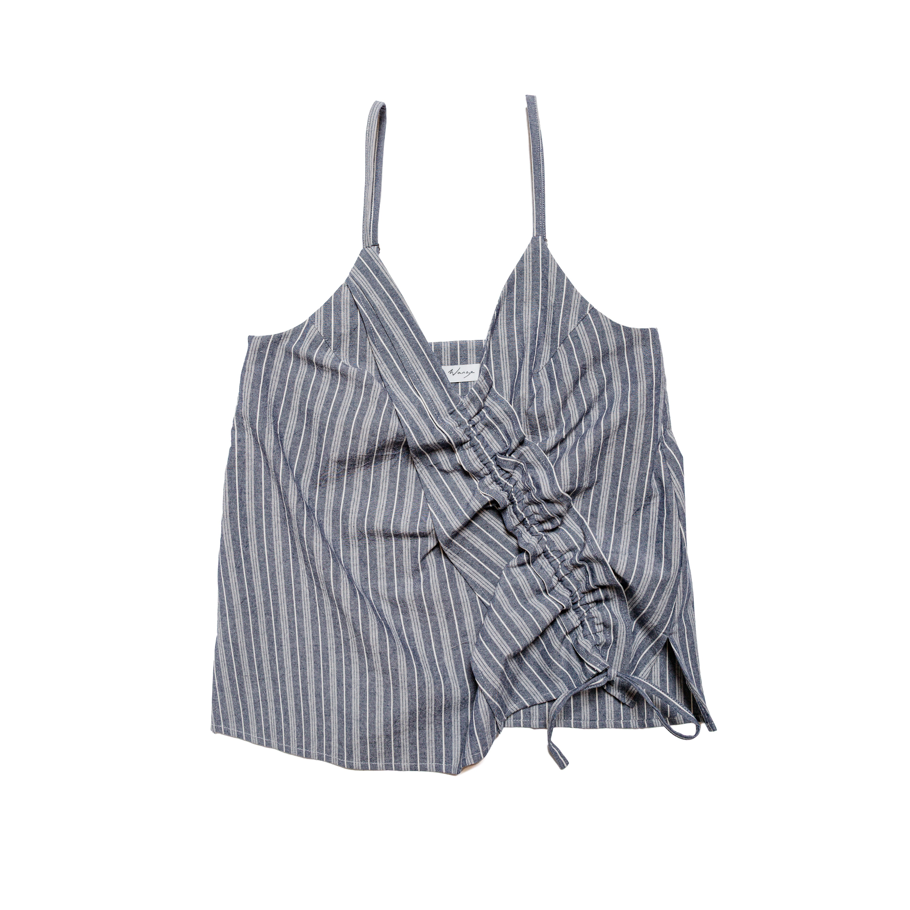 An elevated staple, this camisole tank offers a flared silhouette. Wide strips of fabric adorn the front from the v-neckline to the hem, which can be cinched to create ruffles down the body. Bust darts add shaping while a lining piece adds support and coverage for the bust. An invisible zip closure at the side allows for ease of access.
