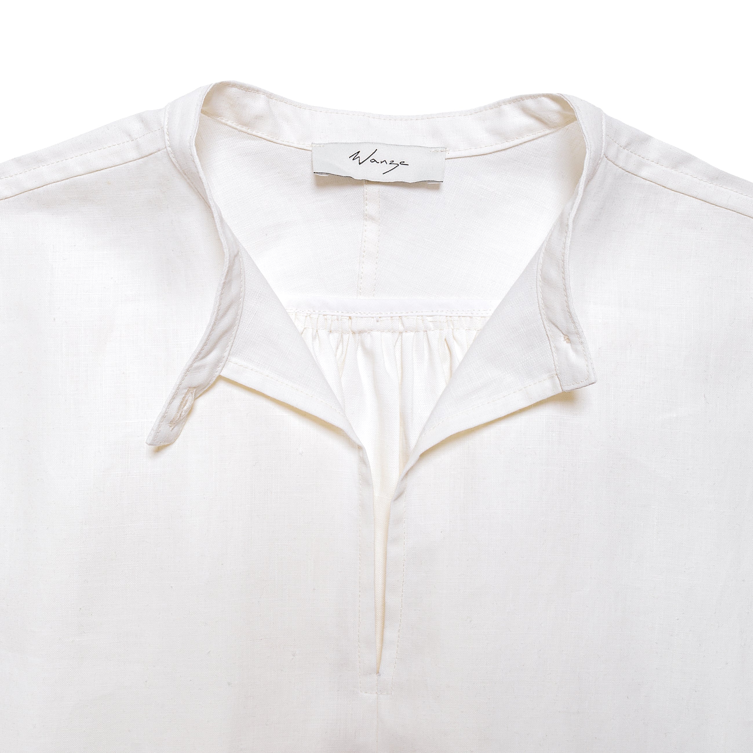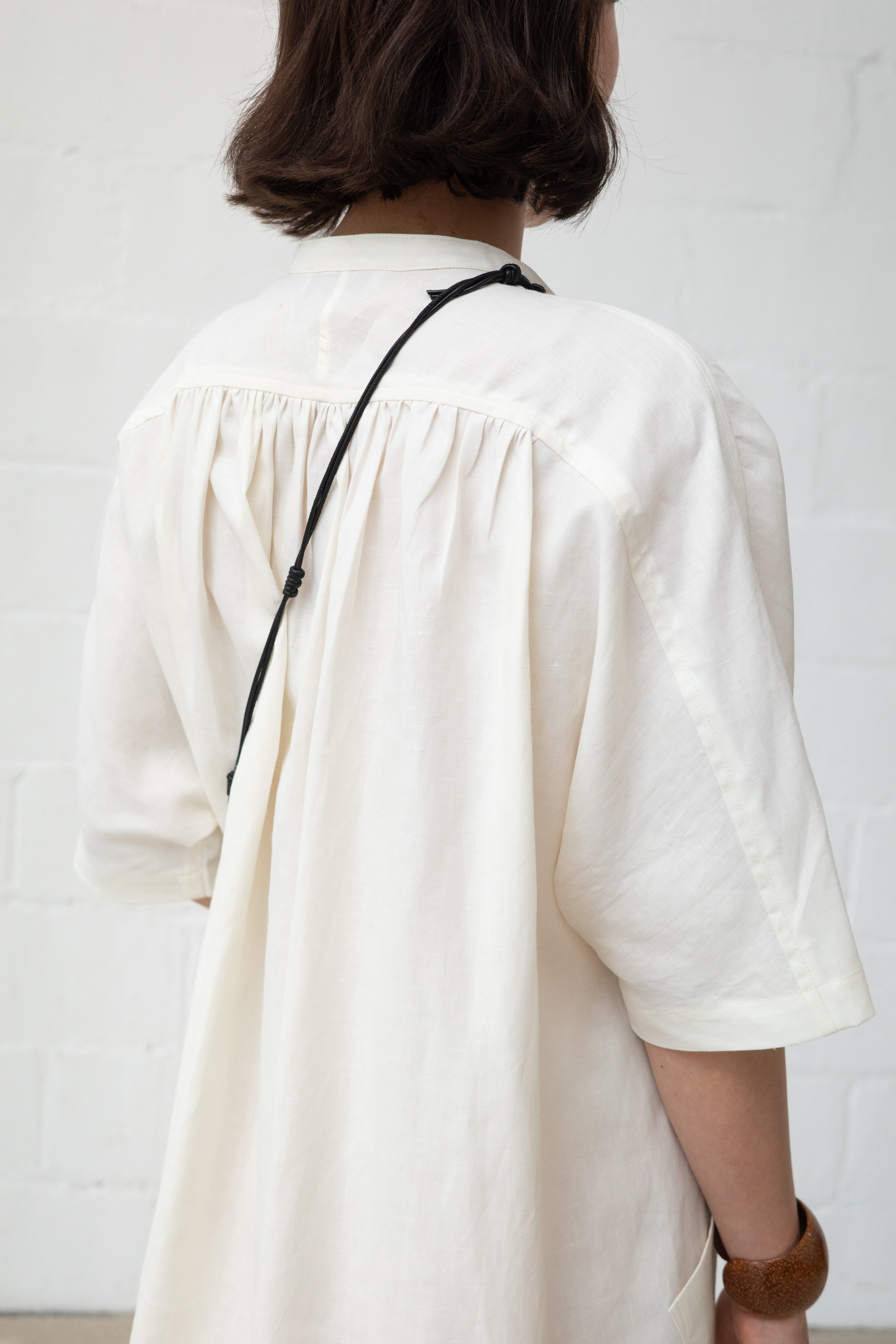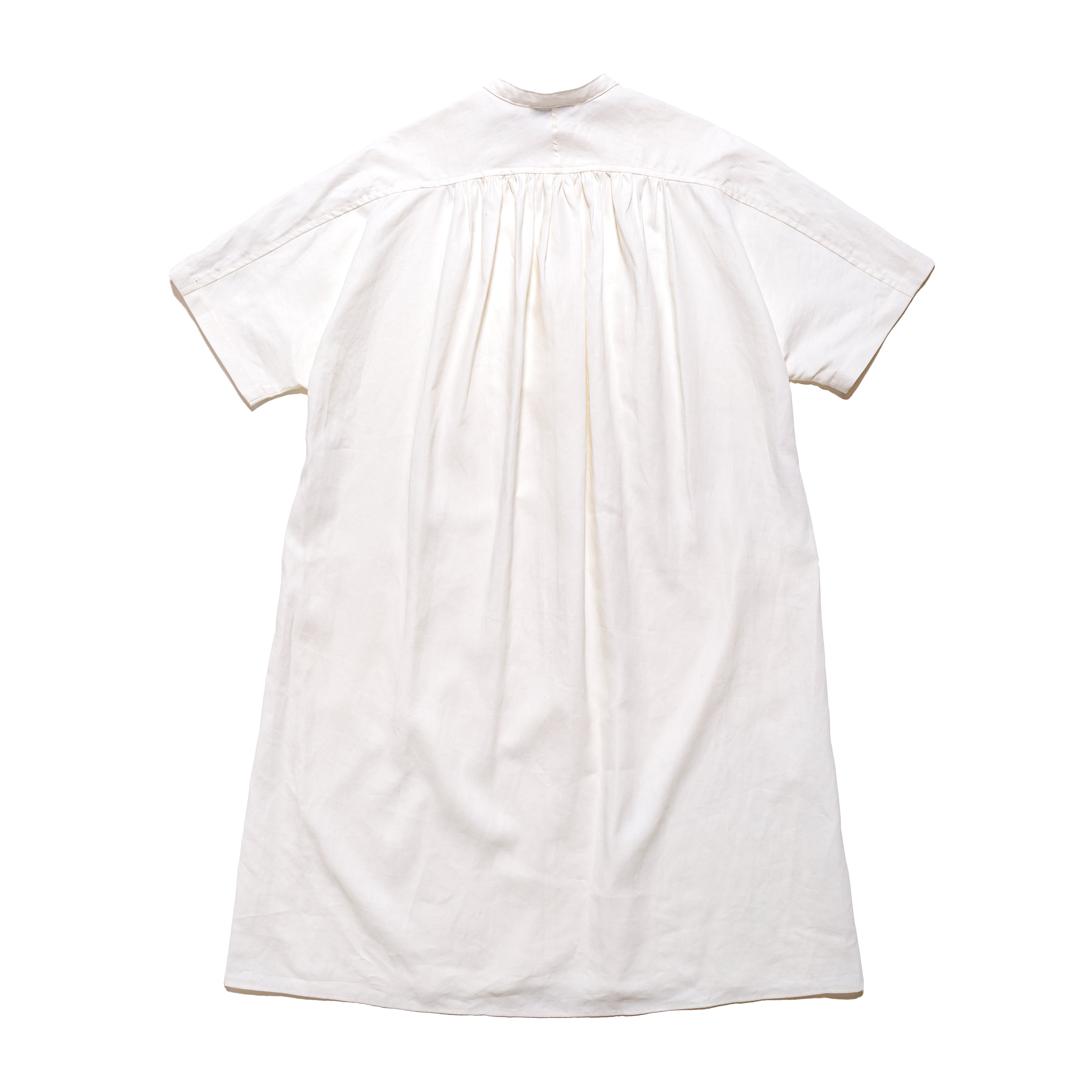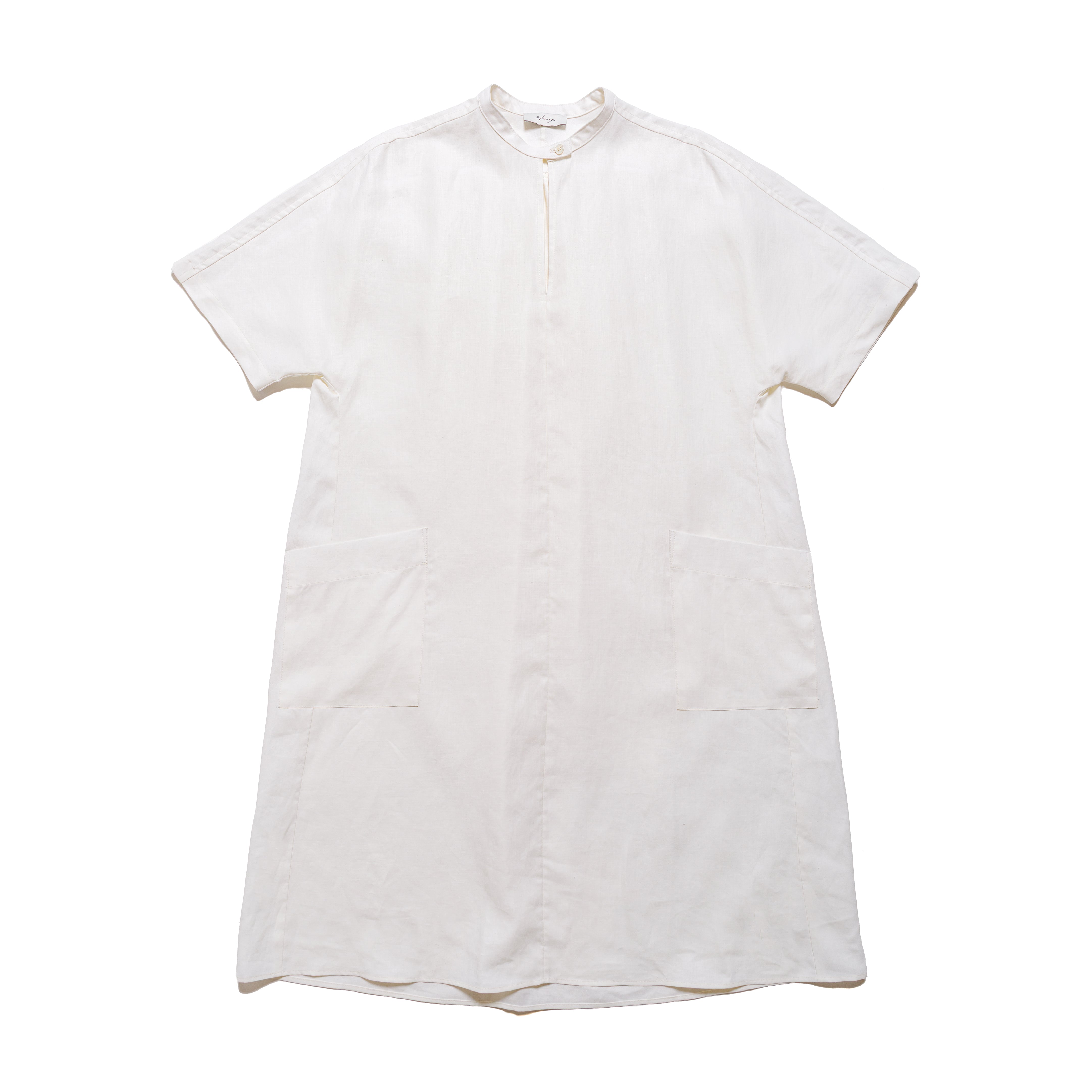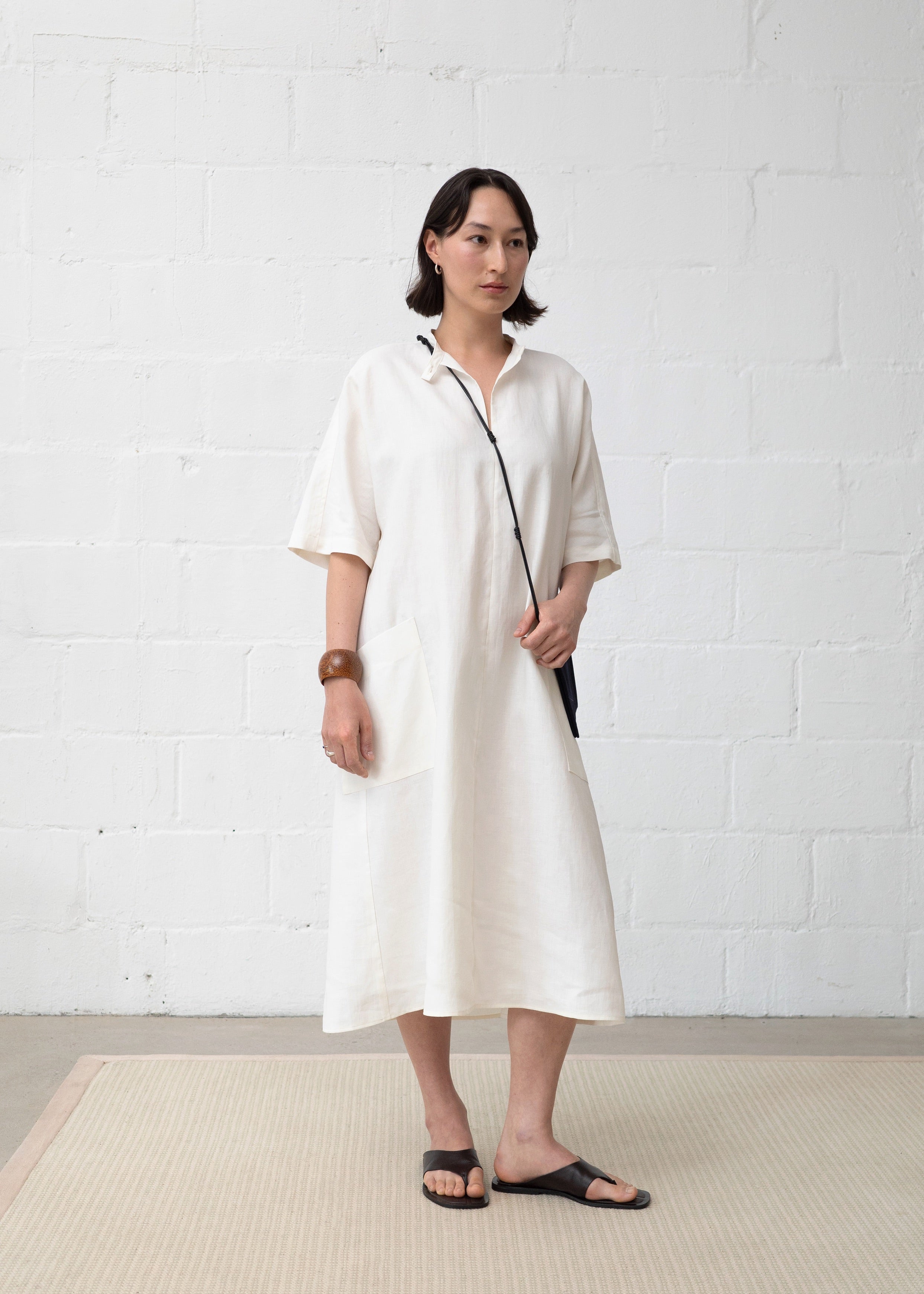 Easy and clean, this dress has a relaxed fit. Kimono sleeves give a seamless appearance, ending just above the elbow. Gathers at the back add volume while patch pockets at the waist slant subtly down towards the back. A slit at the front neck is finished with a buttoned neckband closure.
