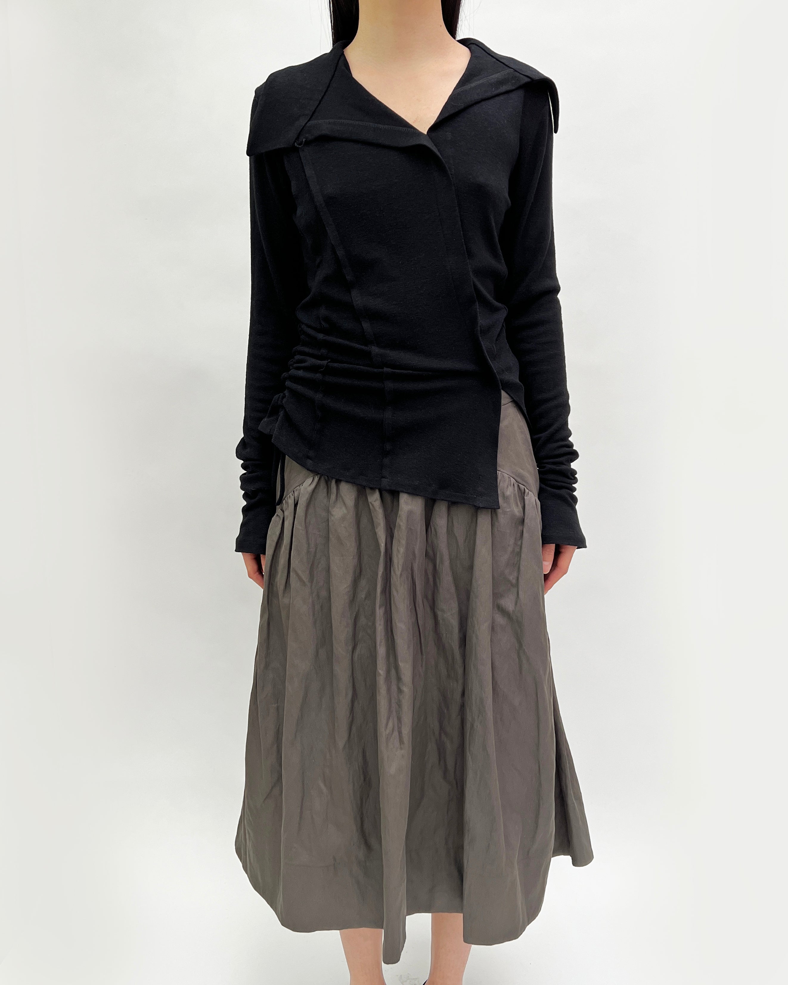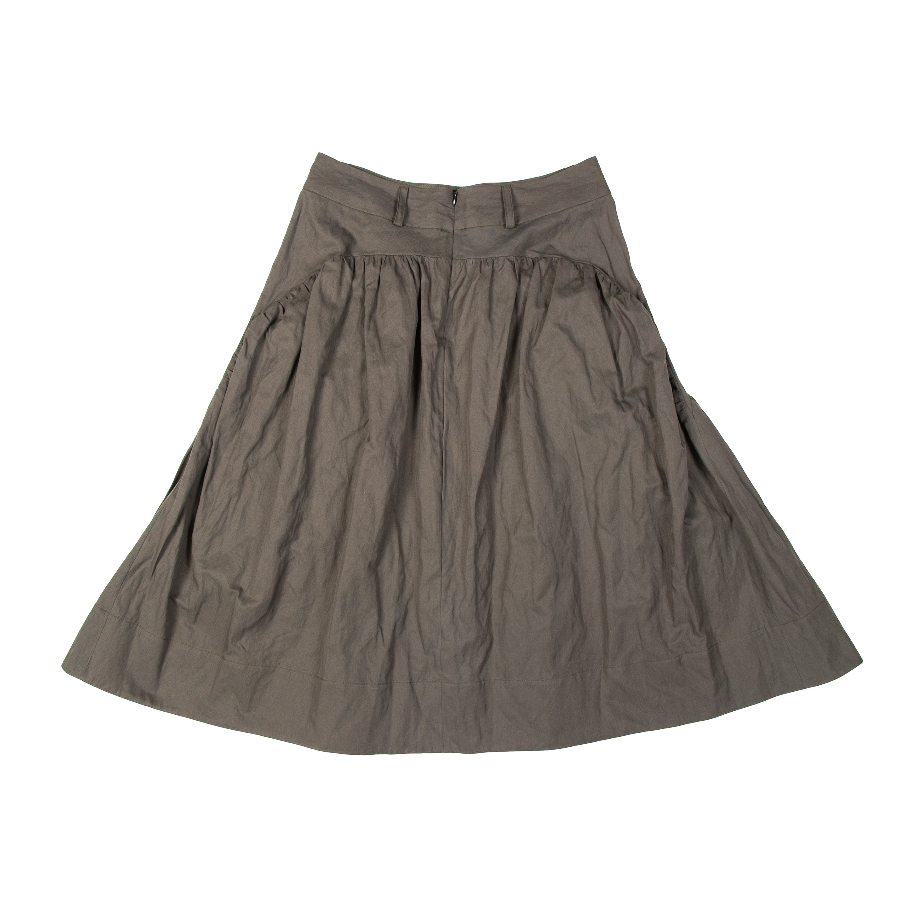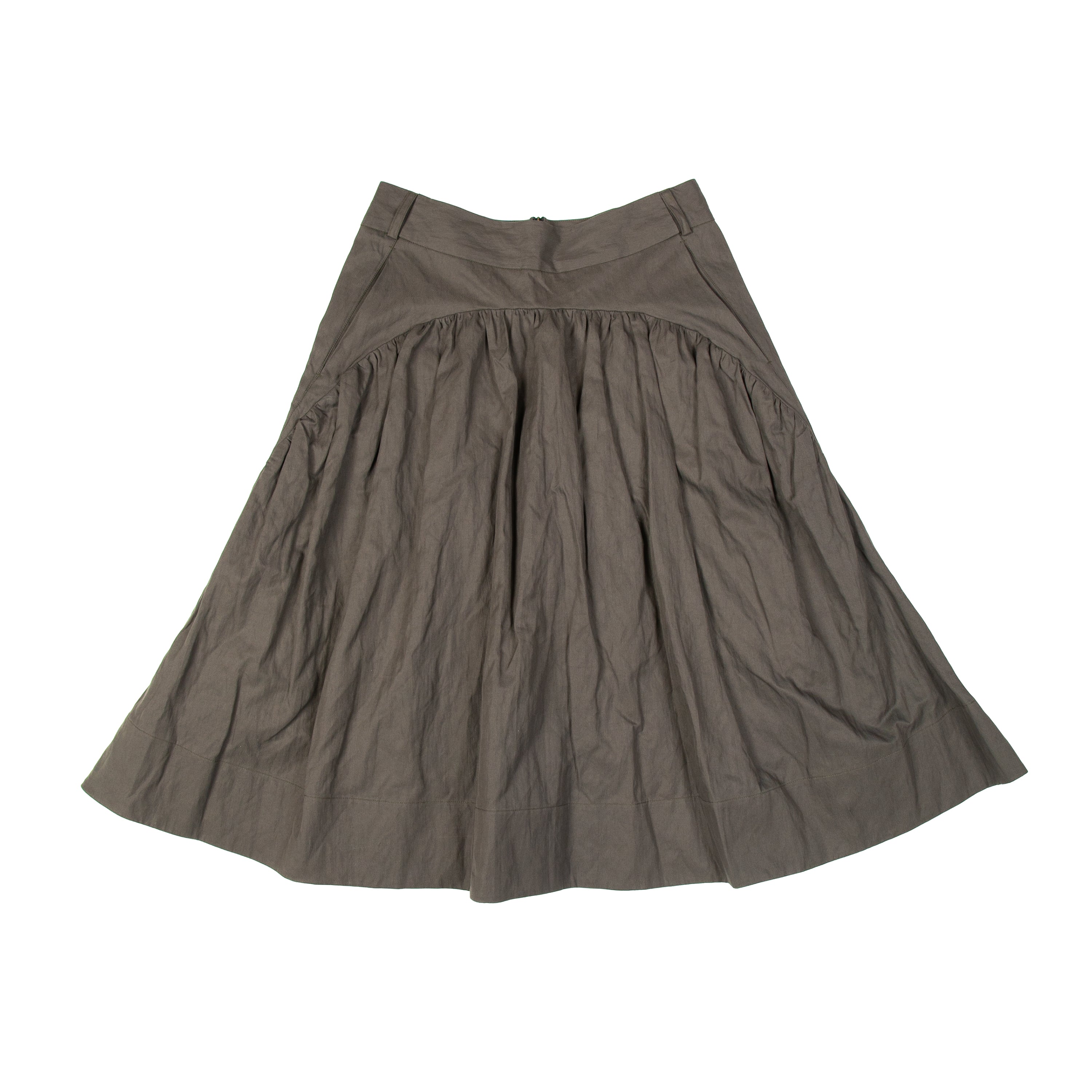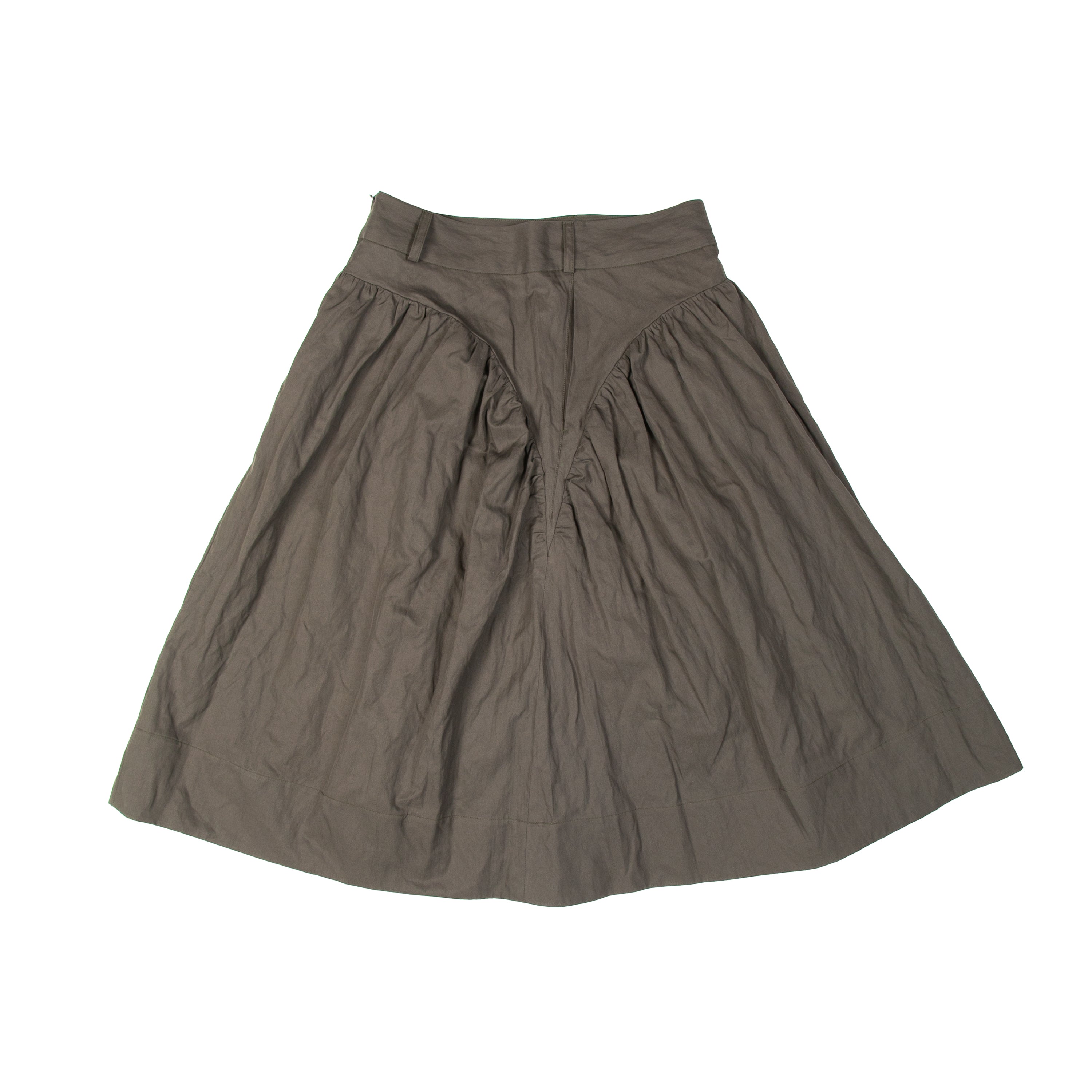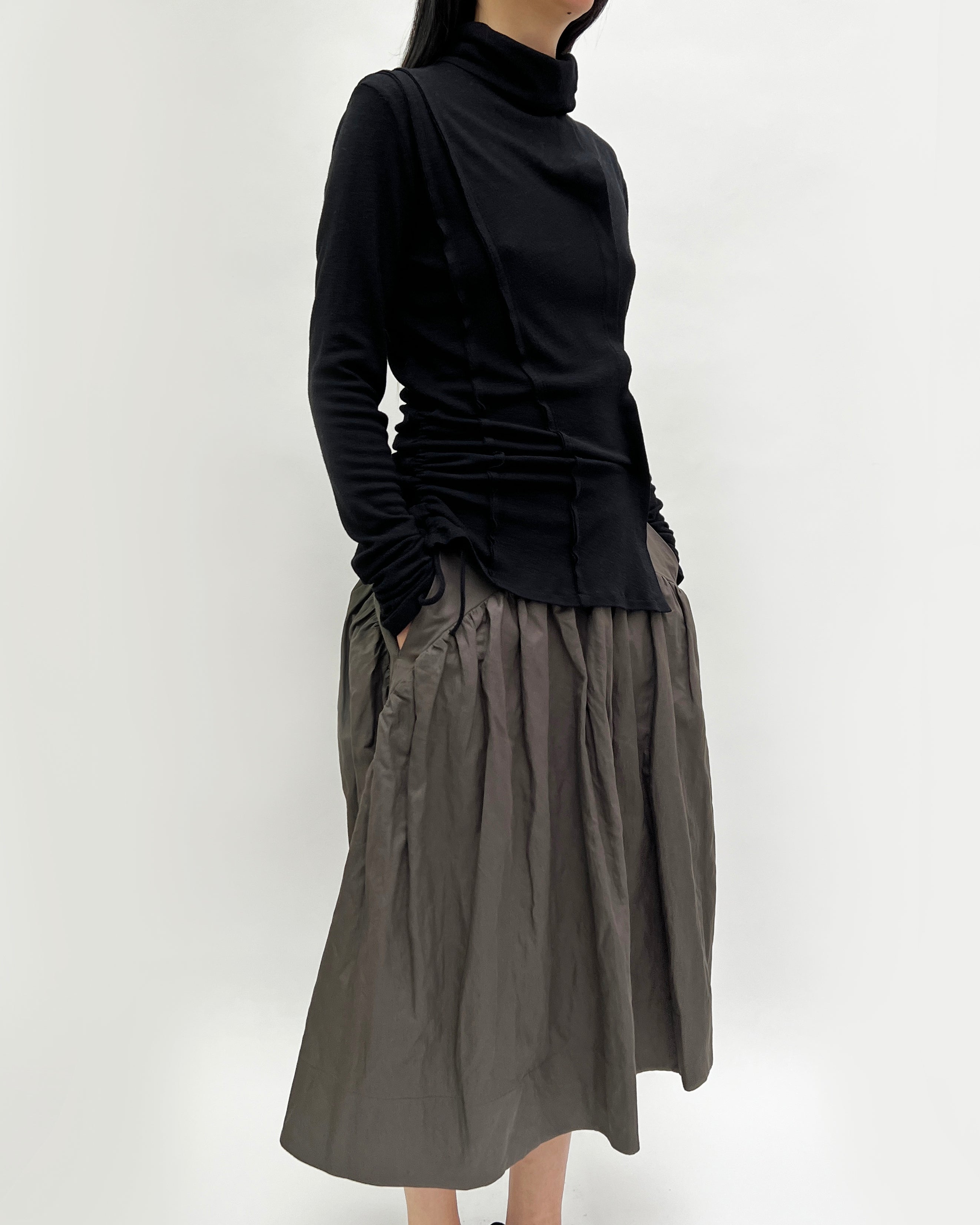 A gathered midi skirt with an haute couture feel to it. The skirt features a curved waist panel with two inseam pockets, belt loops, and an invisible zipper at the centre back. With fullness in volume and length, this piece showcases ultimate flare and movement.