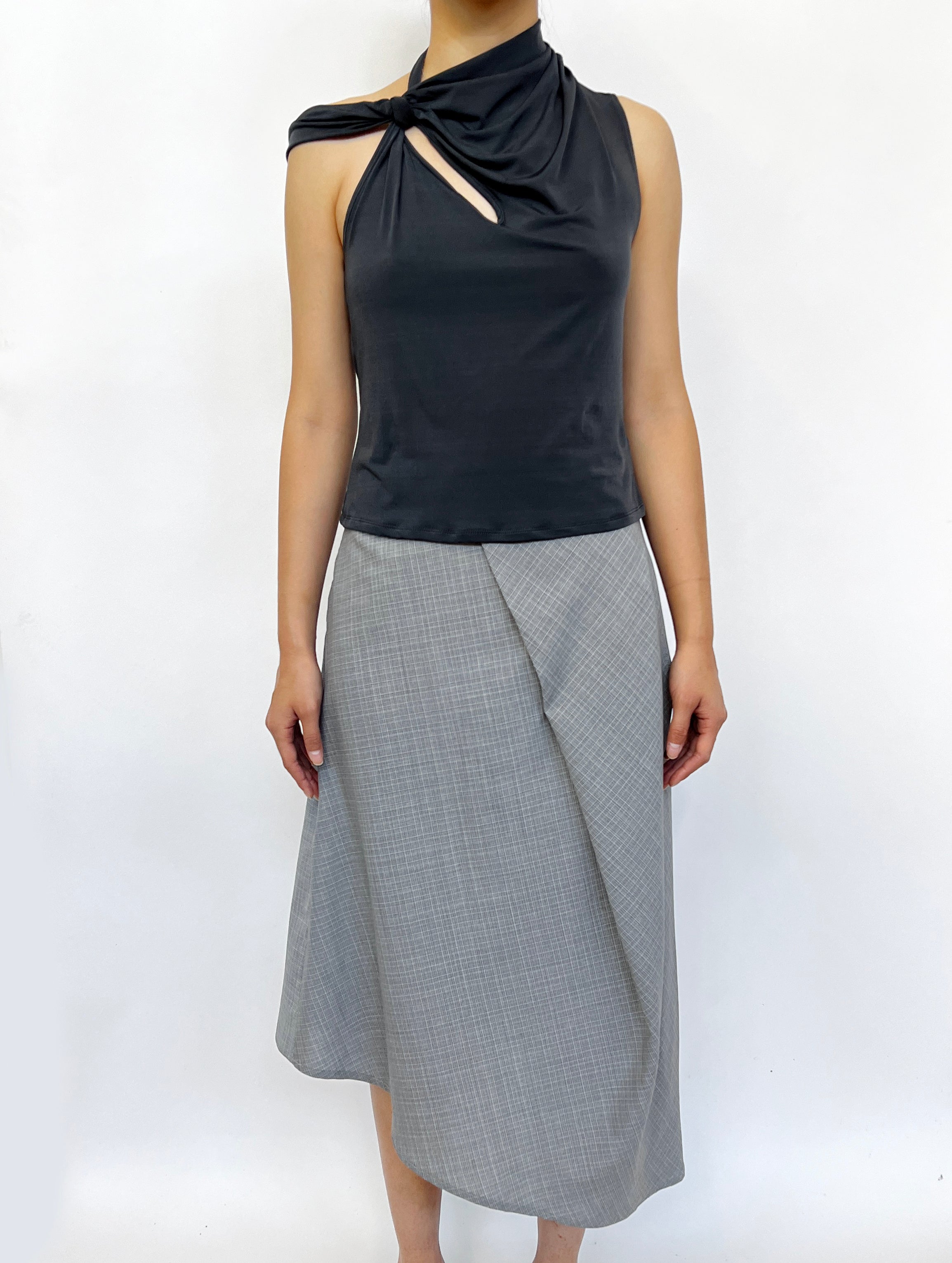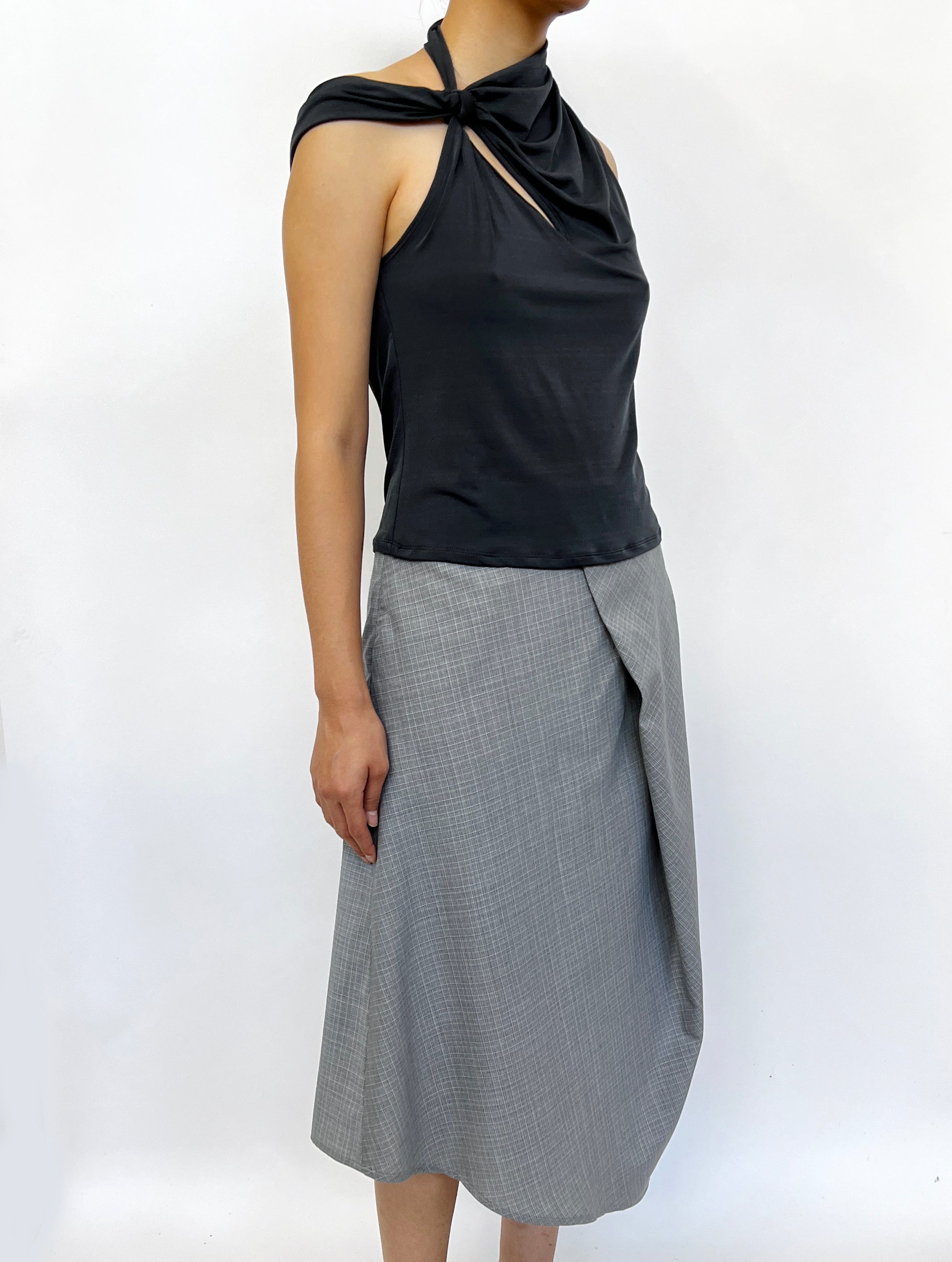 Developed through draping, this skirt has an A-line silhouette and asymmetric hem. Featuring a statement pleat at the front and back, this skirt is a minimal and sleek piece that drapes effortlessly on the body. An invisible zipper closure at the side adds a subdued finishing to the skirt. The original shape feels like a wearable piece of origami.