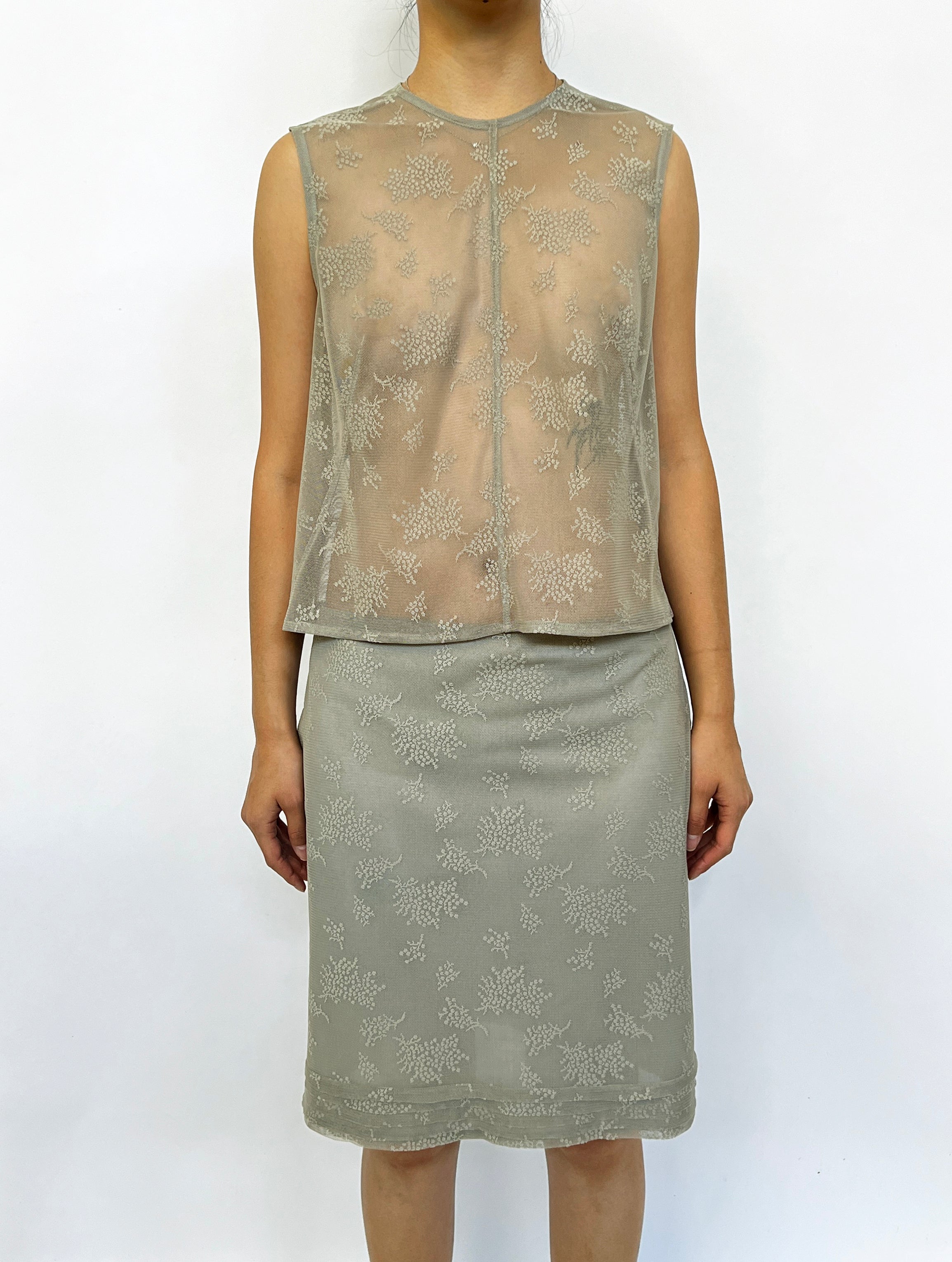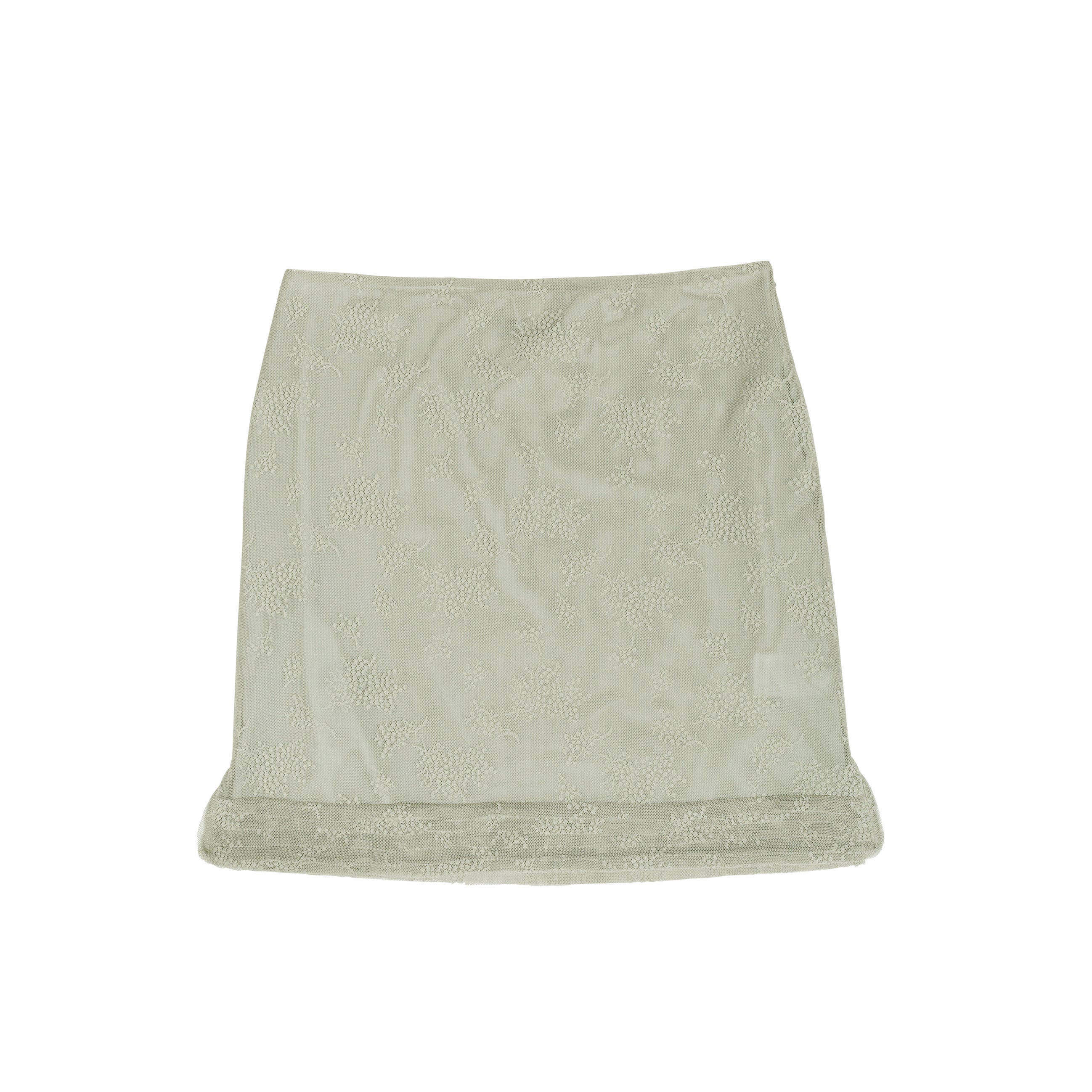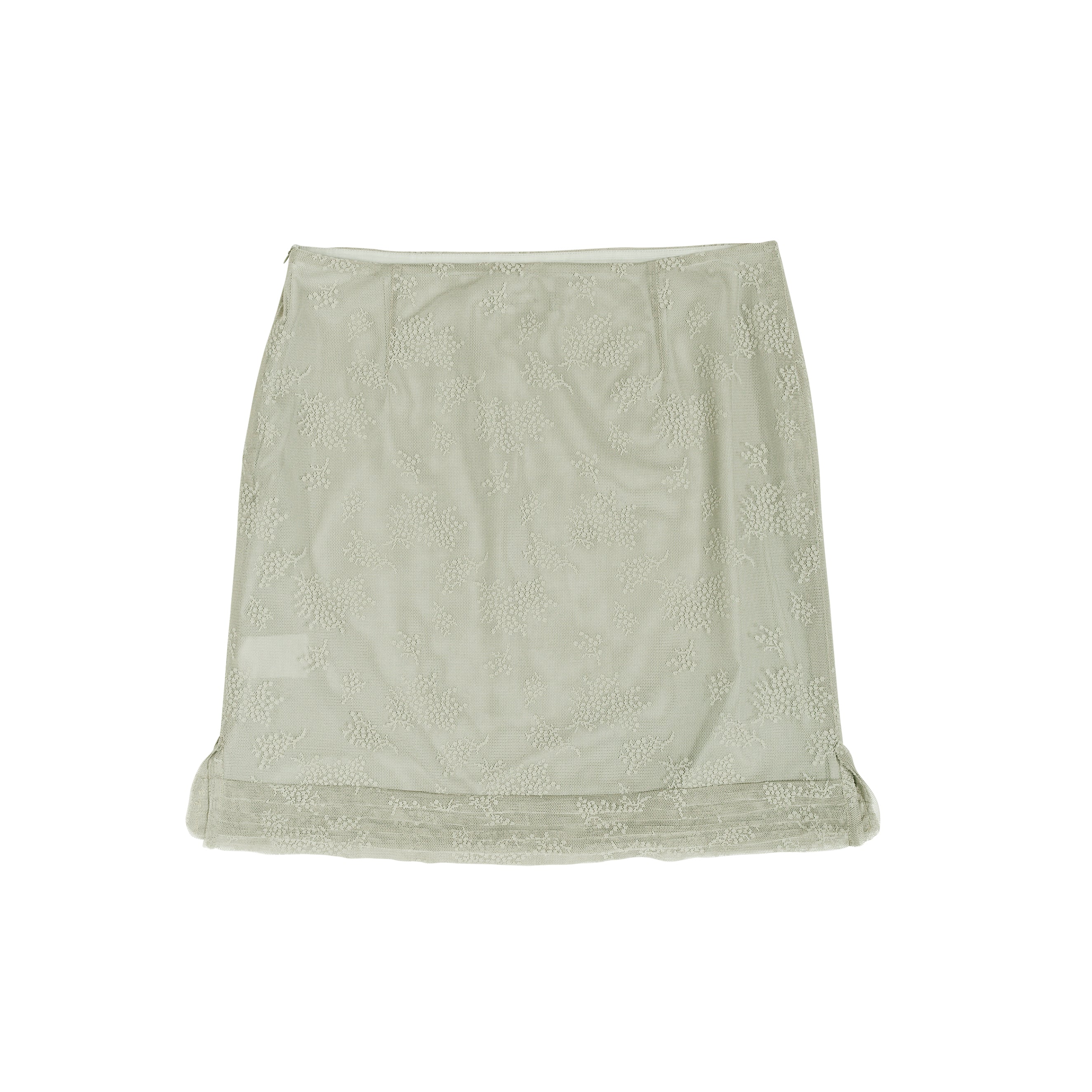 Inspired by the classic slip, this skirt offers a low-waisted relaxed fit and ends just below the knee. Strips of tulle finish the hem, with slits at the side for ease of movement. An invisible zipper closure at the side is encased between the tulle and the lining, providing a clean finish. The skirt feels fresh with details like the raw hem, and adds an ethereal touch to any outfit. Made in a jacquard tulle and lined in a wool voile, the jade green tulle compliments the light blue voile, softening the subtle floral pattern of the jacquard. The sheerness of the tulle provides an airy feel while the lining adds coverage underneath. This slip skirt is a lightweight piece perfect for warm summer days.