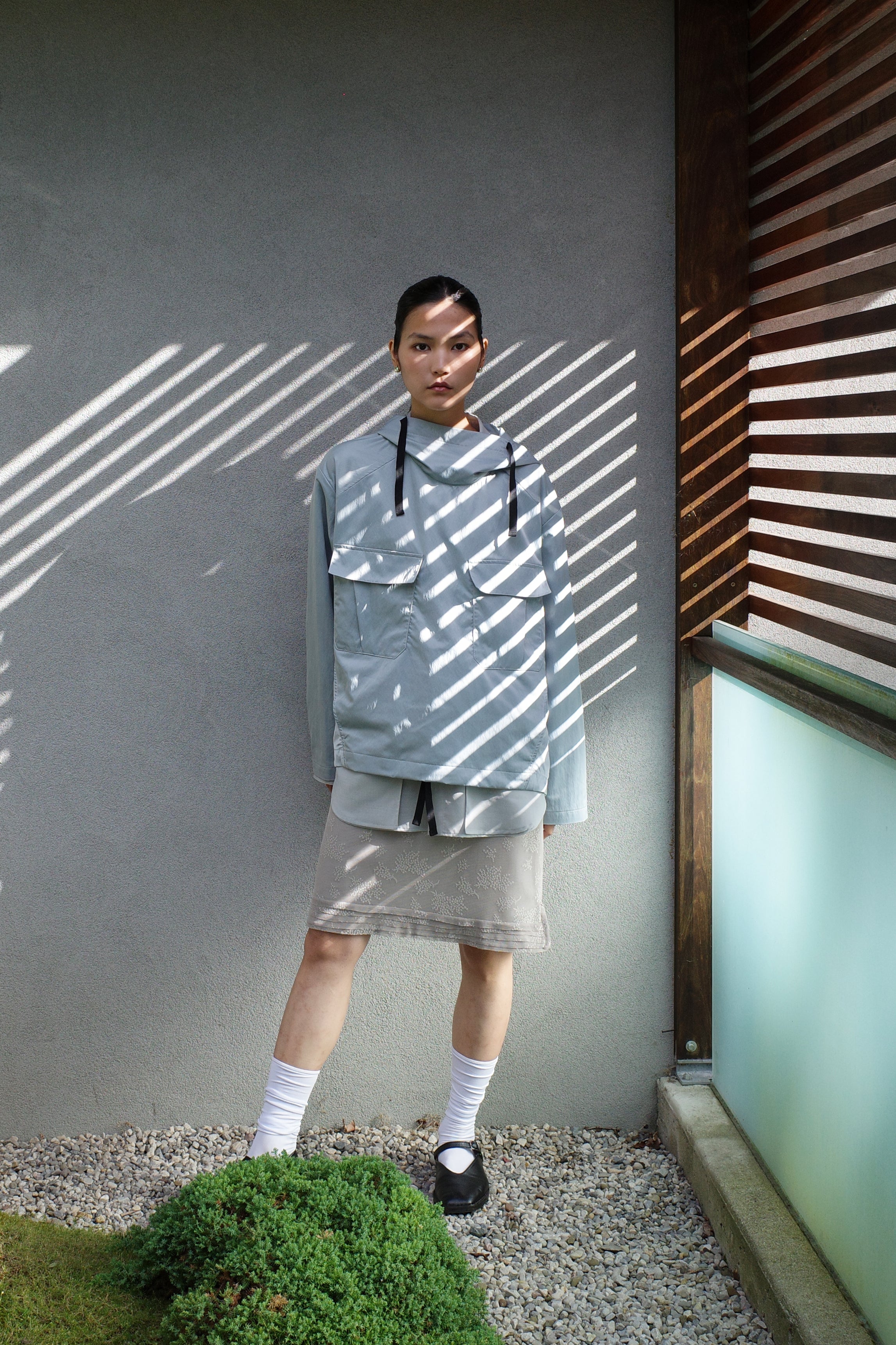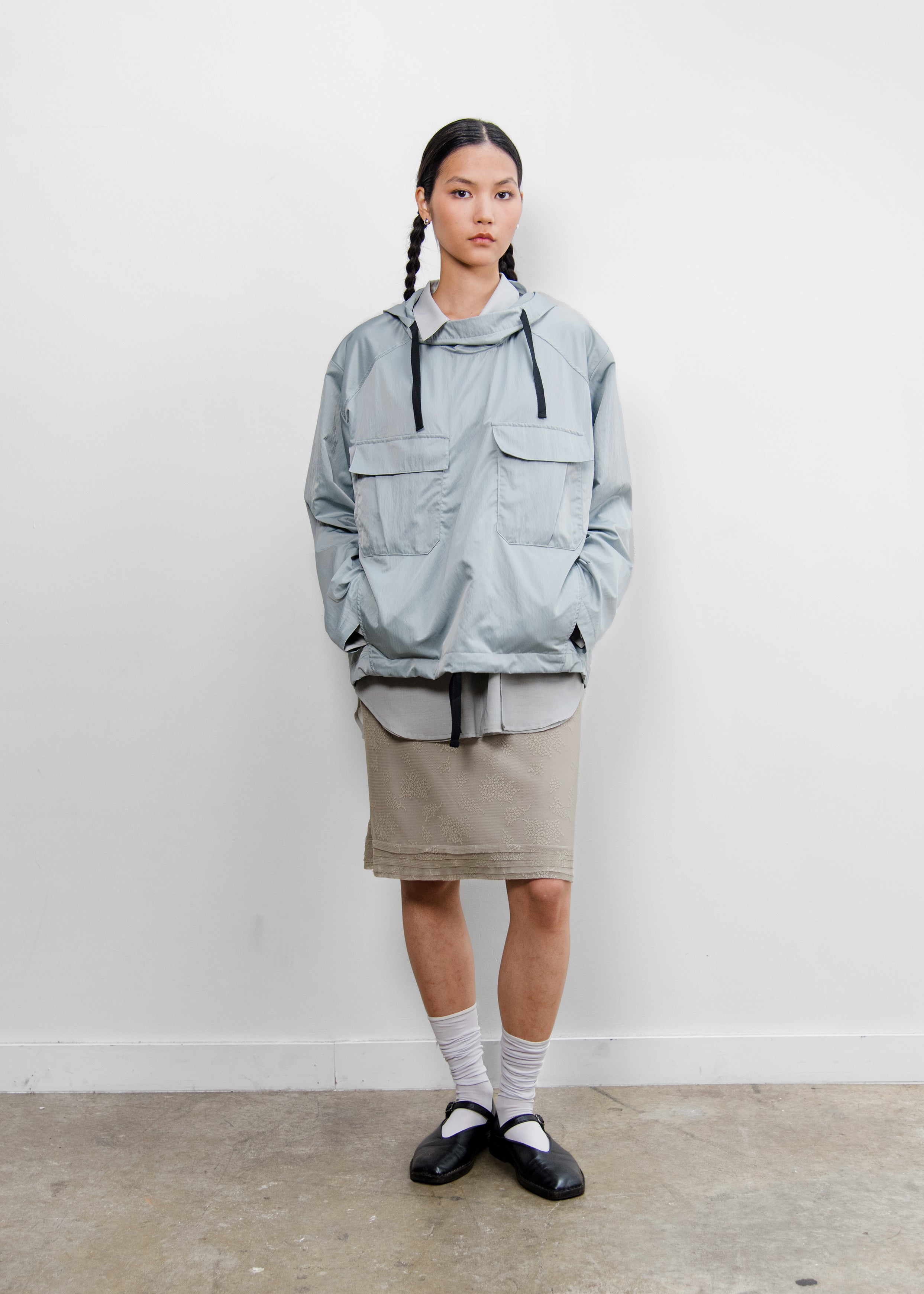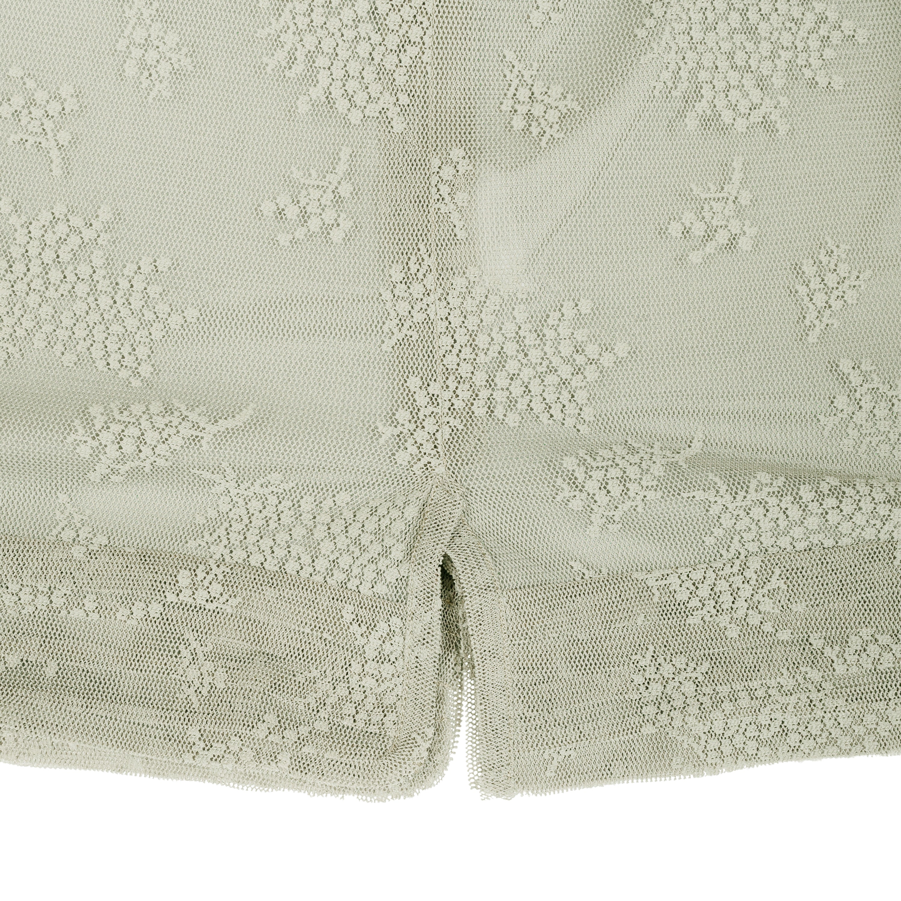 Inspired by the classic slip, this skirt offers a low-waisted relaxed fit and ends just below the knee. Strips of tulle finish the hem, with slits at the side for ease of movement. An invisible zipper closure at the side is encased between the tulle and the lining, providing a clean finish. The skirt feels fresh with details like the raw hem, and adds an ethereal touch to any outfit. Made in a jacquard tulle and lined in a wool voile, the jade green tulle compliments the light blue voile, softening the subtle floral pattern of the jacquard. The sheerness of the tulle provides an airy feel while the lining adds coverage underneath. This slip skirt is a lightweight piece perfect for warm summer days.