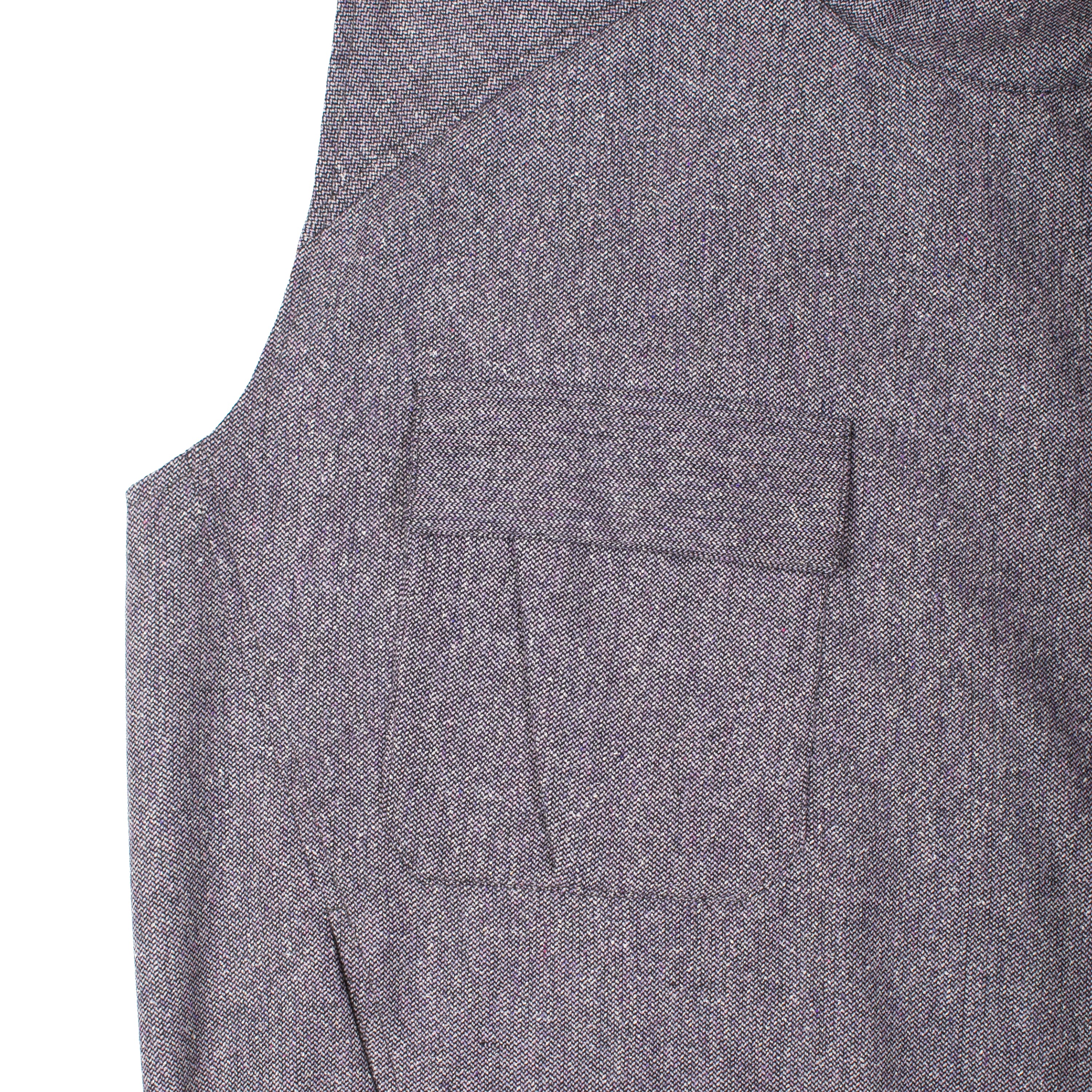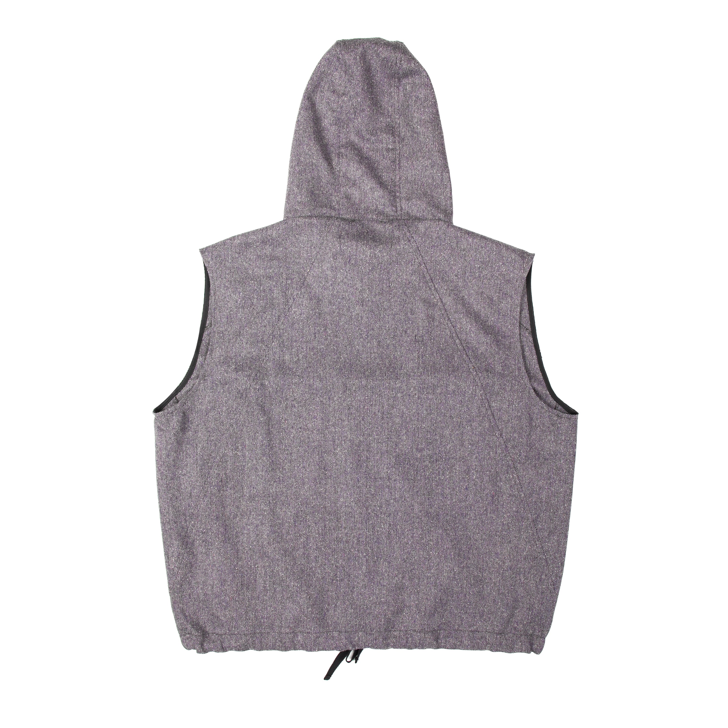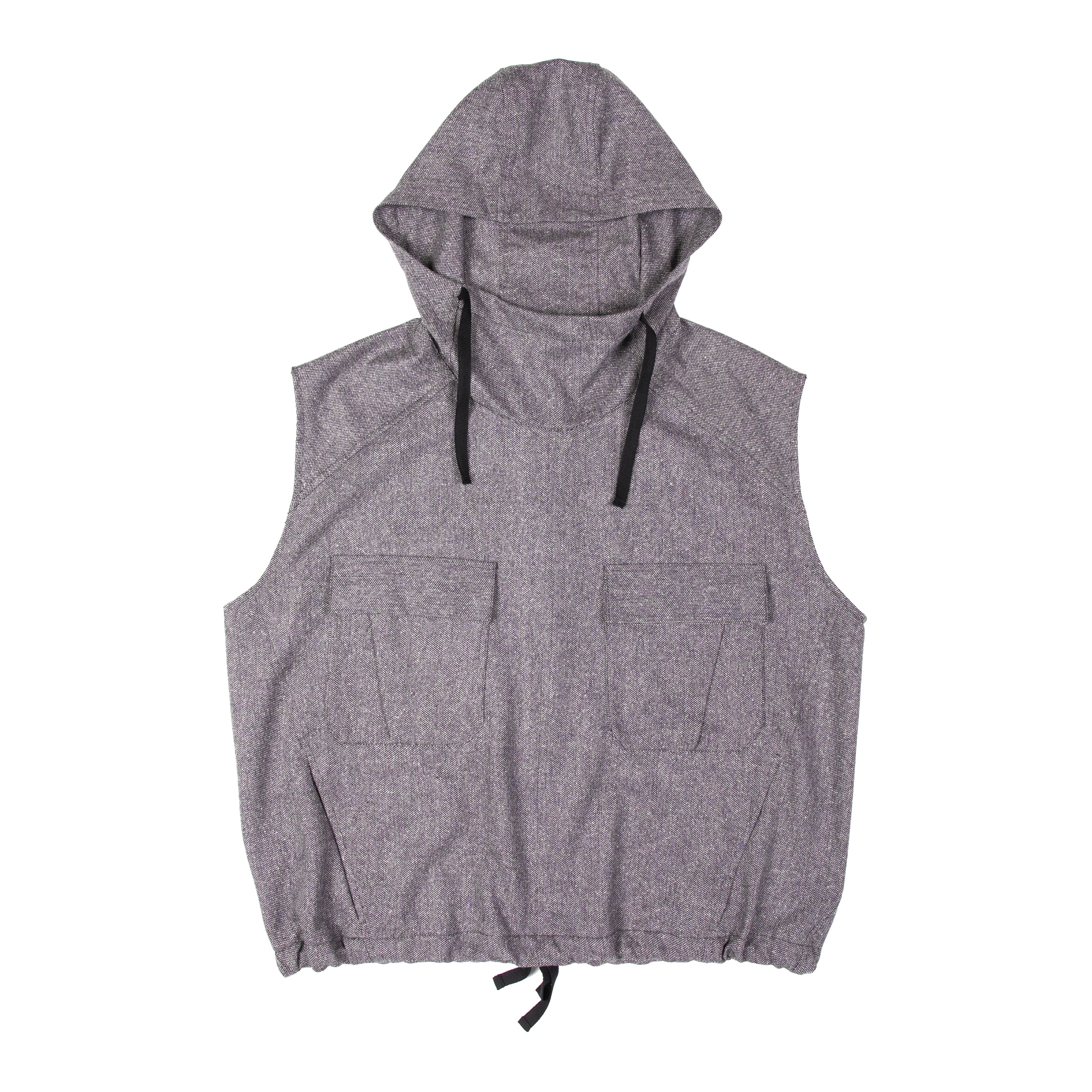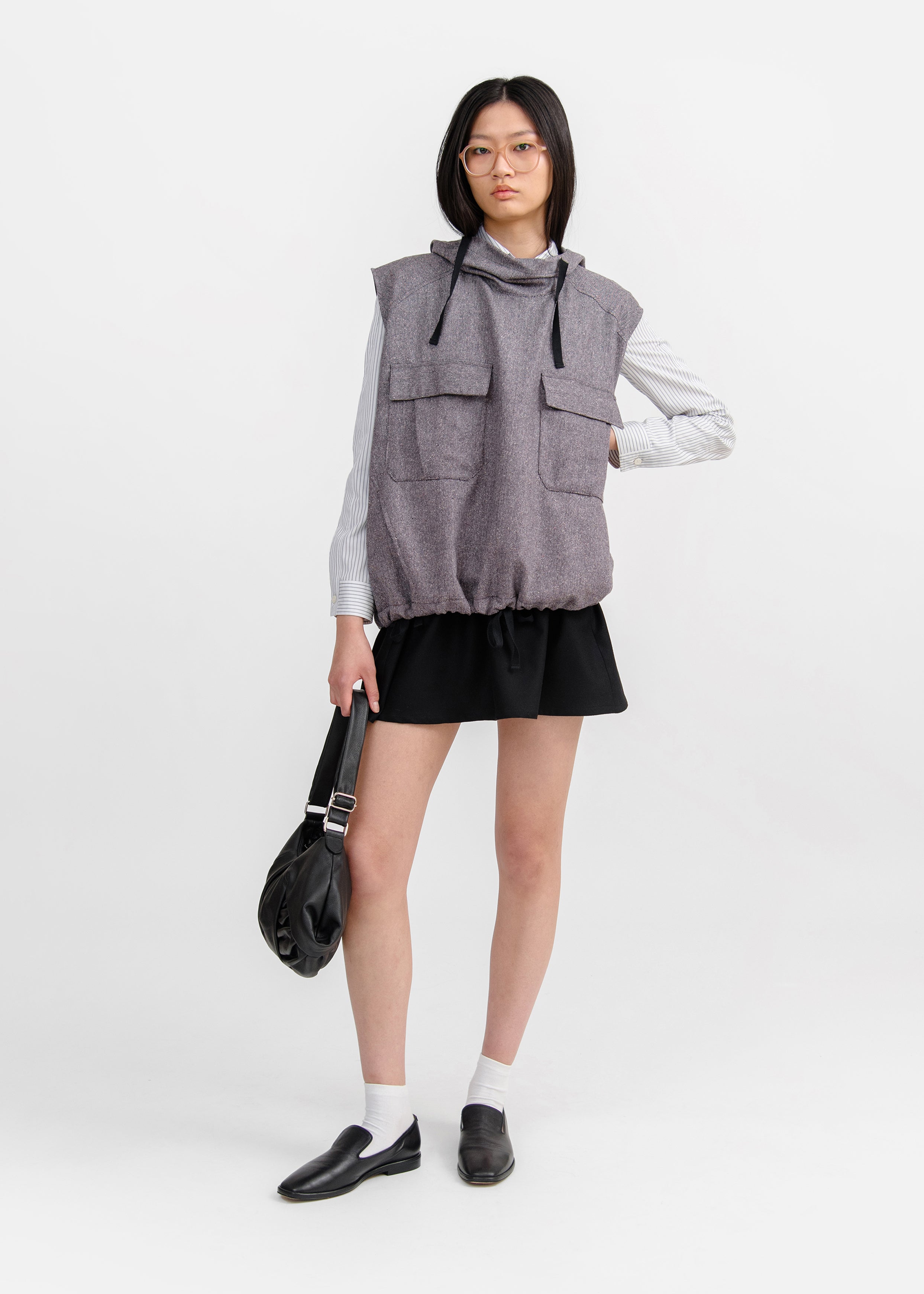 Taking inspiration from military army smocks, this vest has a relaxed and boxy fit. It features a hooded funnel neck with straps for tie closure, two pleated patch pockets on the chest, an inseam kangaroo pocket, and drawstrings at the hem.