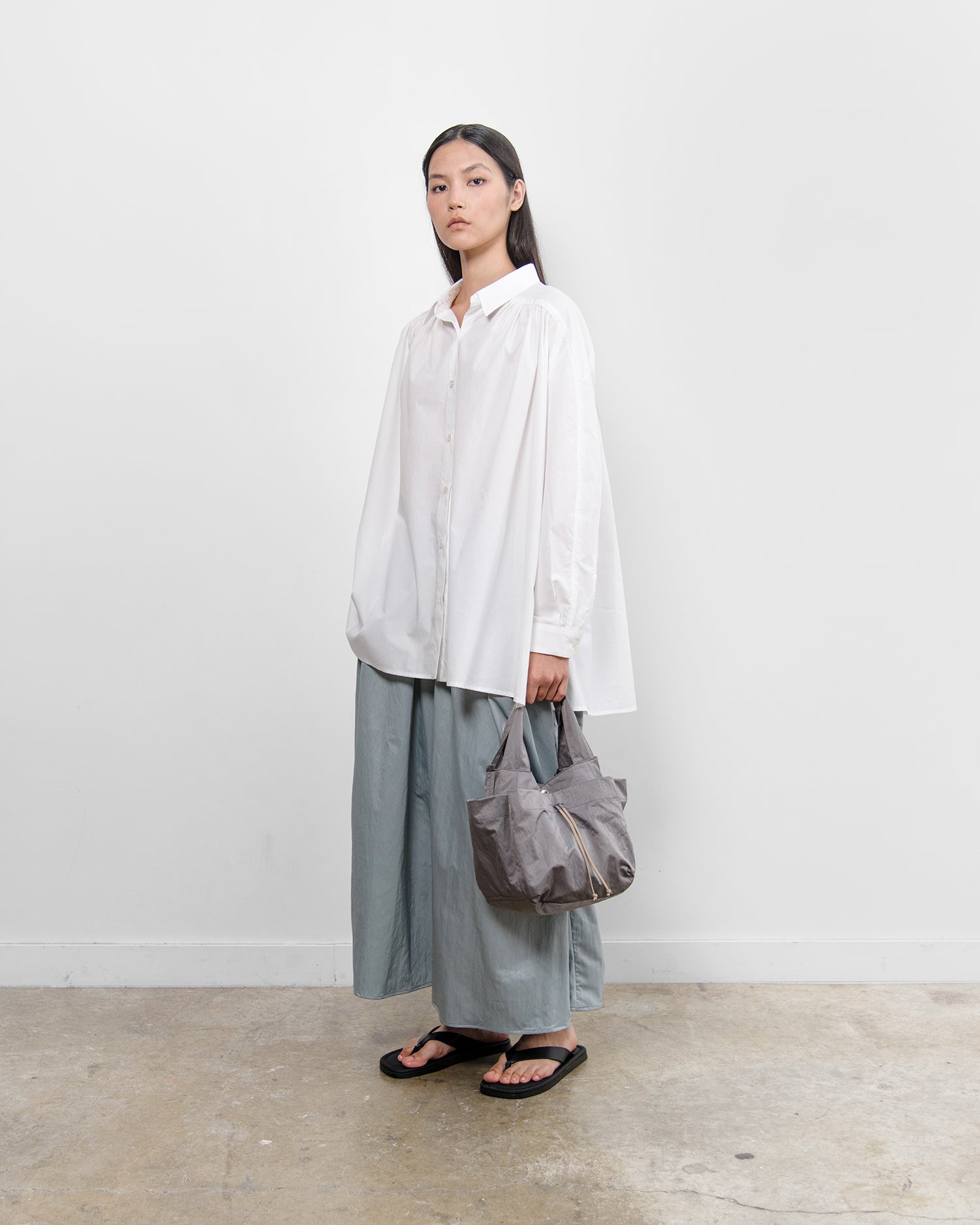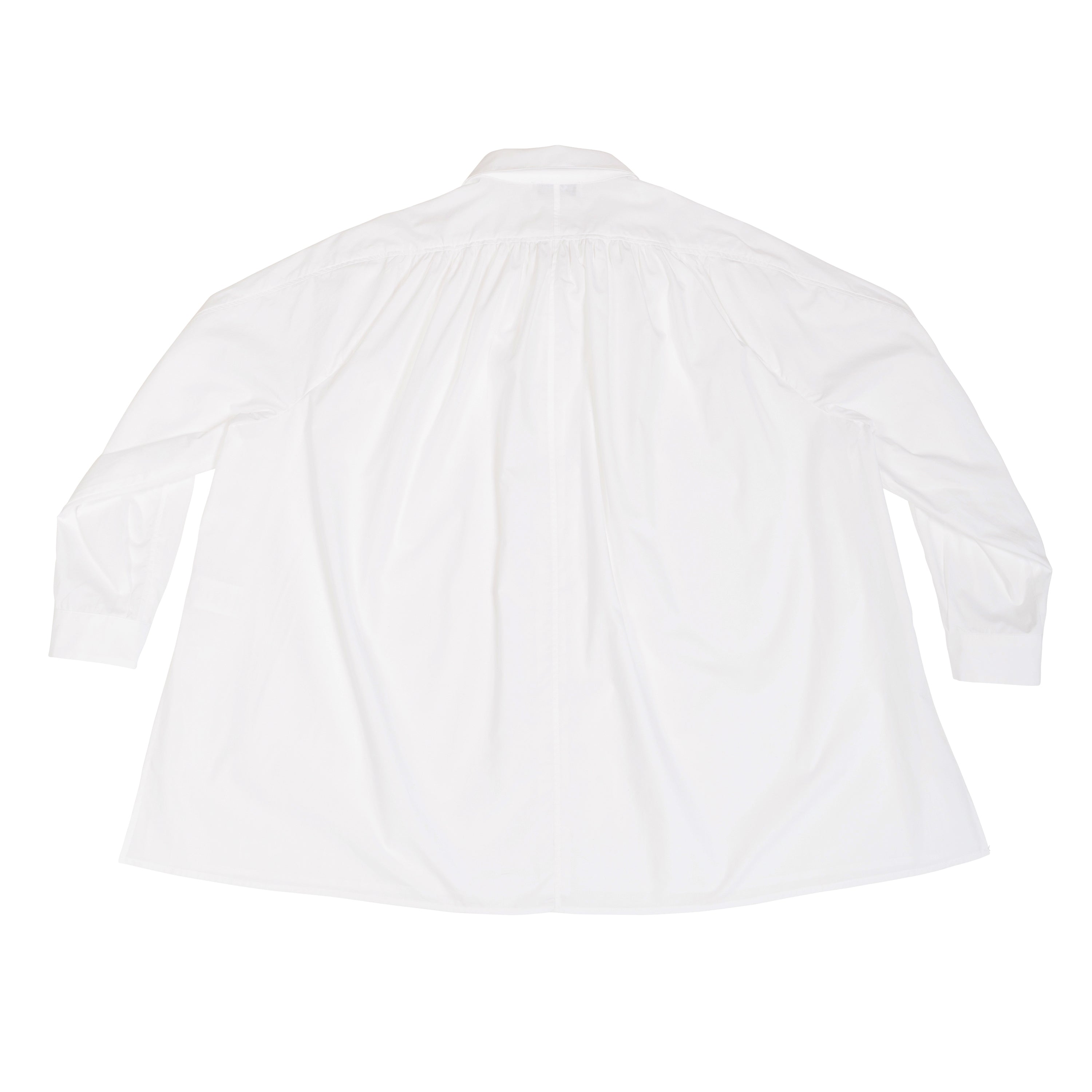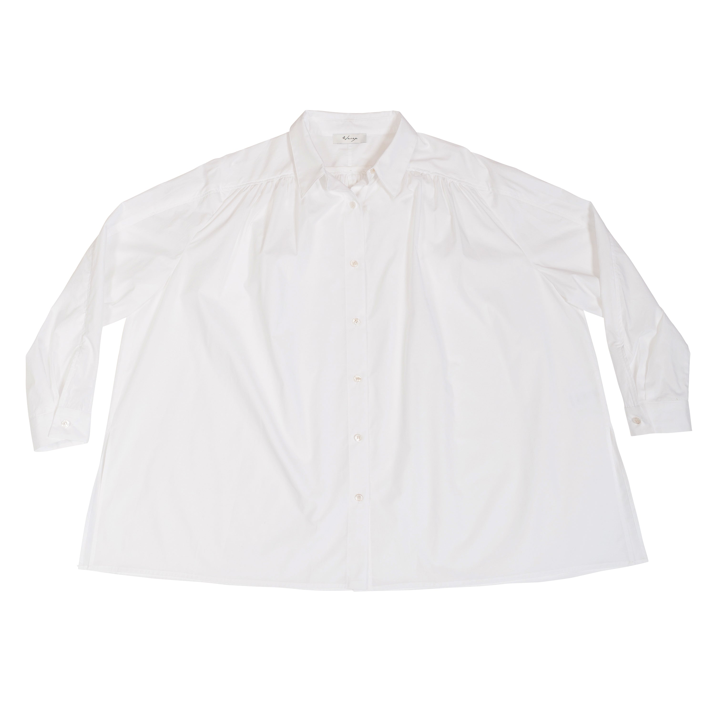 A play on the classic button up, this shirt gathers at the front and back shoulders for a billowy shape and lightweight feel. The shoulder panel extends down the sleeve for a seamless flow of the garment. Complete with a pointed collar and button up front adding a crisp finish, this easy wearing shirt is an elegant, airy staple.