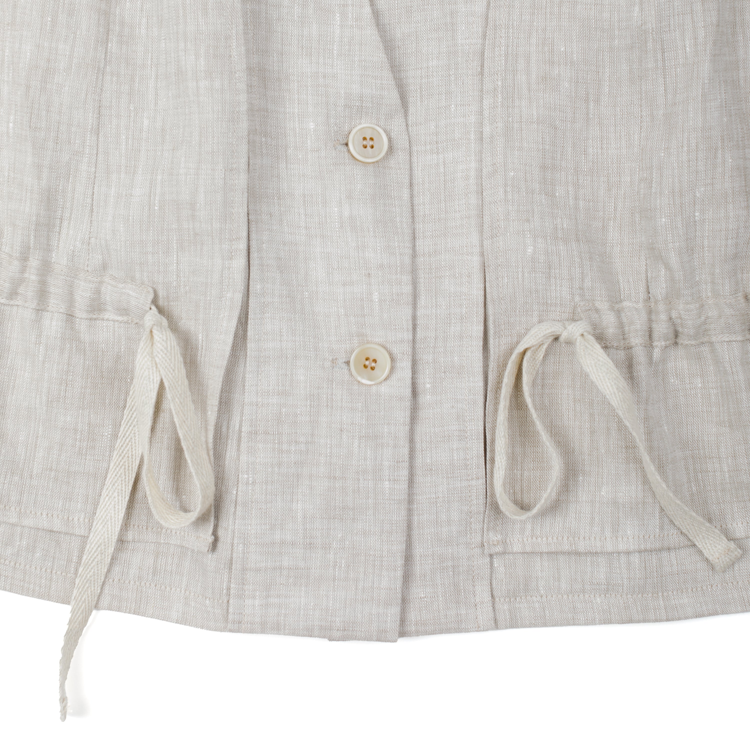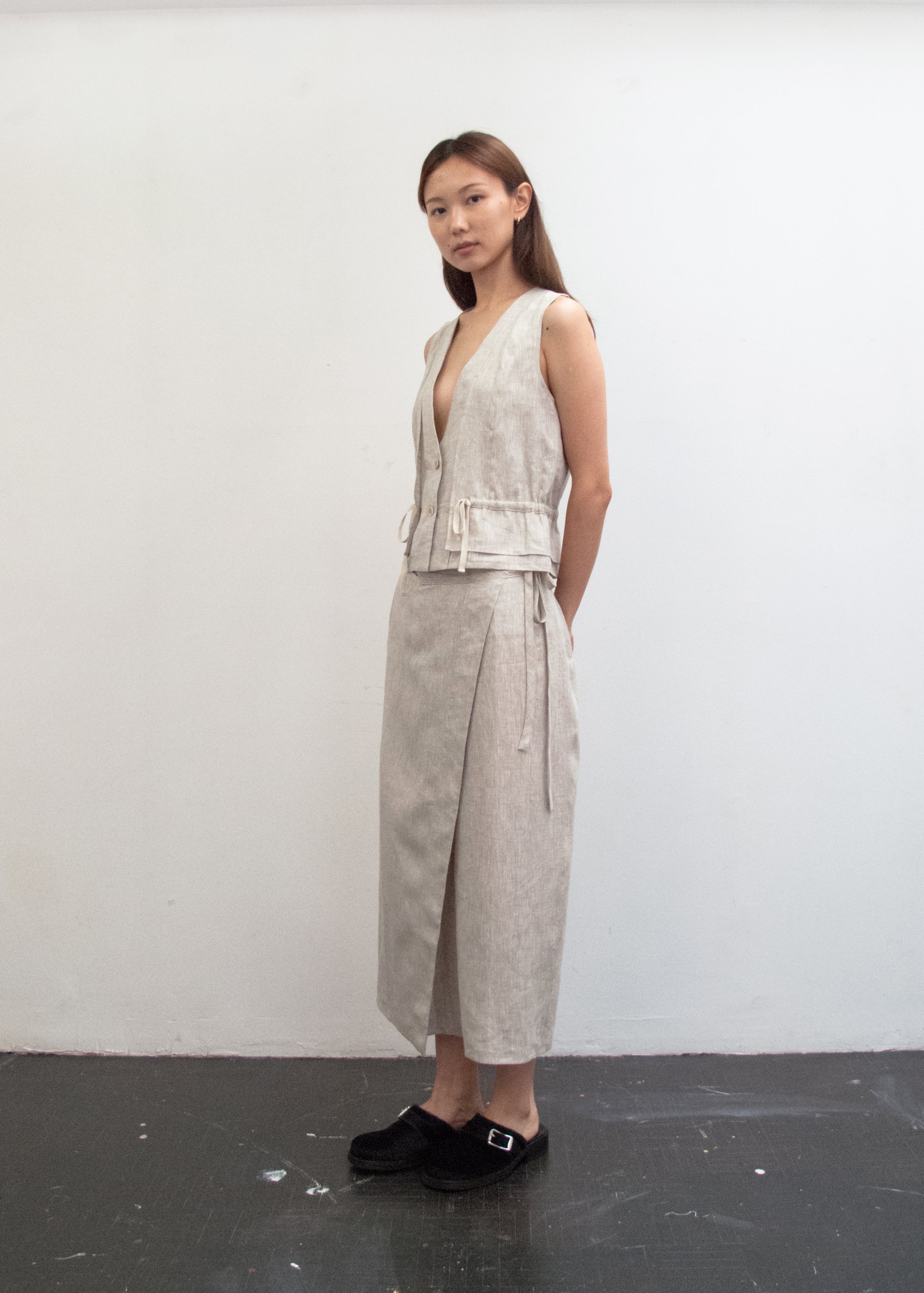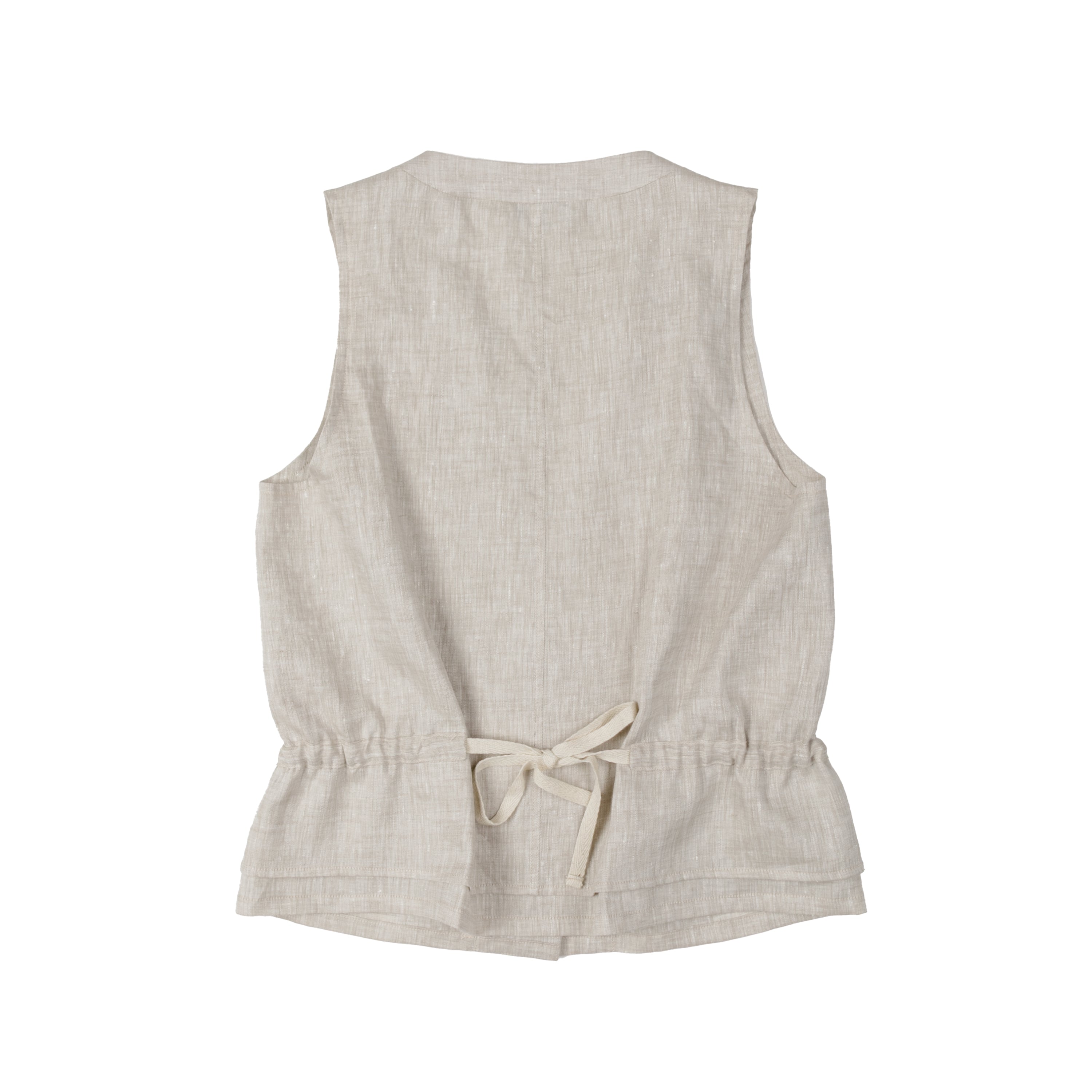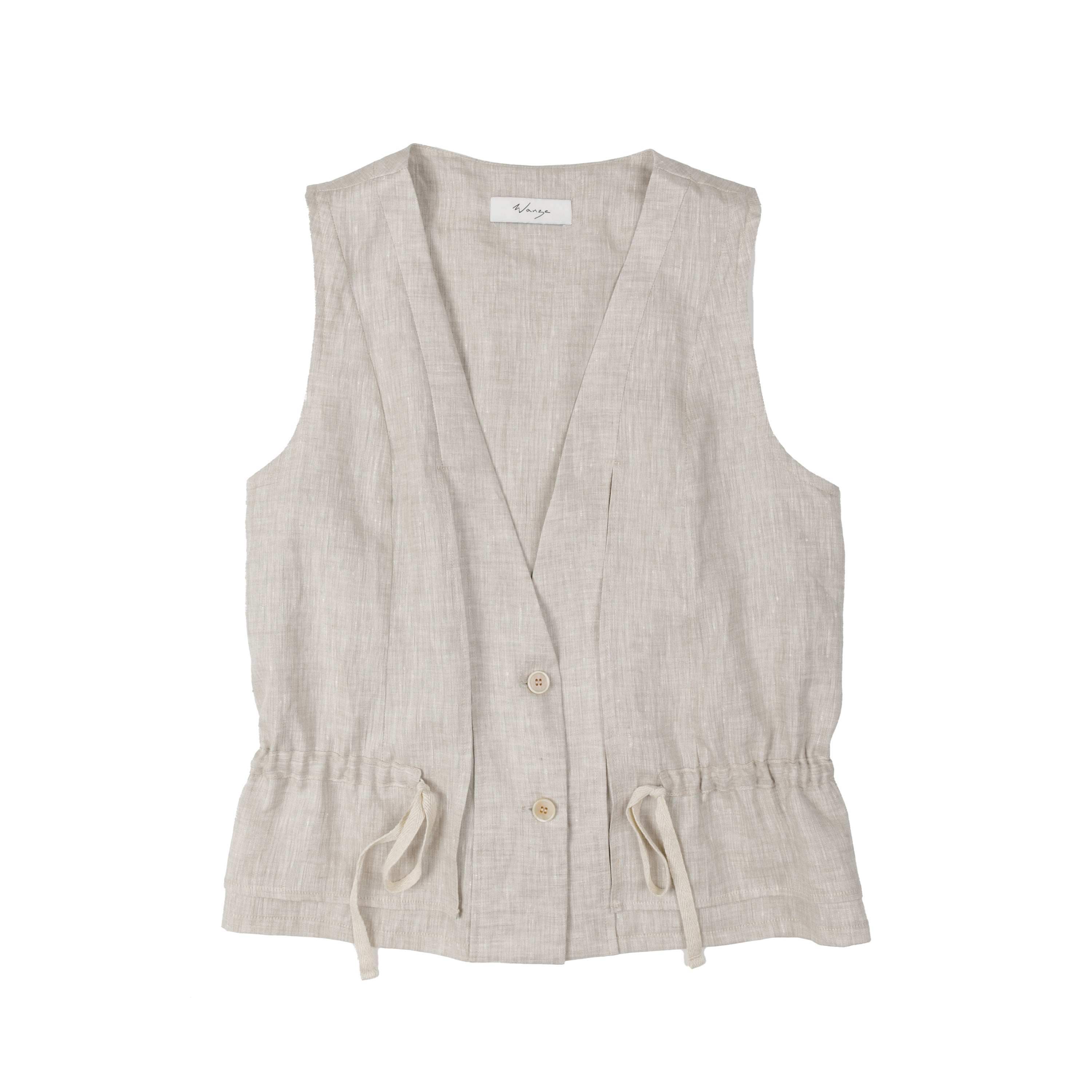 This tailored vest features a v-neck opening and a second layer that opens at the front facing. The two layers are attached with a tunnel allowing for drawstrings through both sides for a gathered effect and cinched look. Horn button closure.