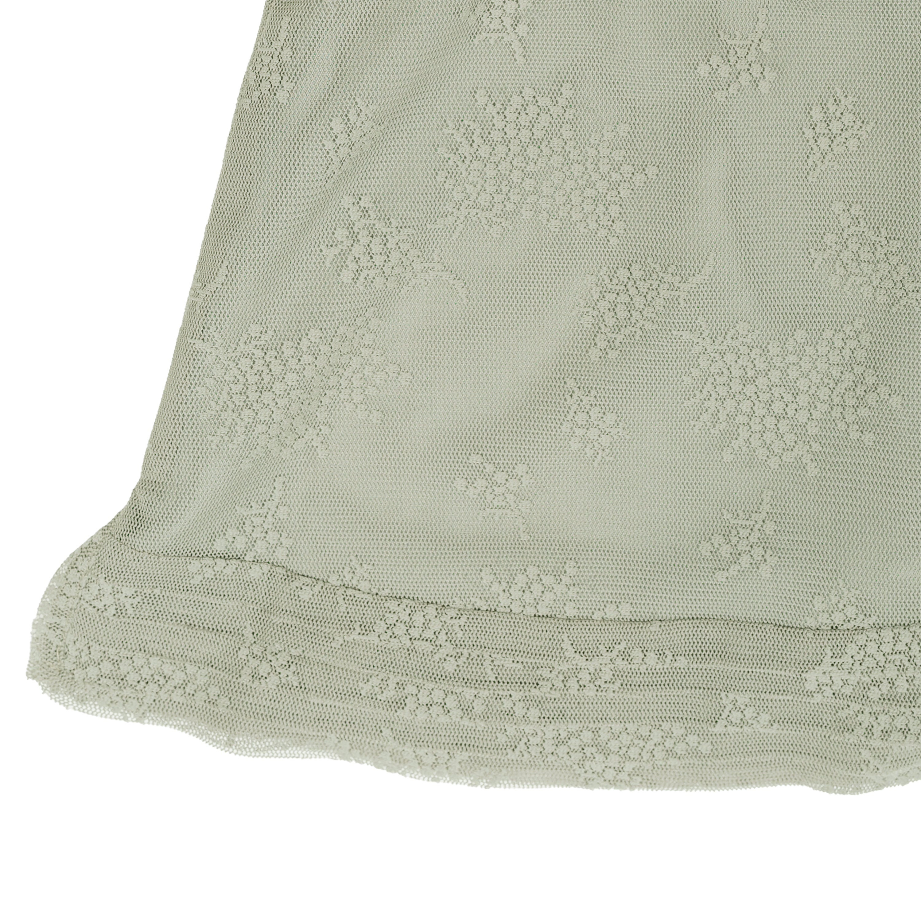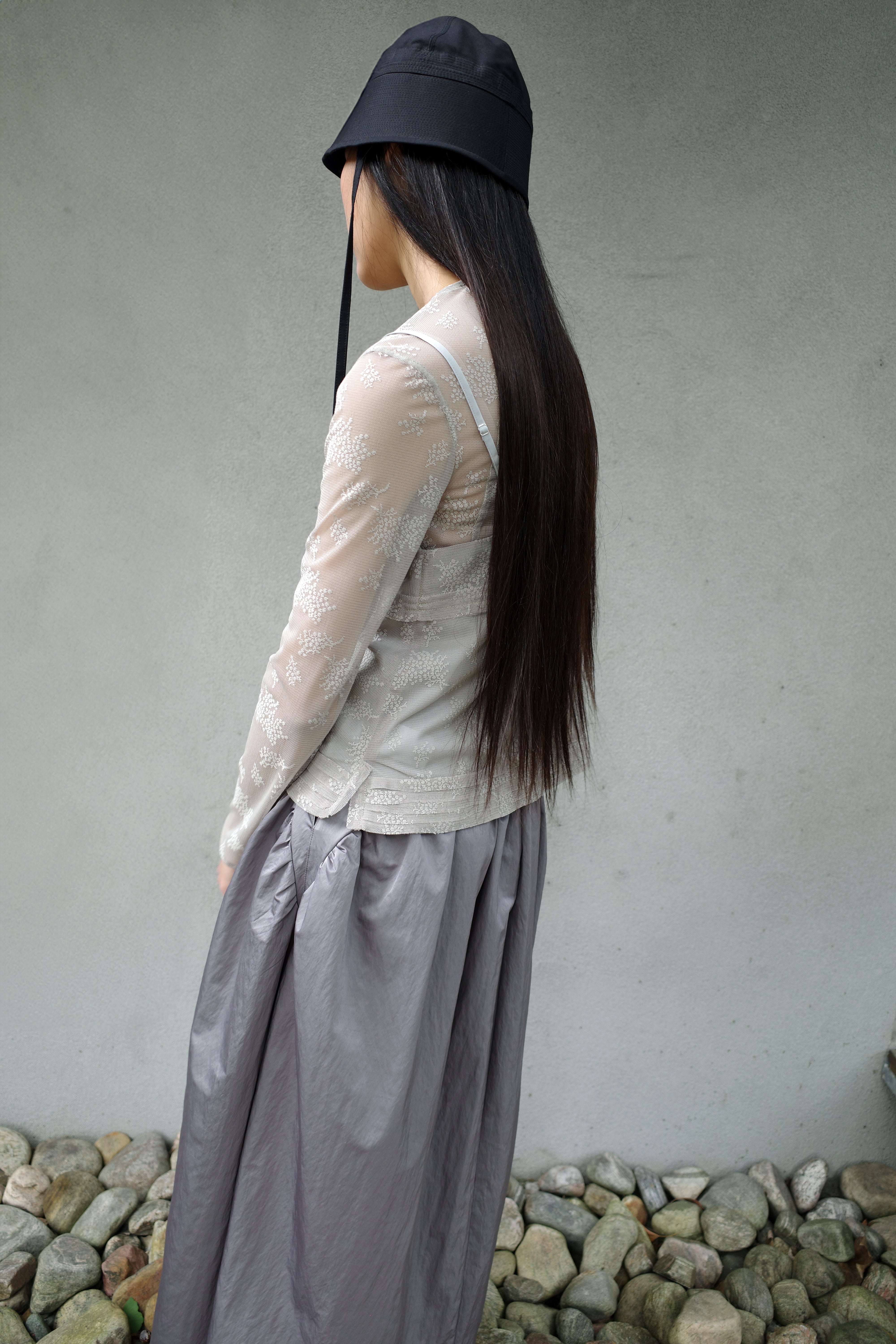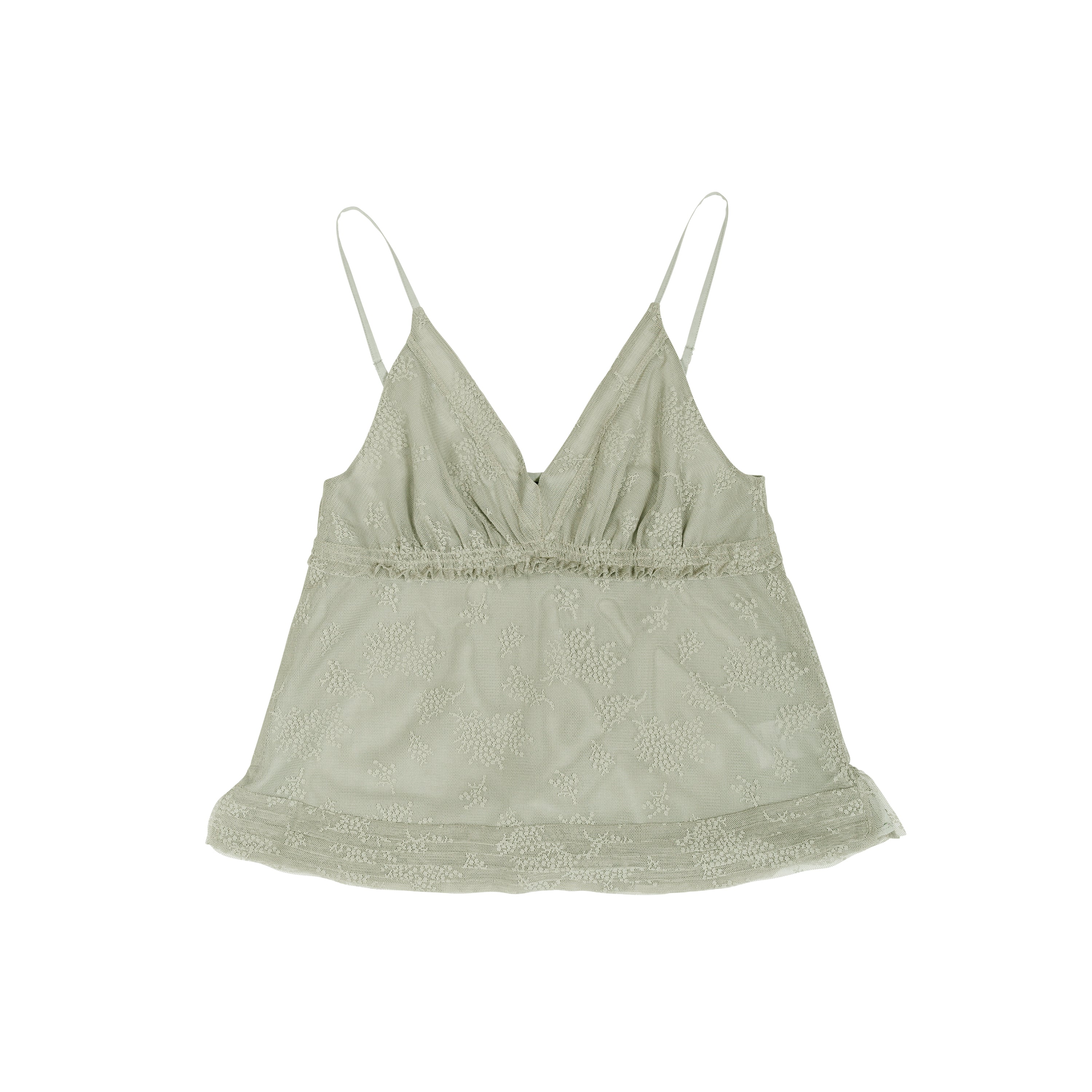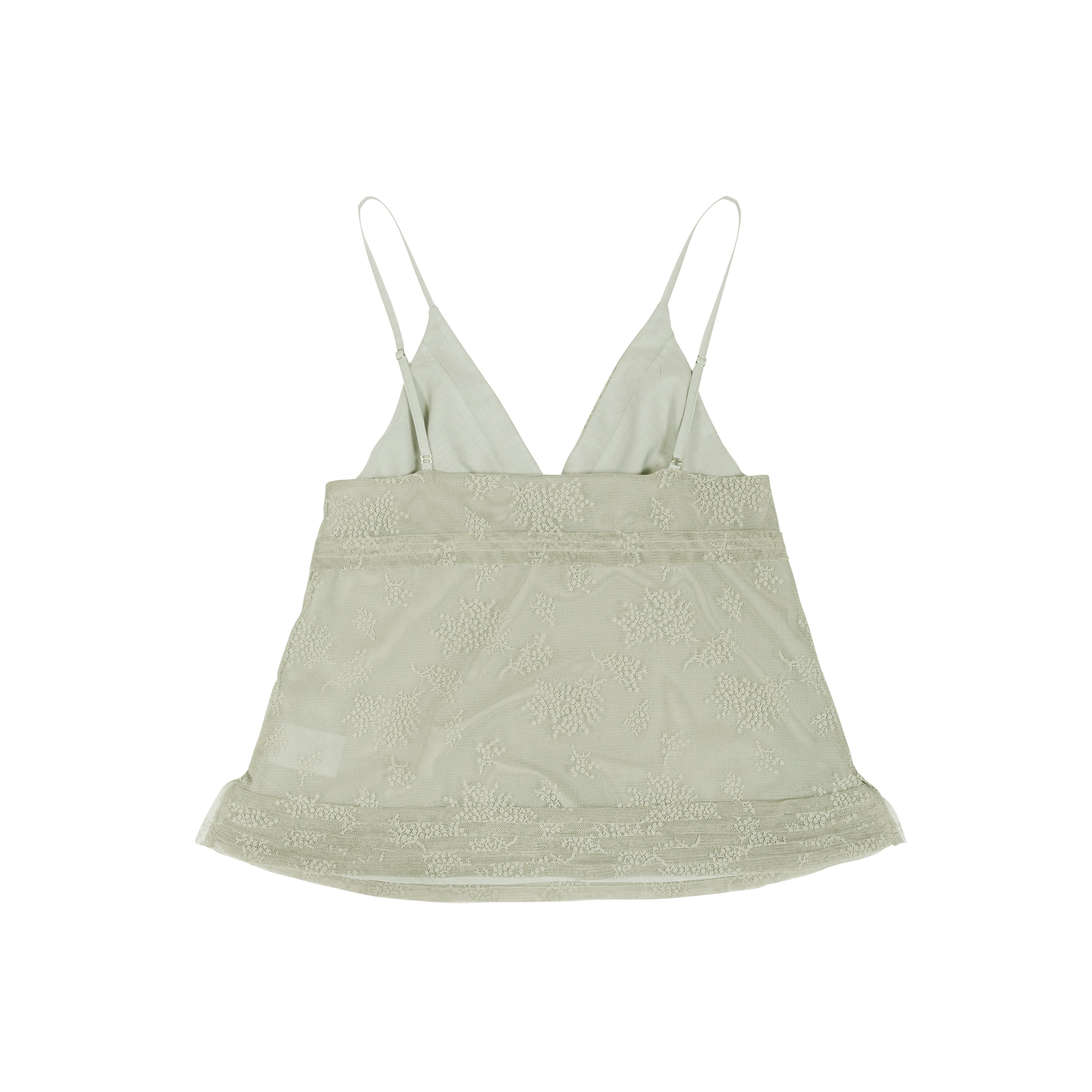 Made in a jacquard tulle and lined in a wool voile, the jade green tulle compliments the light blue voile, softening the subtle floral pattern of the jacquard. The sheerness of the tulle provides an airy feel while the lining adds coverage underneath. This camisole top is a lightweight piece with intricate details for a feminine look.