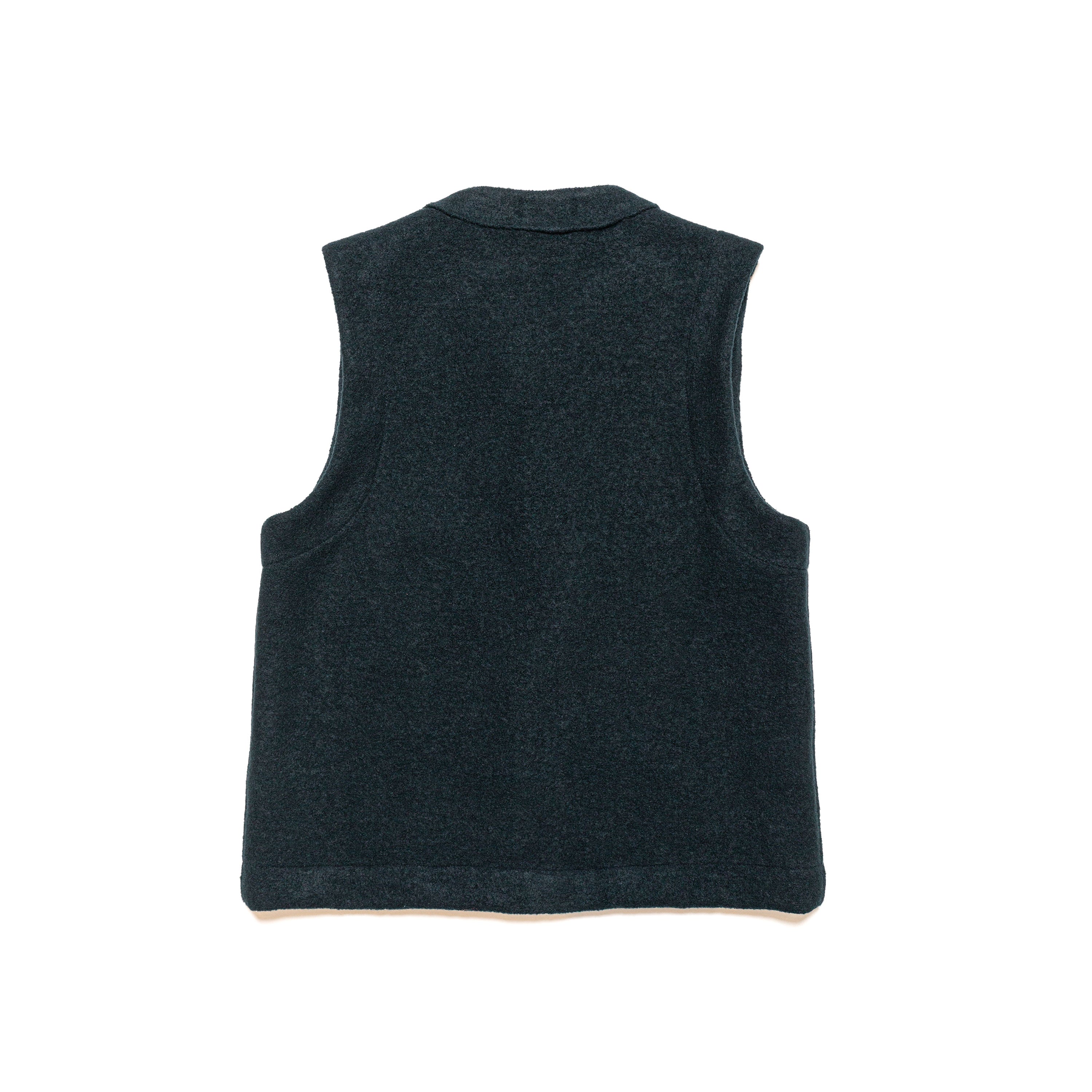 Inspired by french workwear, this vest offers a relaxed, boxy fit. The v-neck leads into a front button closure with an exterior placket. The front features open and slotted chest pocket plus side-entry hand pockets. The top left pocket is segmented into three pen pockets for a utilitarian touch.