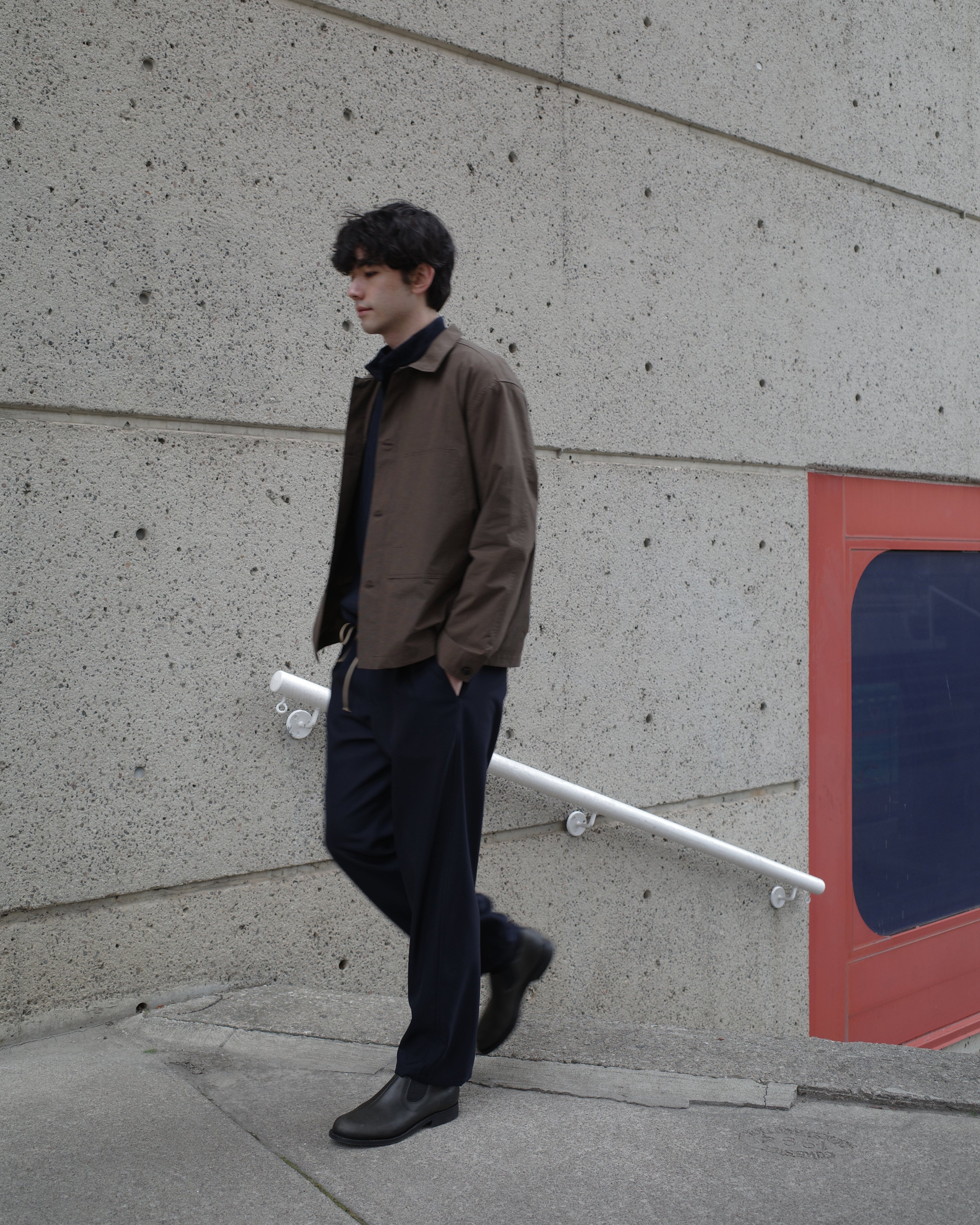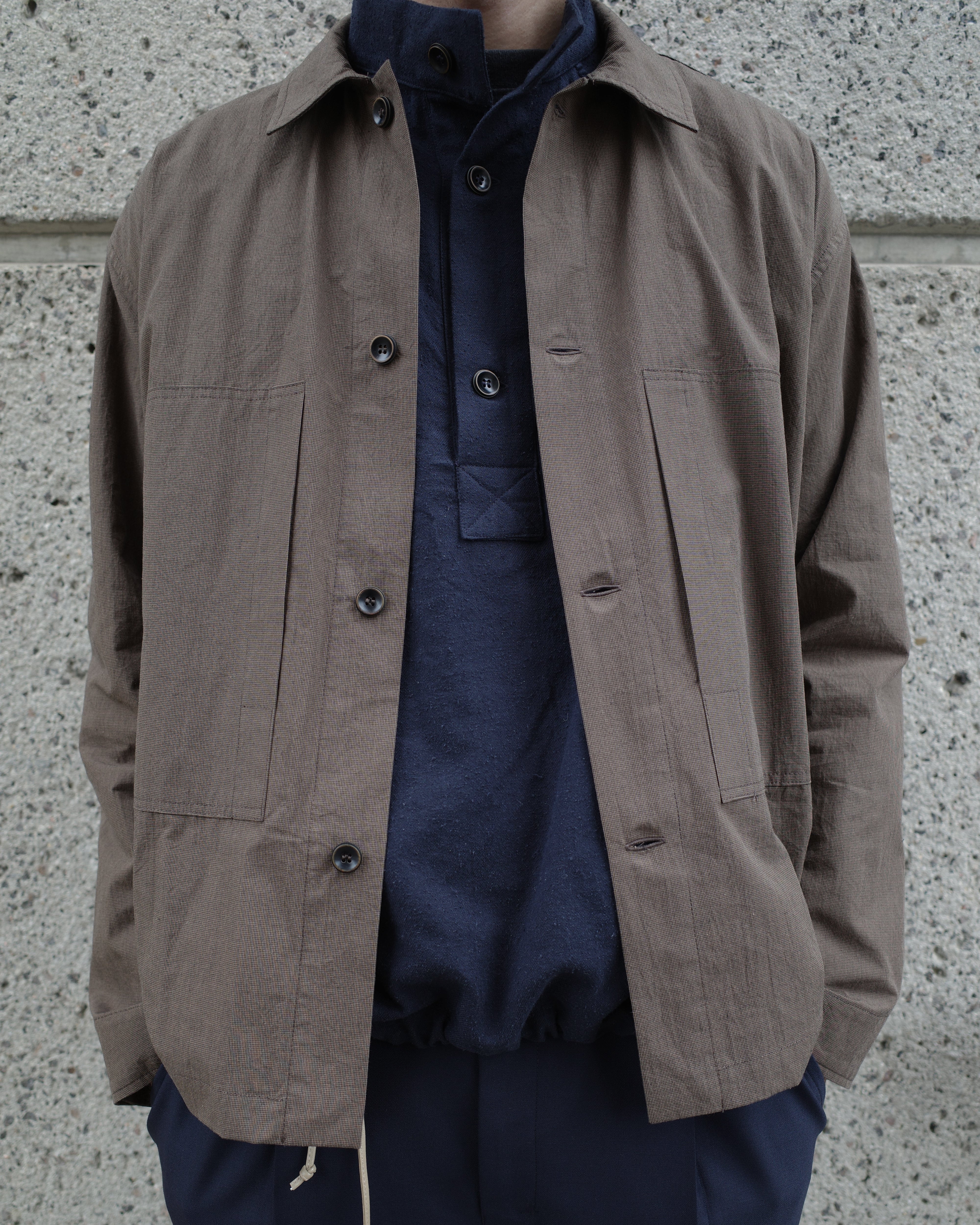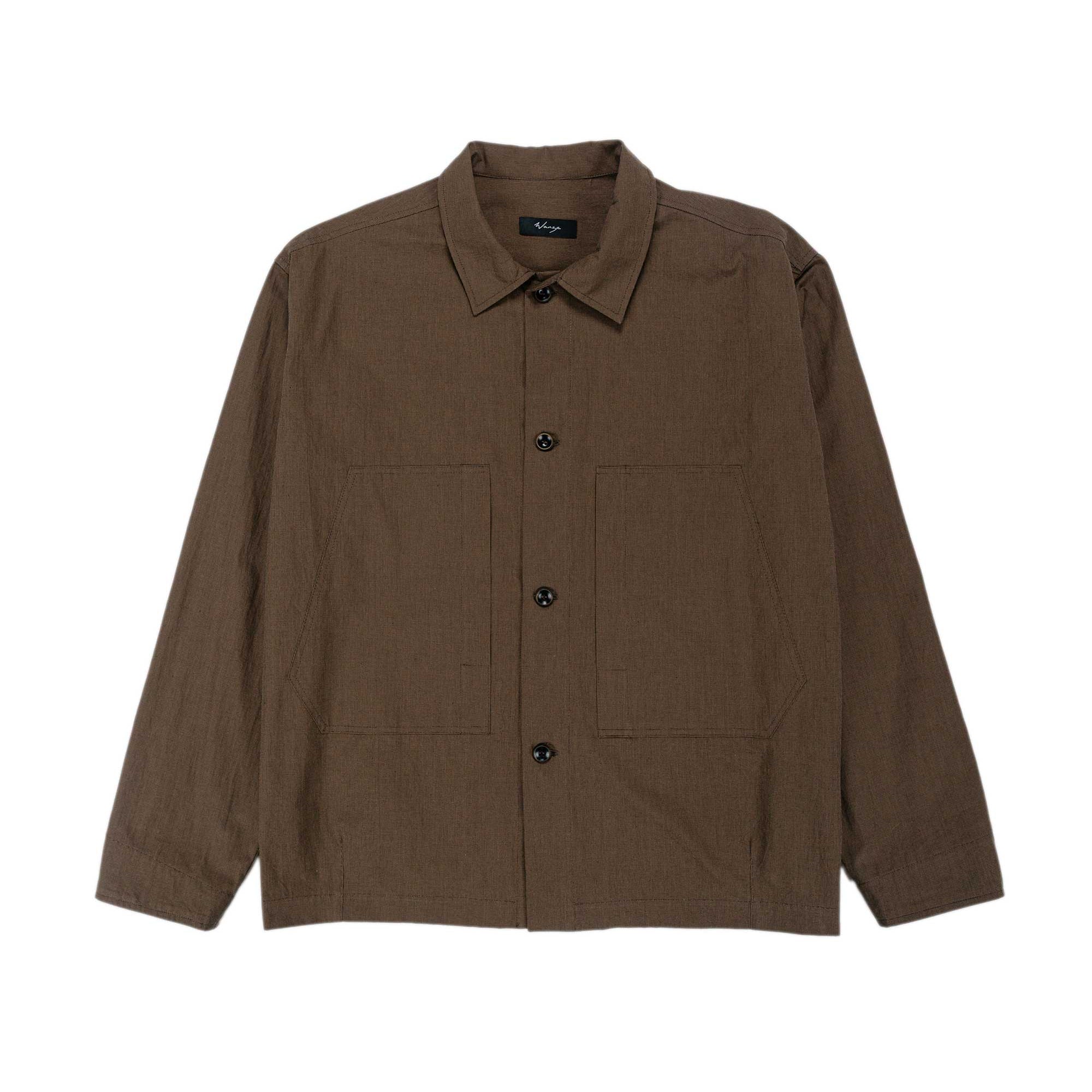 Taking inspiration from vintage Japanese workwear, this shirt features a slightly cropped and boxy fit with stylized easy-access pockets along the front. Other details include a spread collar, front placket button closure, corozo buttons, stylized buttoned cuffs, and a straight hem.